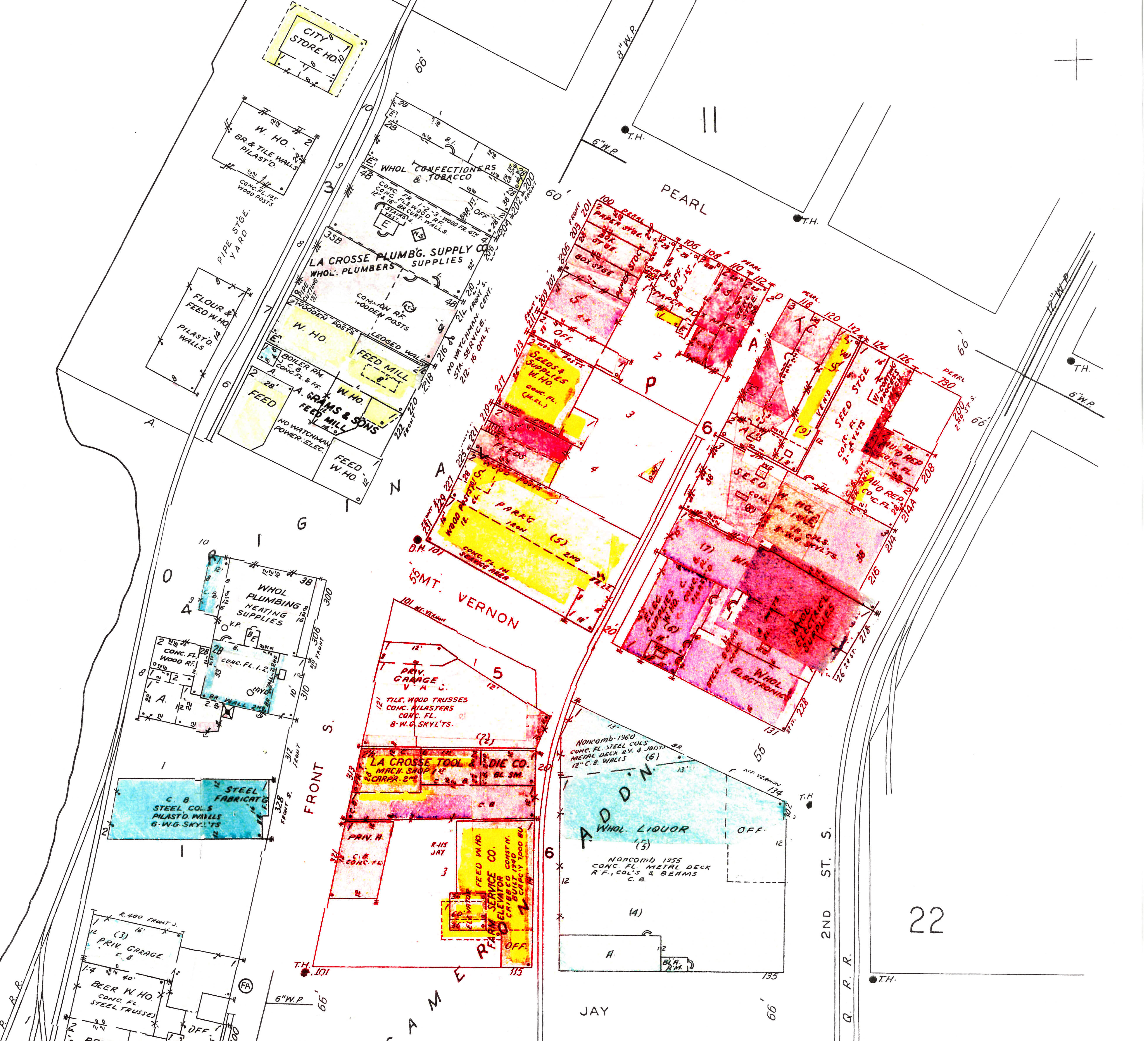 1953 Sanborn map highlighting (in red) the area now occupied by the La Crosse Center. All the buildings detailed on the map were razed as part of the Harvorview Plaza development, an urban reneal project instigated by a major flood in 1965. Mt. Vernon Street, which connected to the original wagon bridge over the Mississippi River, was vacated as part of Harborview Plaza plans. Click image for closer view.