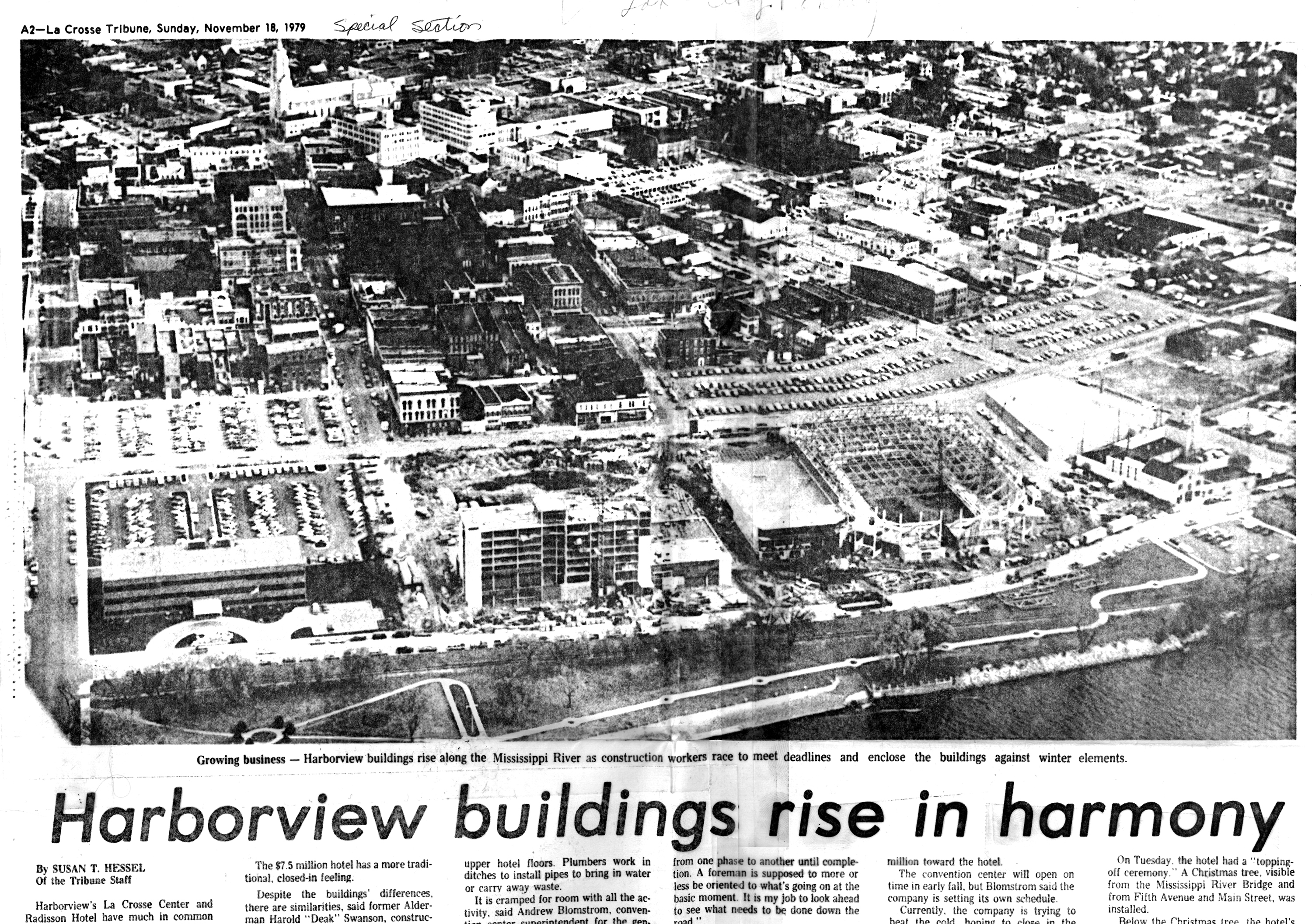 La Crosse Tribune 18 Nov 1979 highlighting, from left: 100 Harborview Plaza office building, Radisson Hotel, and the La Crosse Center. Click image for closer view.