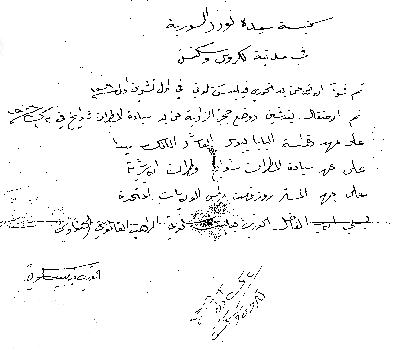 Copy of manuscript in Arabic placed in the cornerstone of Our Lady of Lourdes on October 1, 1906, courtesy of Diocesan Archives, Diocese of La Crosse. Click image for bigger view and see above for English transcript.