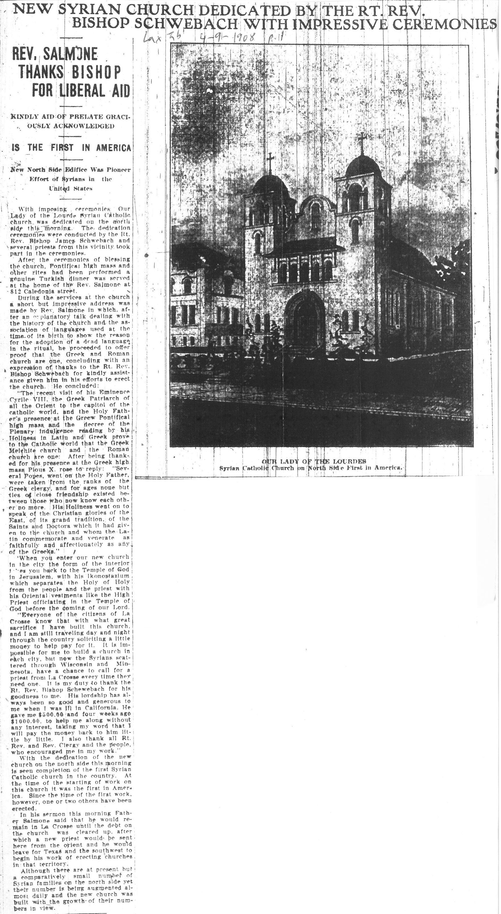 The Rt. Rev. Philip Salmone, who had previously served as Grand Vicar of the archbishop of Baalbek, Lebanon and was in the country serving as Missionary apostolic-at-large to the Greek and Syrian Catholics of the United States, was chosen to serve as the first, and what would be only, head of Our Lady of Lourdes parish. He was in his mid-20s and according to primary sources, spoke fluent English, French, Greek, Latin and Arabic, which would have been an obvious strength for serving a growing, diverse immigrant community in La Crosse. His greater mission, however, continued to be to visit Syrians and Greeks all over the country and encourage them to organize parishes and build churches. This would eventually lead to the downfall of Our Lady of Lourdes.