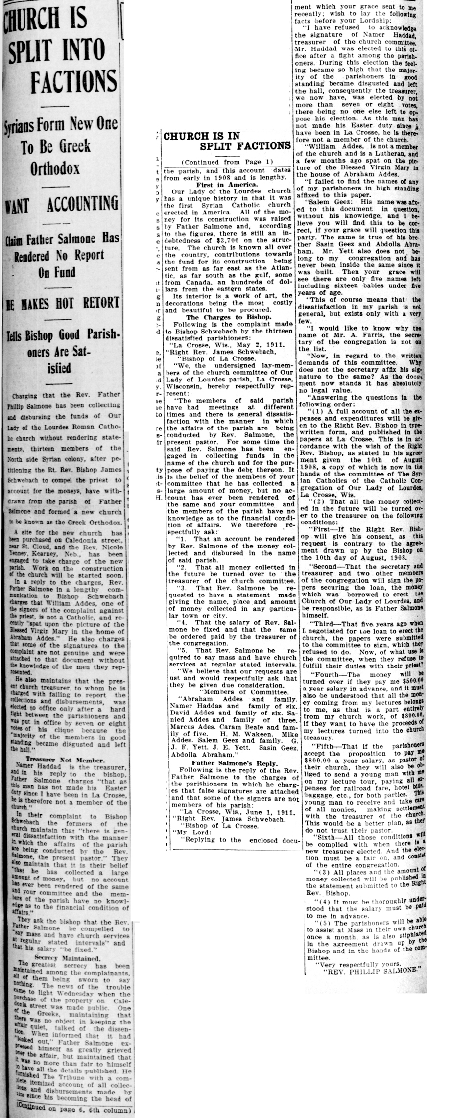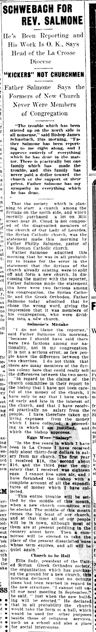 La Crosse Tribune 10 August 1911; Click image for full article, including Rev. Salmone’s response to the accusations