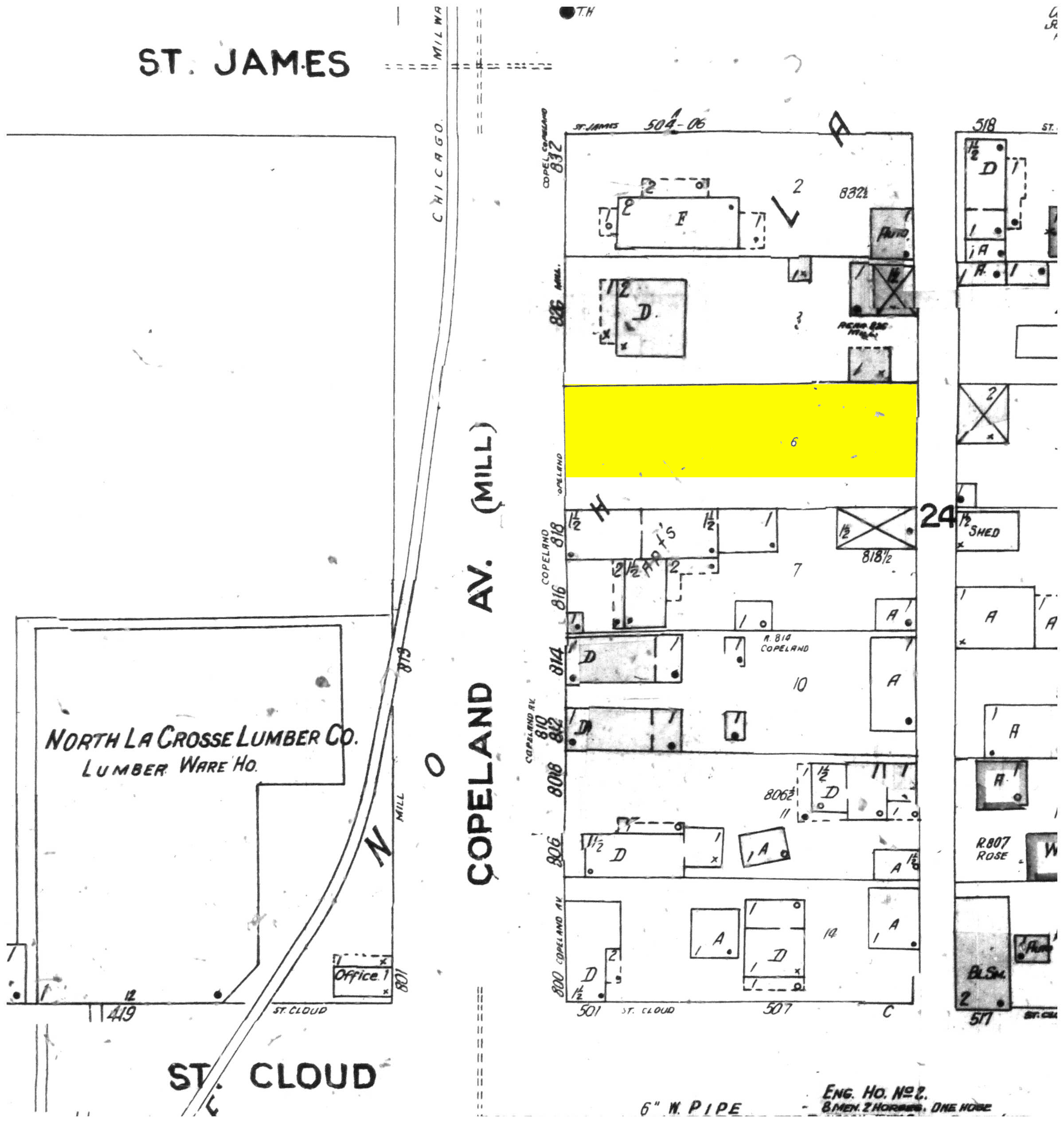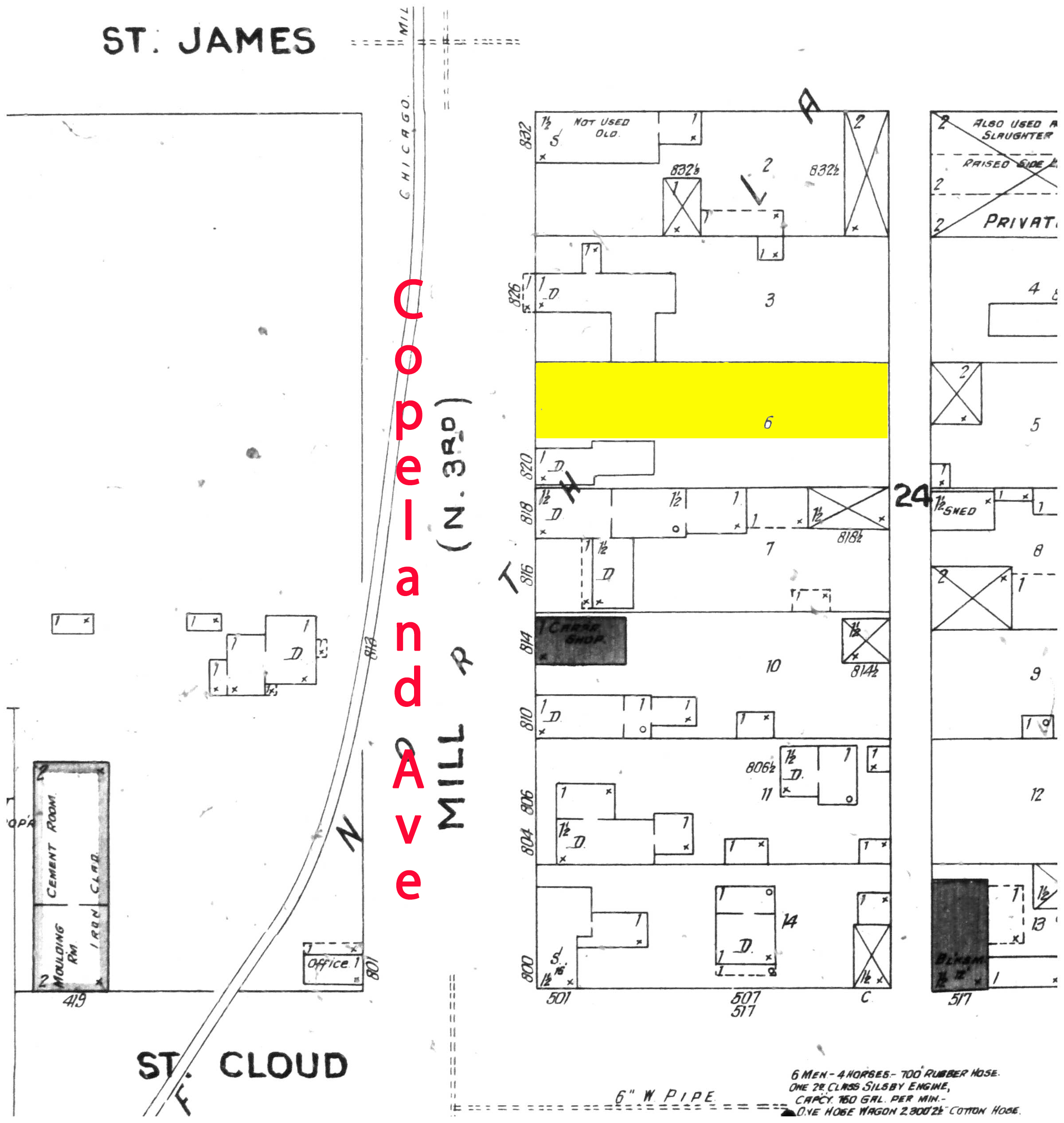1906 Sanborn fire insurance map - highlighted area is 822 Mill St. (Copeland Ave.), future site of Our Lady of Lourdes; click image for larger view