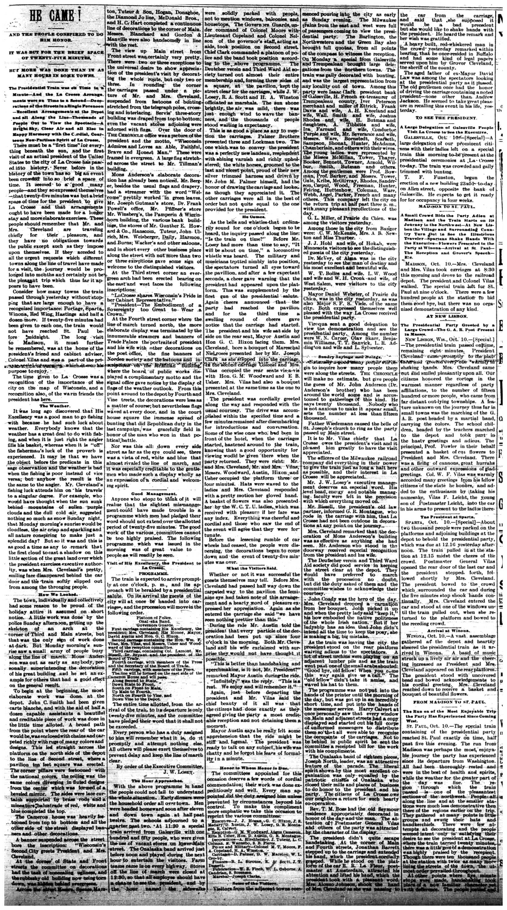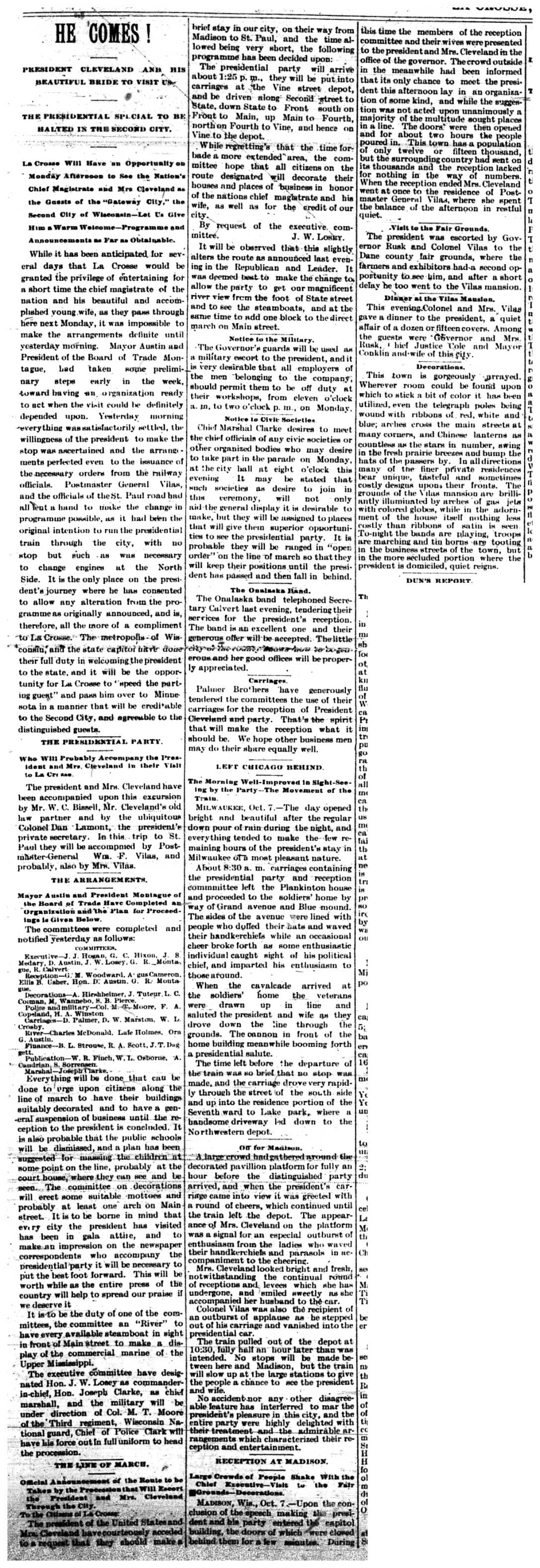 The short stop in La Crosse was roughly halfway through the trip, following stops in Pittsburgh, Indianapolis, St. Louis (an extended stay), Chicago, Milwaukee, and Madison. President Cleveland spent the weekend of October 7-9 in Madison at the home of his Postmaster General, William F. Vilas, who had previously been a law professor at the University of Wisconsin.