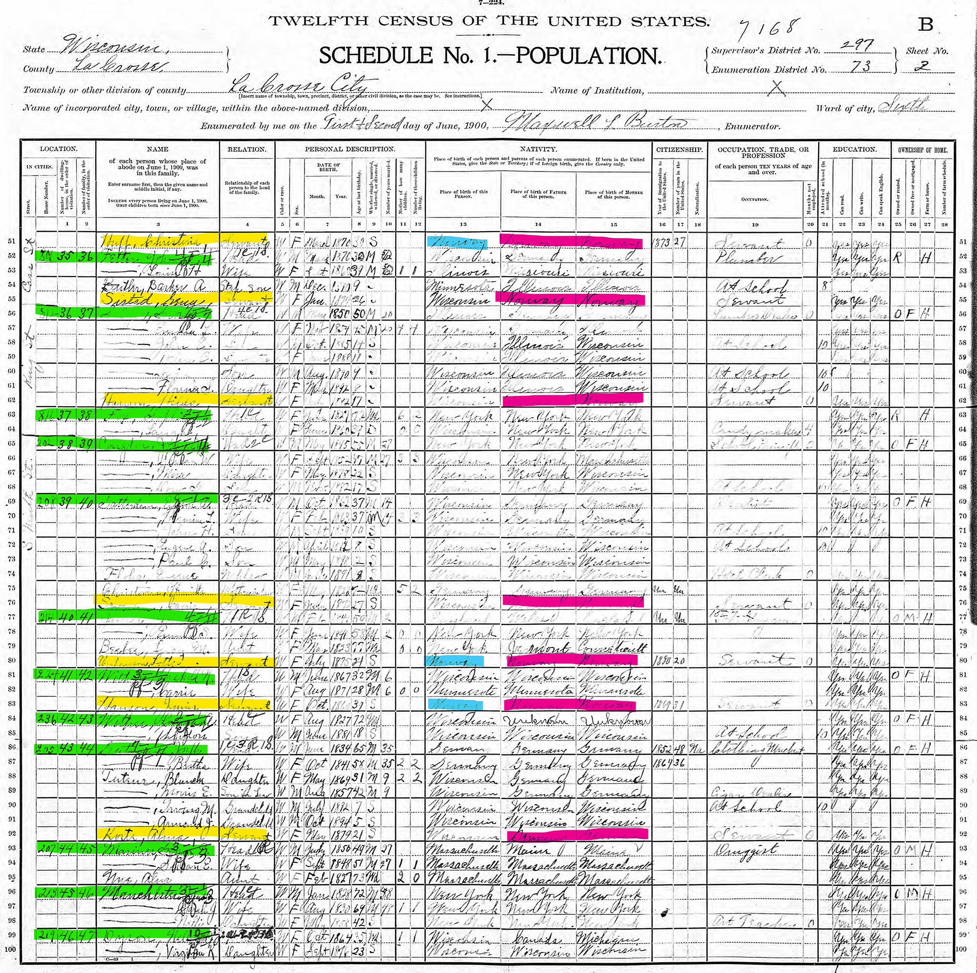 In the late 1800s, large numbers of European immigrants arrived in the United States, and a lot of immigrant women entered the domestic workforce. In La Crosse, many young, single, Norwegian immigrants worked in domestic service. Census records for wealthy areas in La Crosse, such as the Cass-King residential district, give us insight into domestic workers during this period. The image below shows the 1900 U.S. Federal Census, and documents residents living on Cass, King, and South 9th streets in La Crosse. Households are highlighted in green, and girls listed as ‘servants’ are highlighted in yellow. Over half of the households in this area employed a servant in their home. The blue highlights show domestic workers that were born outside of the United States, and the pink highlights indicate servants with parents who were immigrants. This image shows that 100% of the women working as servants in this area were, at most, first-generation Americans. Almost half were immigrants themselves.