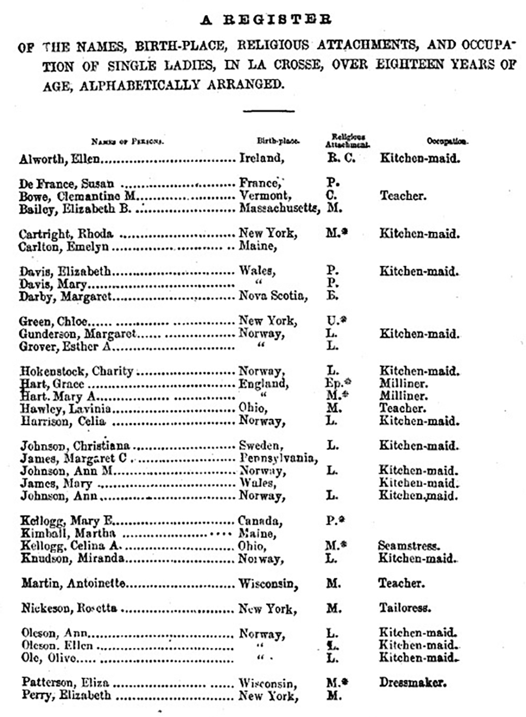 La Crosse city directories and census records tell us a lot about domestic work in the late 19th-century, but what about the mid-1800s? La Crosse was well-established by the 1850s, and by this time, single women were already employed in domestic service. In 1854, Rev. Spencer Carr, a Baptist pastor in La Crosse, published A Brief Sketch of La Crosse, Wisc’n. In this booklet, Carr explains the history of La Crosse and what life was like for residents in the 1850s. A Brief Sketch was likely meant to encourage outsiders to move to the city and the end of the sketch provides a list of the eligible bachelors and bachelorettes in the growing city. The image below page 27 of Carr's booklet, showing a register of the “single ladies in La Crosse.” Notice the birthplaces for the women, and the predominance of “kitchen-maid” as an occupation.