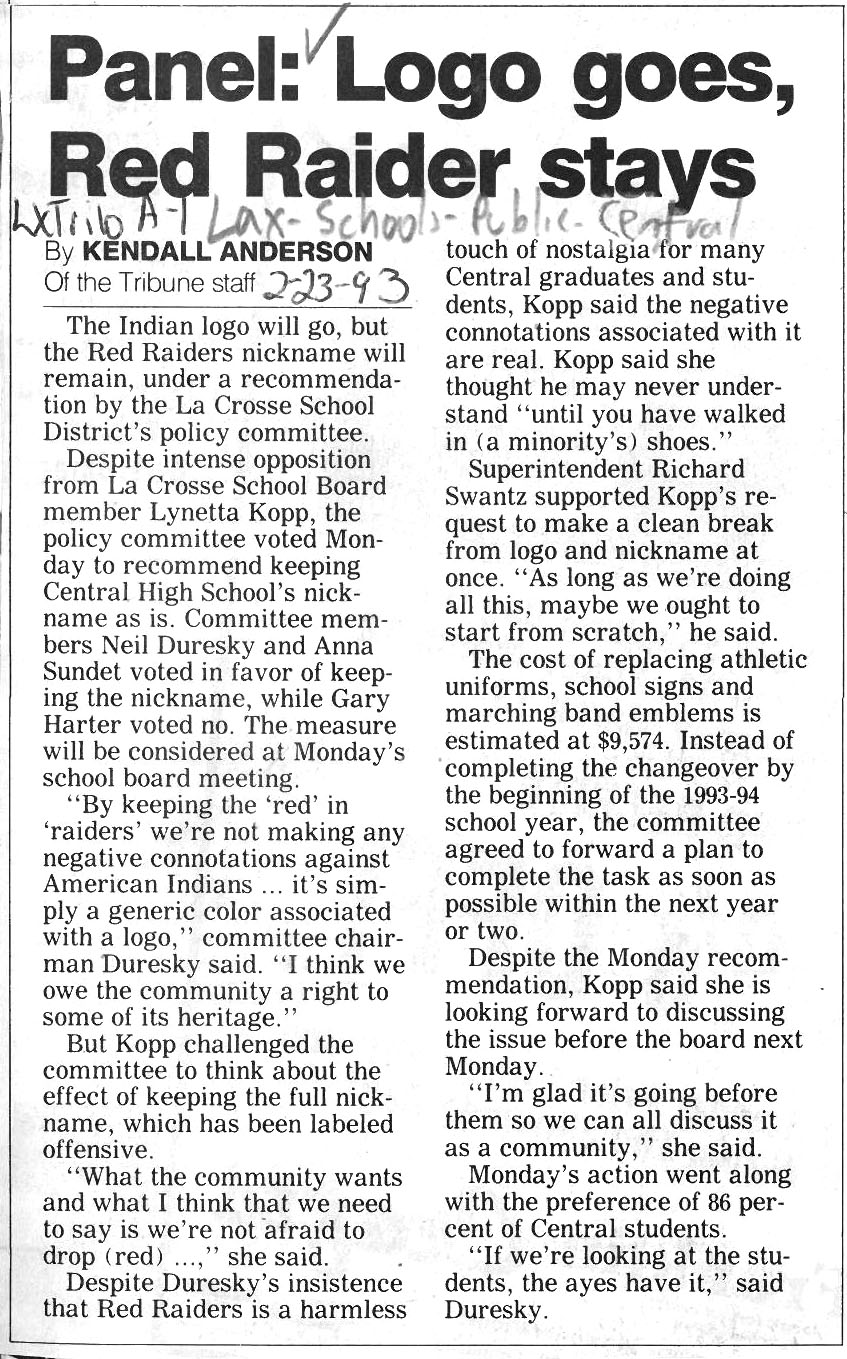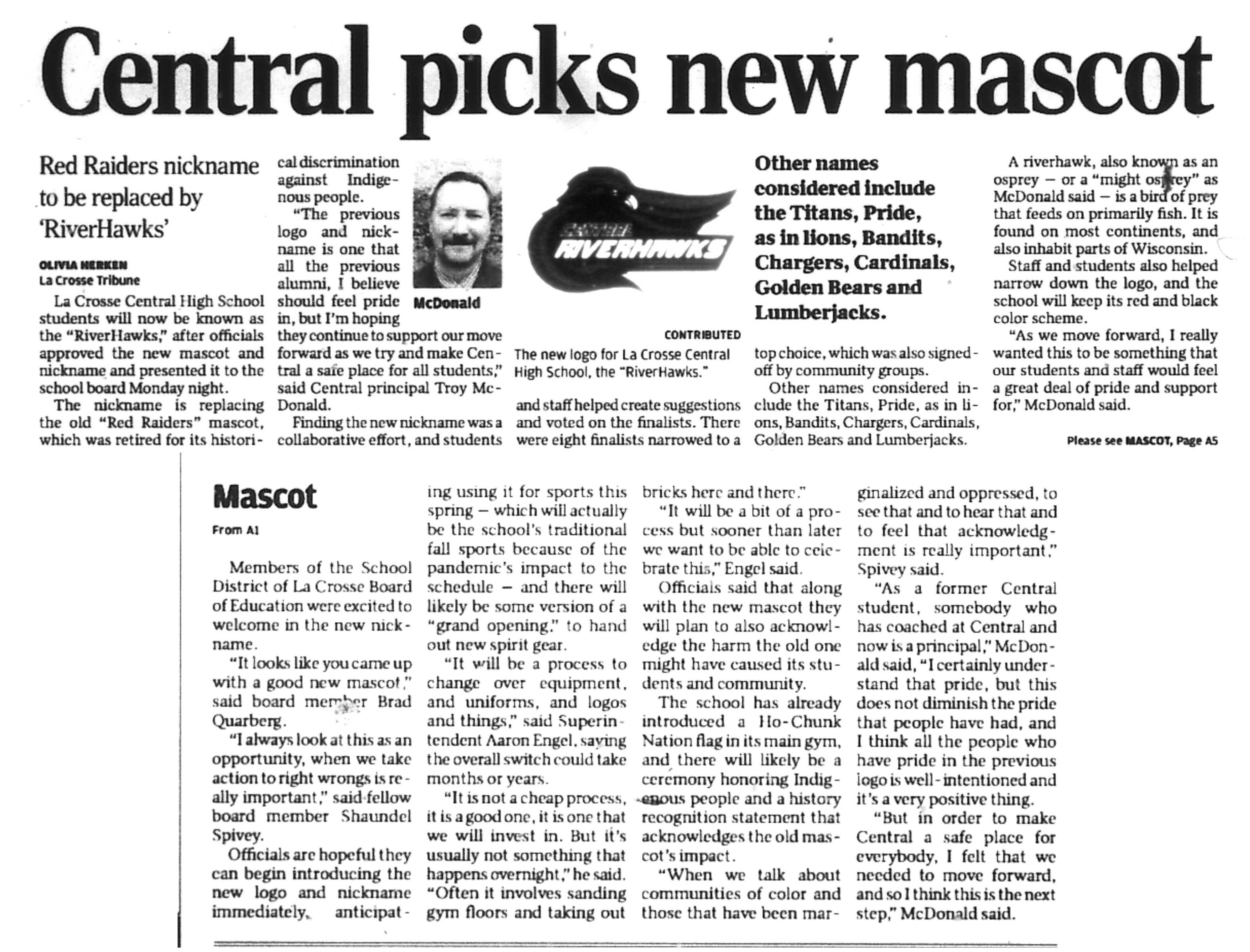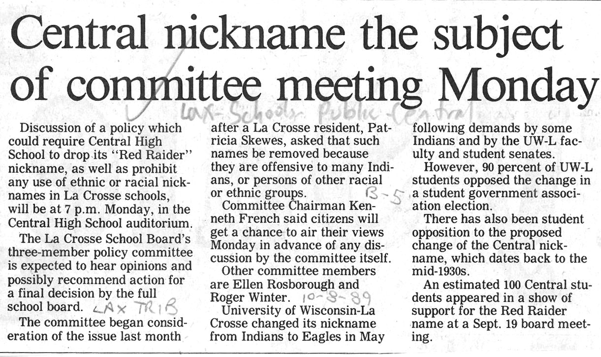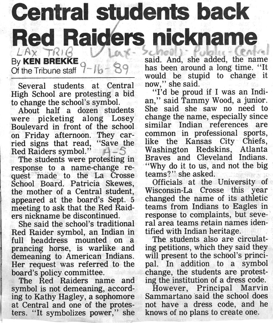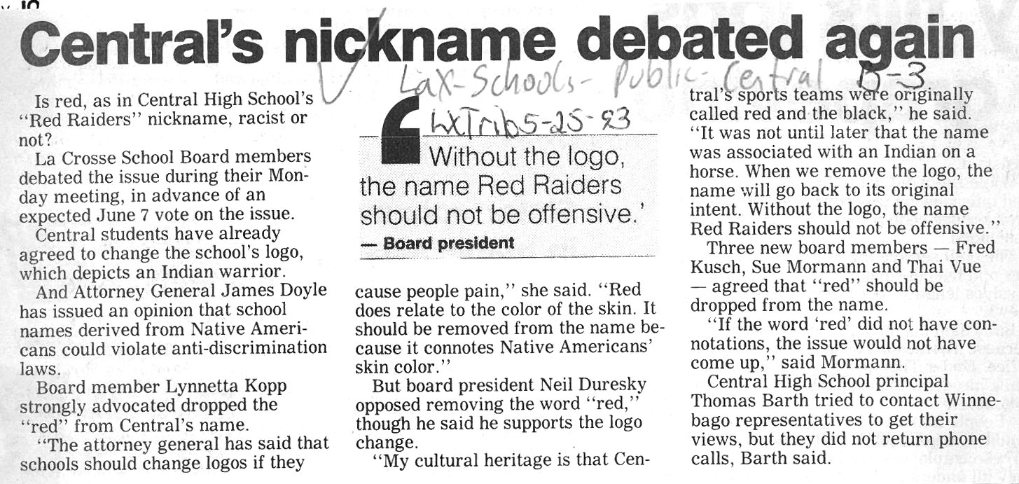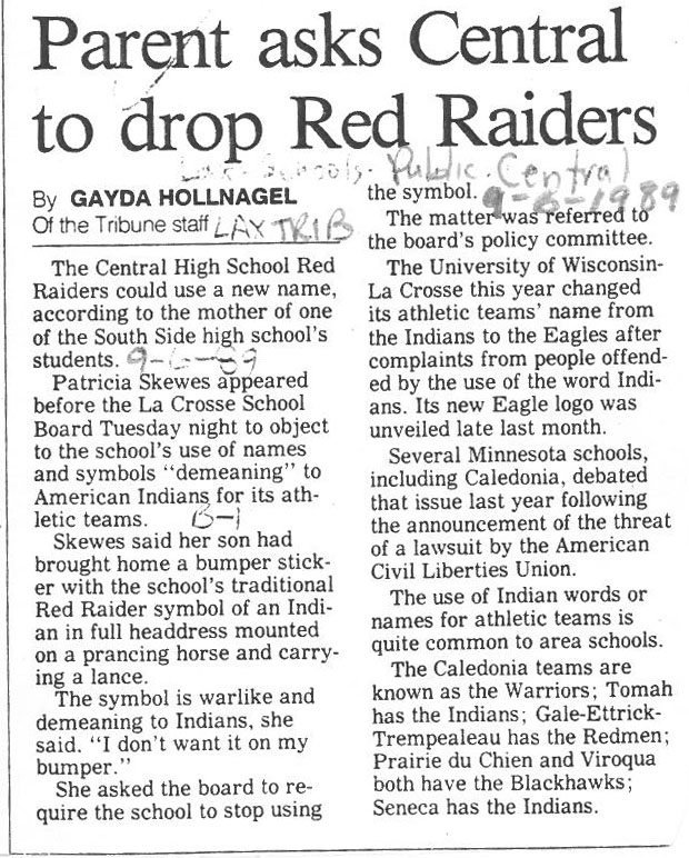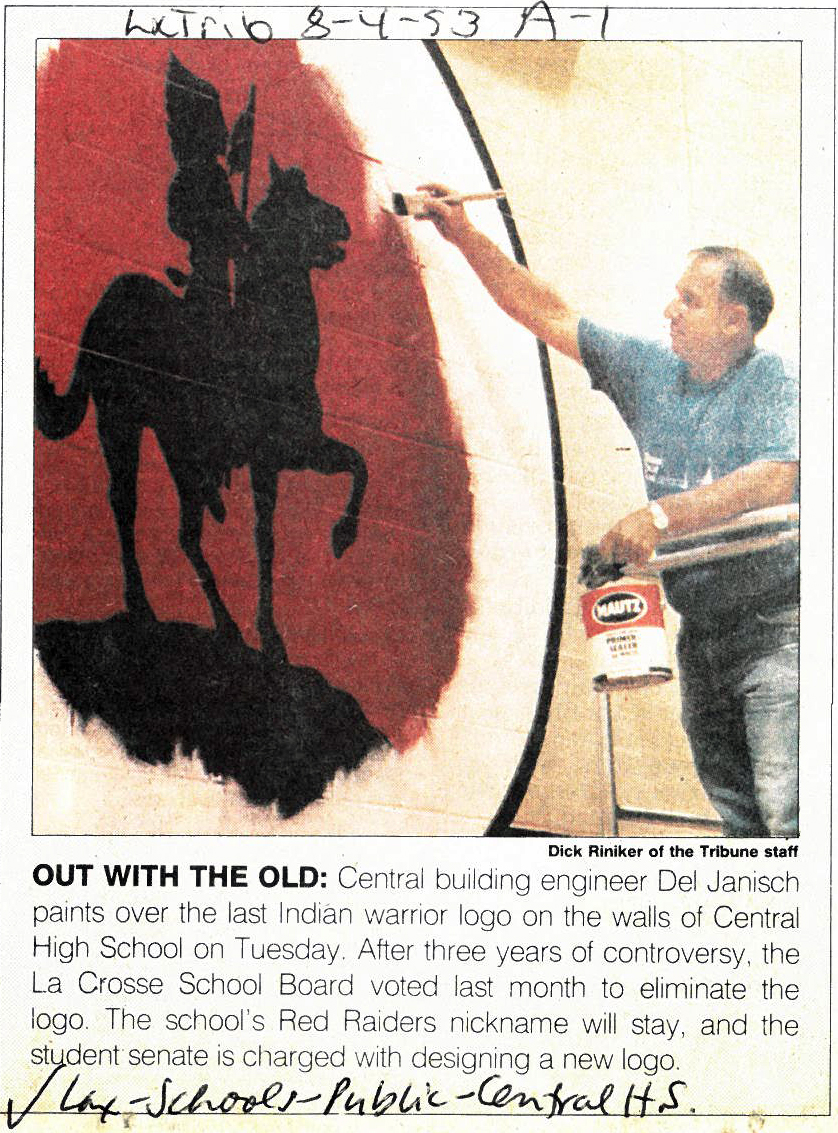 Central High School's longtime athletic teams logo and mascot - the Red Raiders - began being questioned as cultural appropriation in the late 1980s. Various levels of discussion and consideration of change happened into the early 1990s. In 1993, a firm decision to change the logo but to keep the name held until 2021, when the name was changed to RiverHawks.