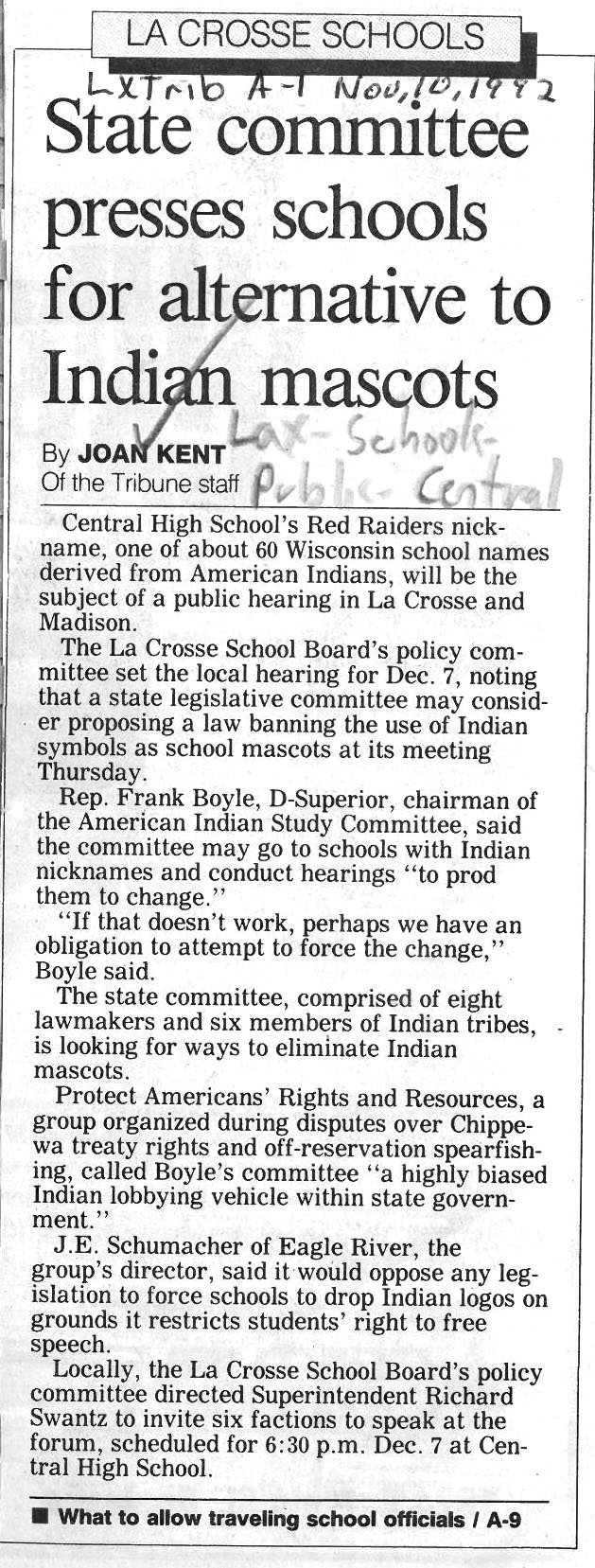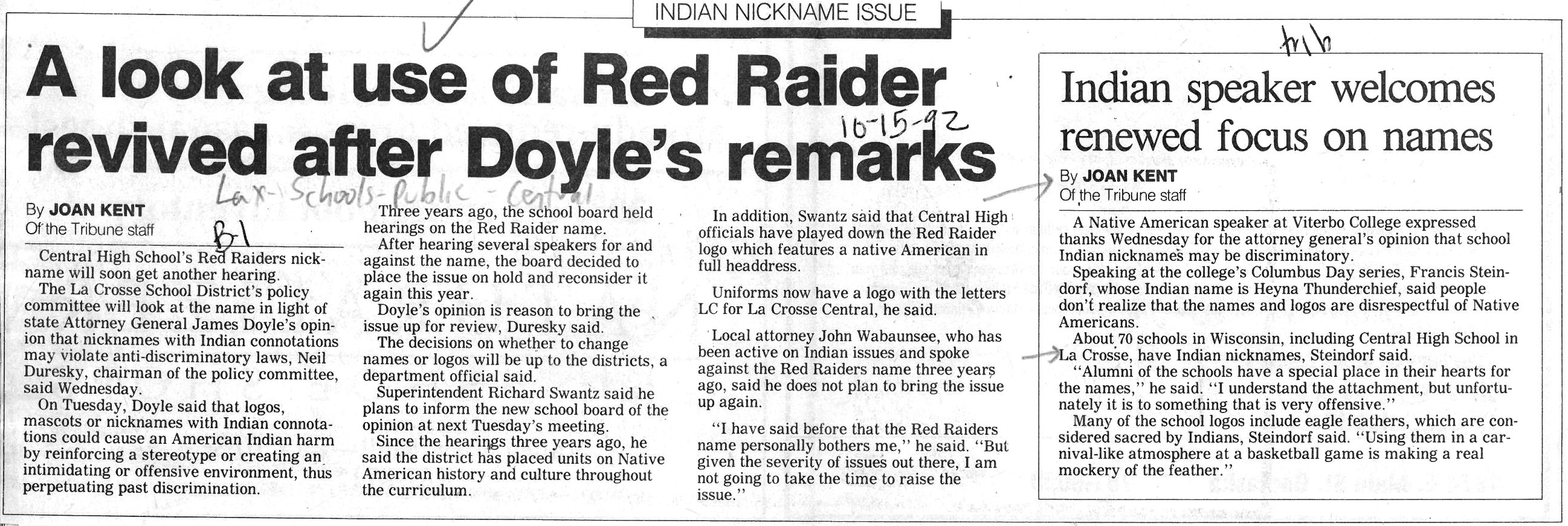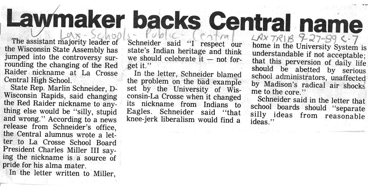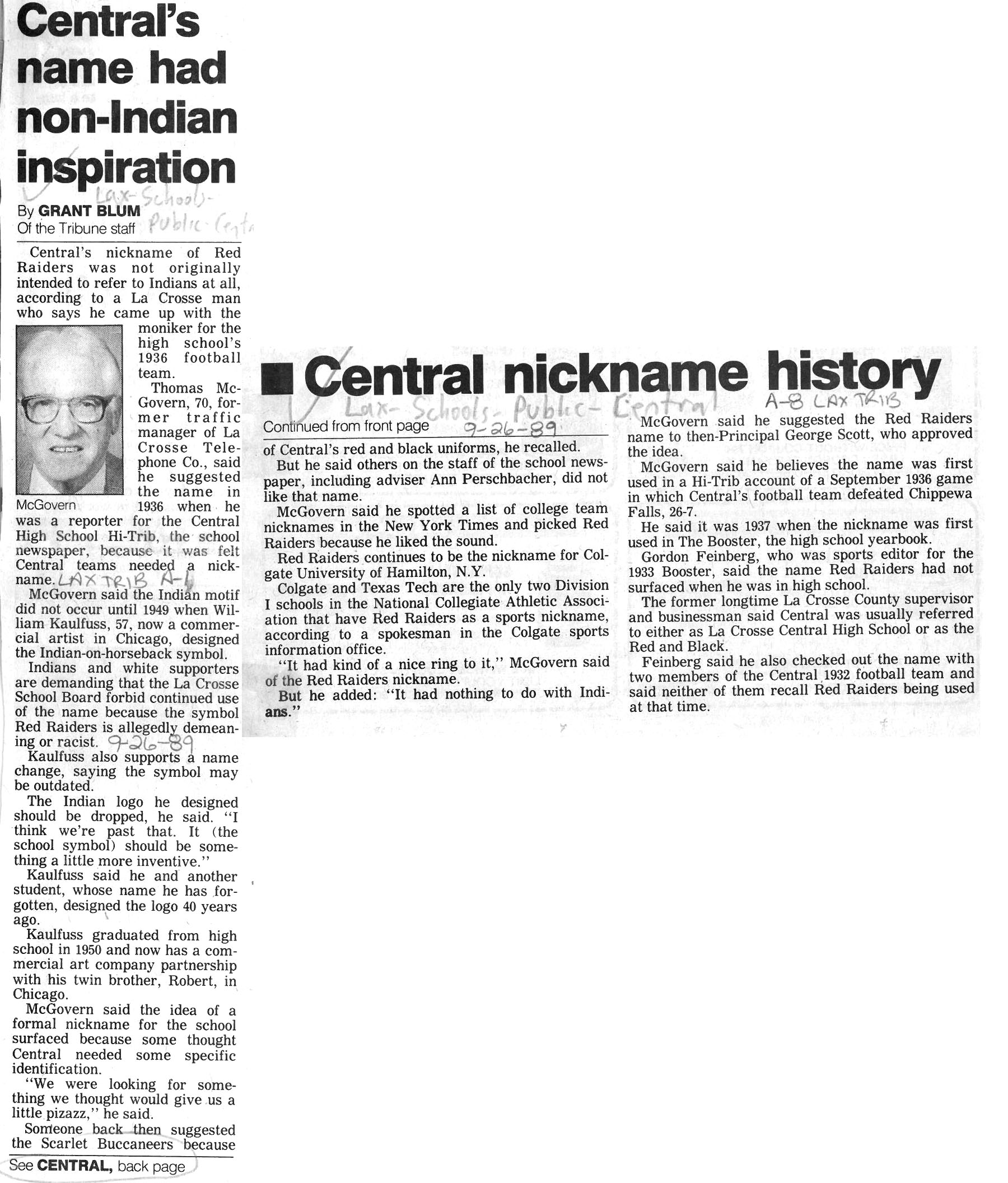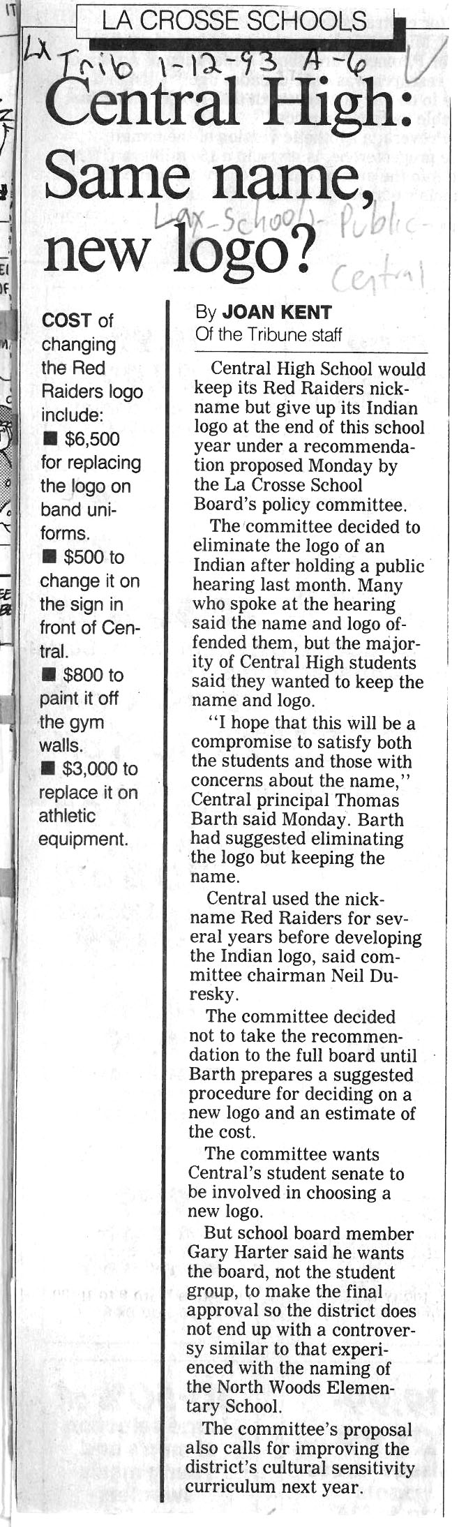 Central High School's longtime athletic teams logo and mascot - the Red Raiders - began being questioned as cultural appropriation in the late 1980s. Various levels of discussion and consideration of change happened into the early 1990s. In 1993, a firm decision to change the logo but to keep the name held until 2021, when the name was changed to RiverHawks.