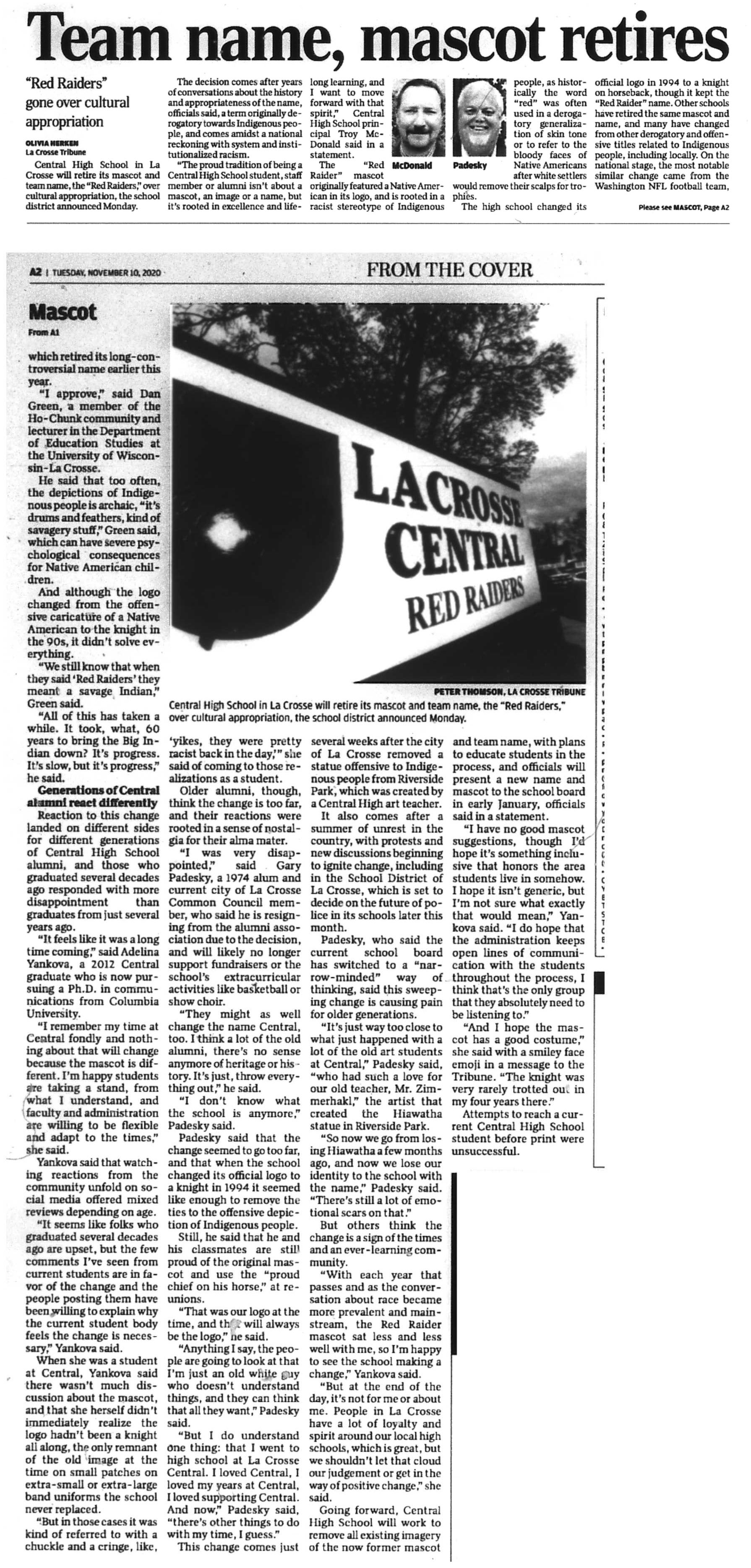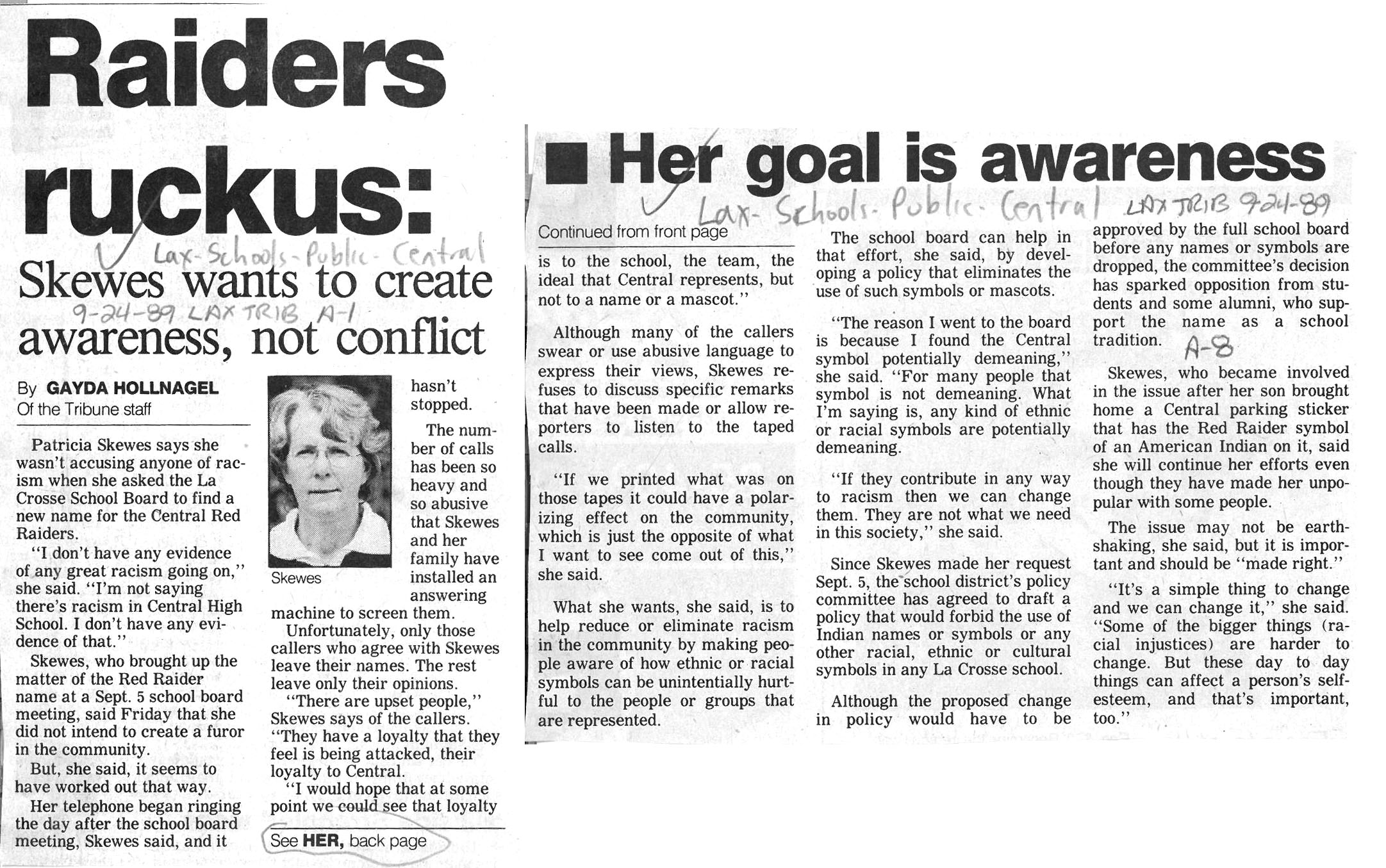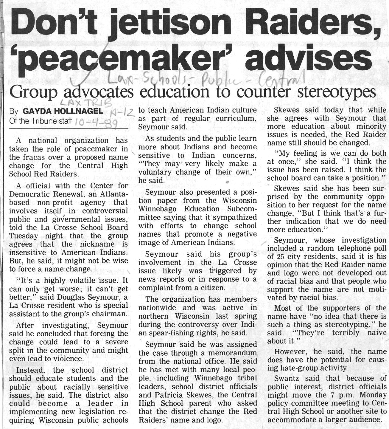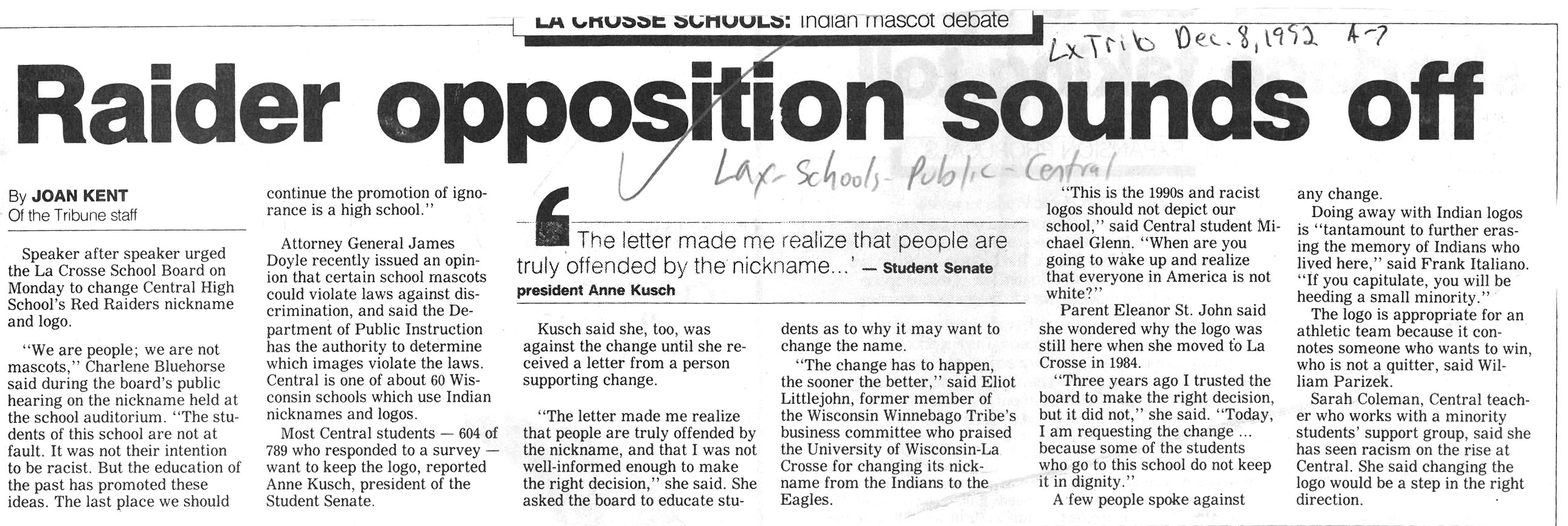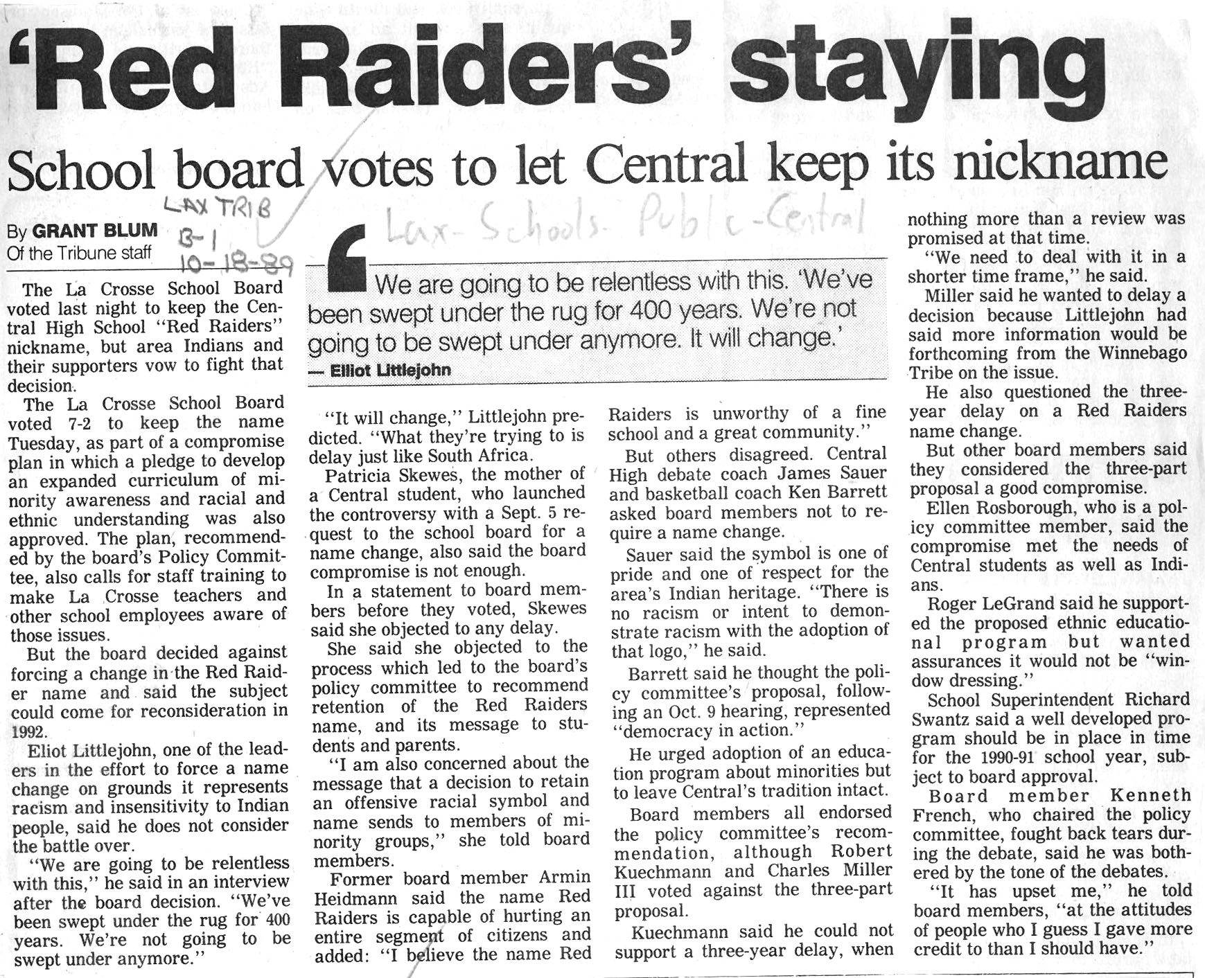 Central High School's longtime athletic teams logo and mascot - the Red Raiders - began being questioned as cultural appropriation in the late 1980s. Various levels of discussion and consideration of change happened into the early 1990s. In 1993, a firm decision to change the logo but to keep the name held until 2021, when the name was changed to RiverHawks.