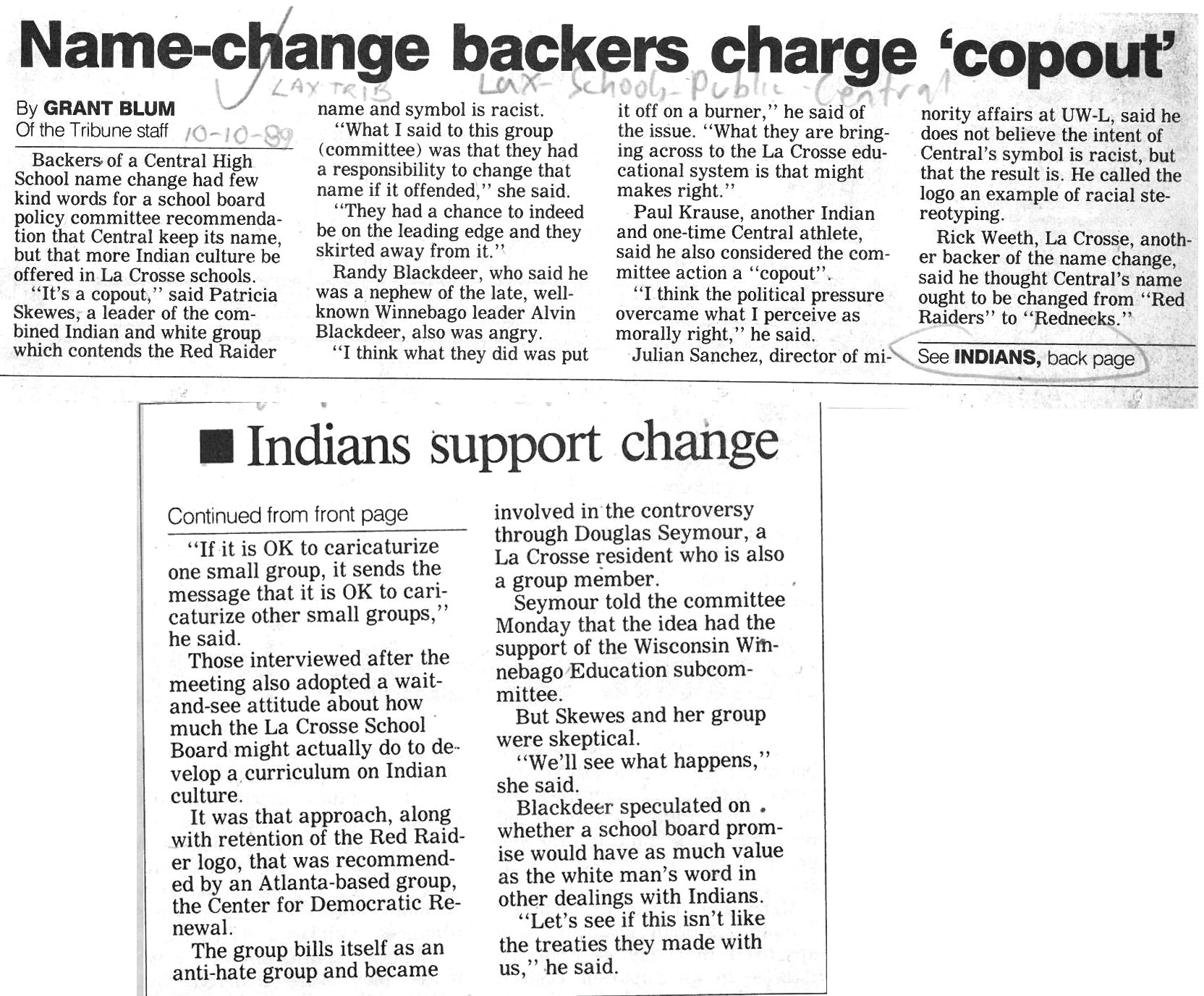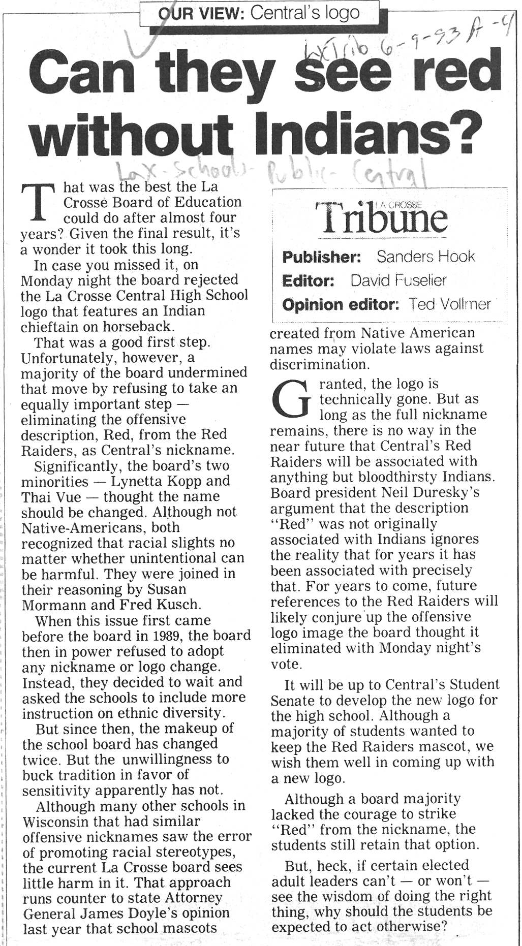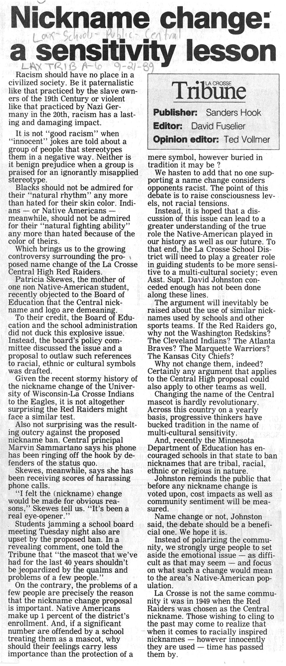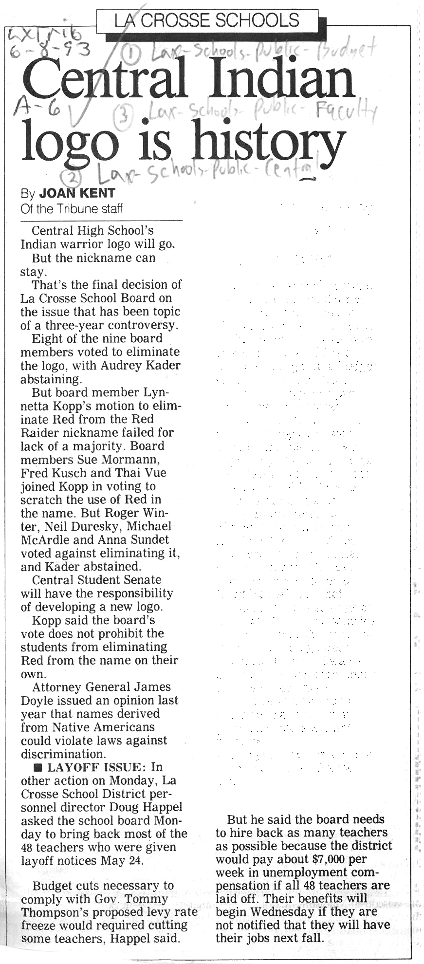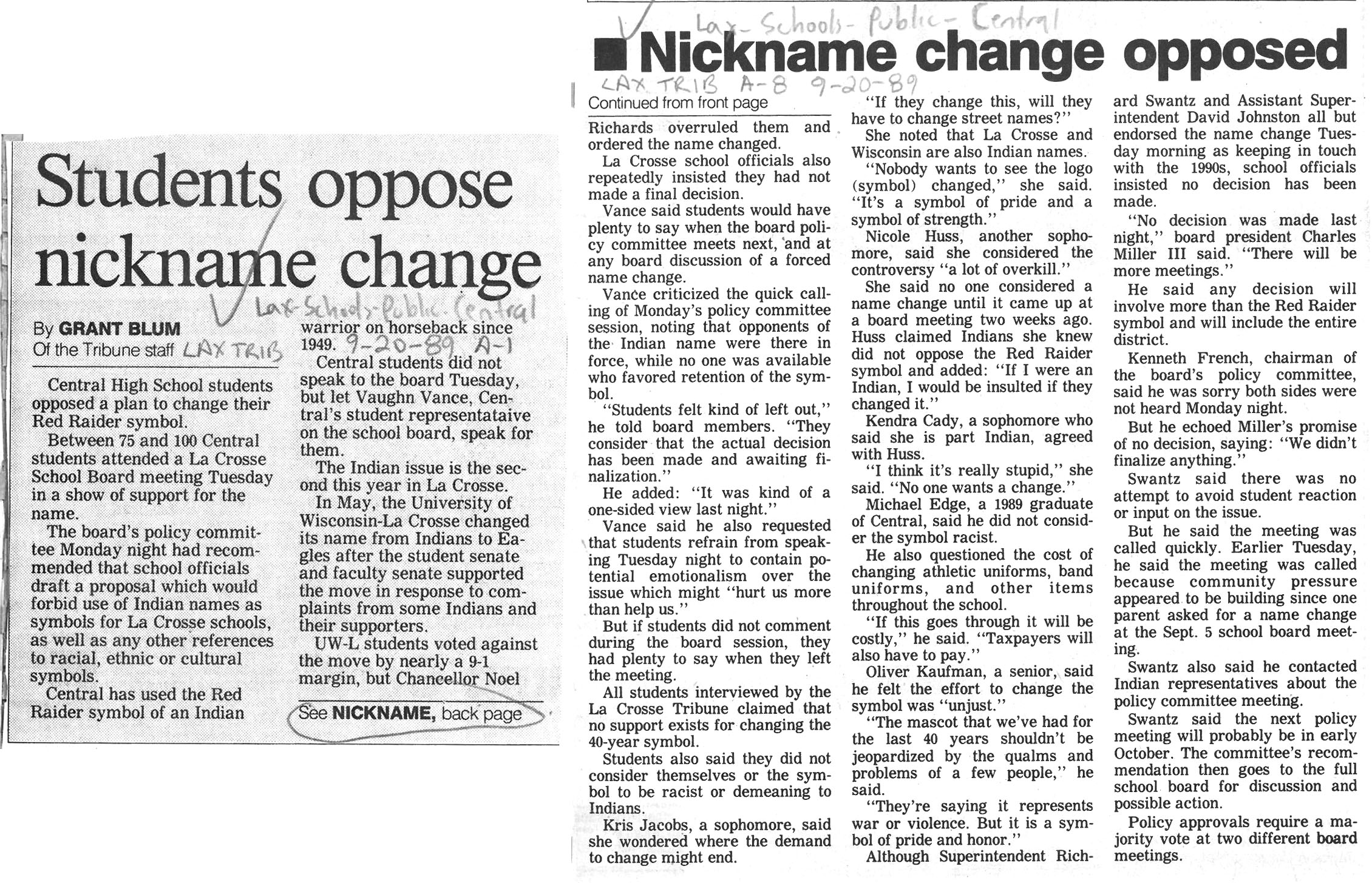 Central High School's longtime athletic teams logo and mascot - the Red Raiders - began being questioned as cultural appropriation in the late 1980s. Various levels of discussion and consideration of change happened into the early 1990s. In 1993, a firm decision to change the logo but to keep the name held until 2021, when the name was changed to RiverHawks.