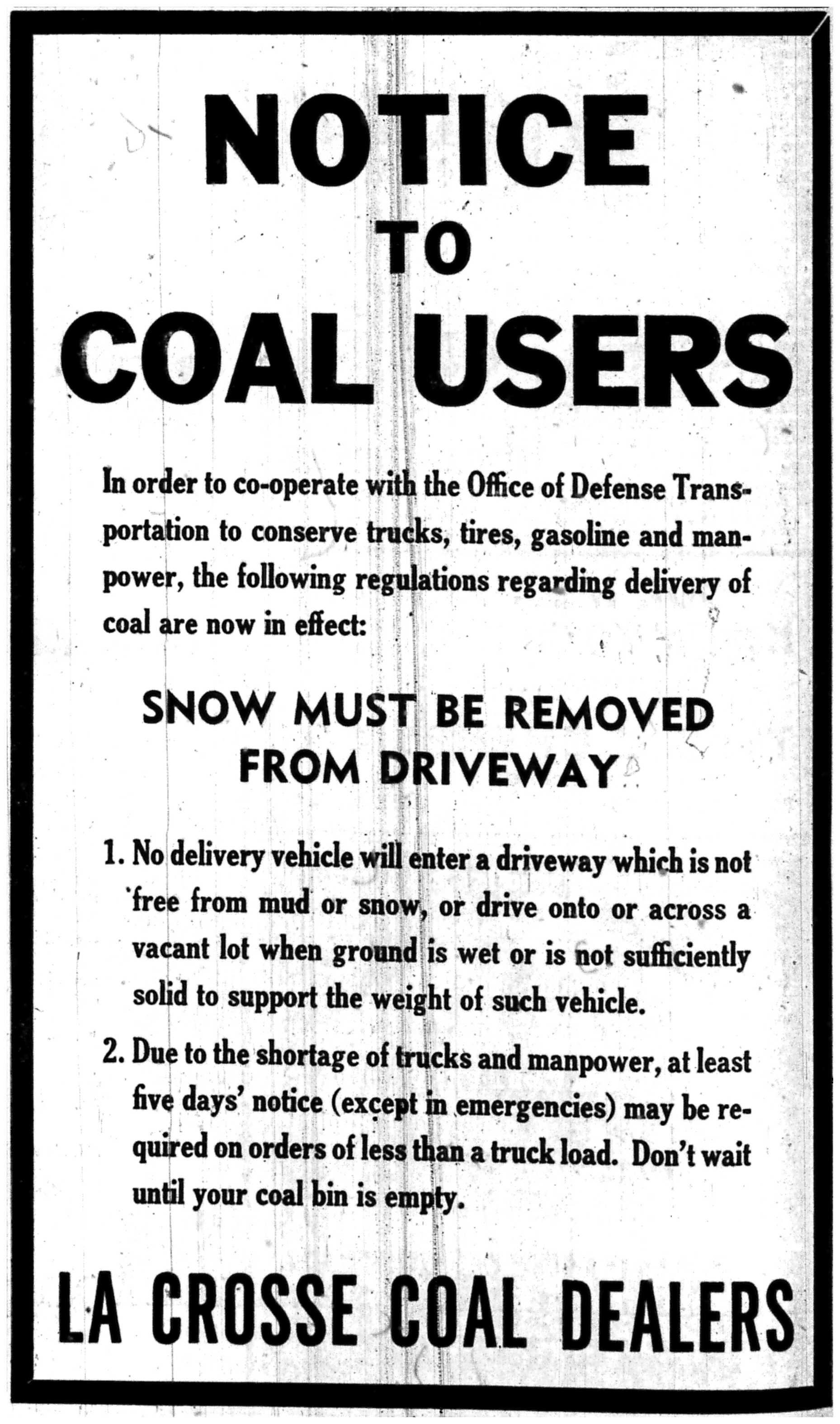 While military operations were going on all over the world, the people of La Crosse County were doing their part for the war effort. Local industries had switched from consumer goods to war material. With so many men in the armed forces, many jobs formerly performed by them were now done by women. Everyone had to deal with rationing of gasoline, rubber, food, and other essentials. The war touched almost every facet of life in some way or another.