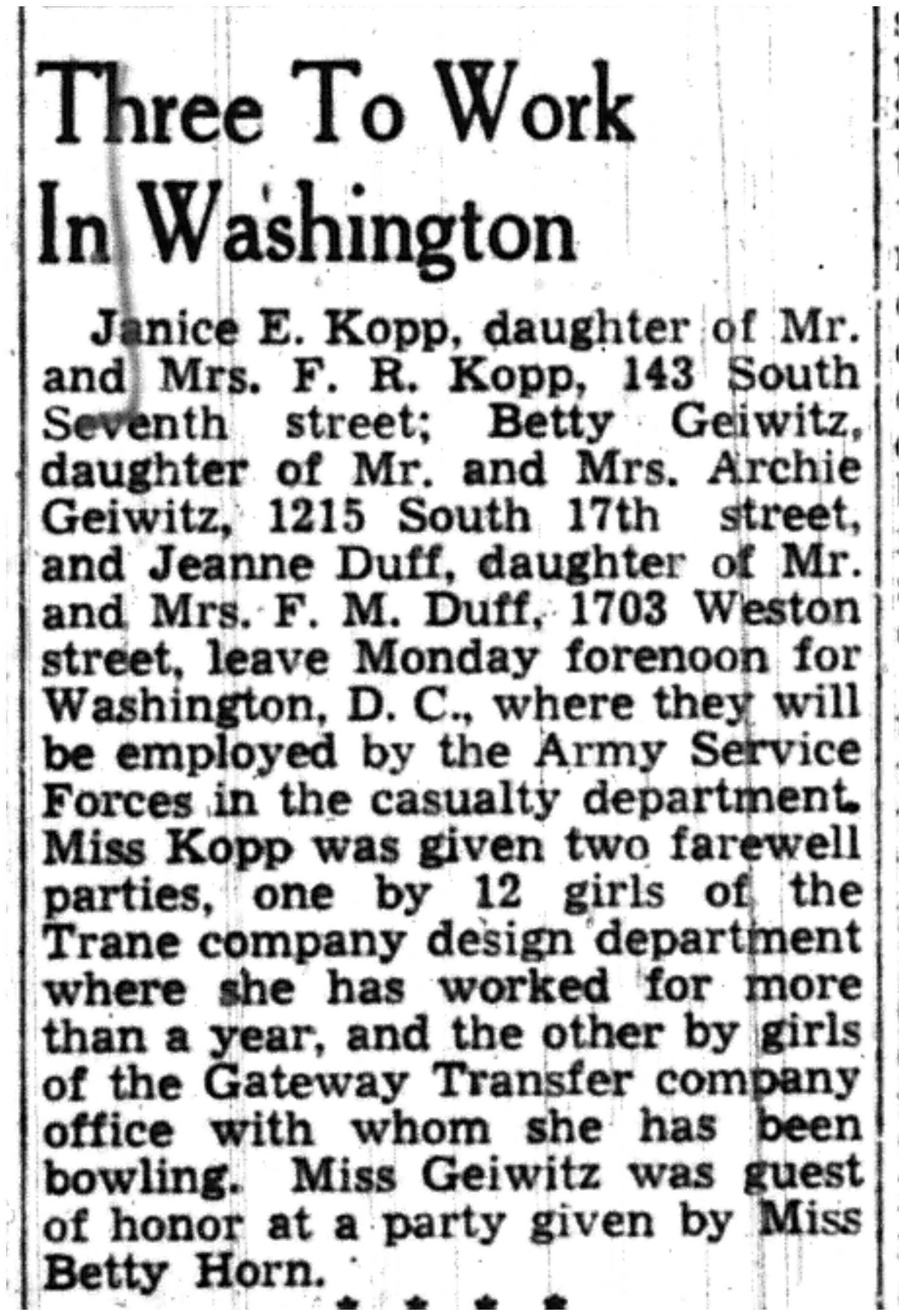 Janice Kopp; Betty Geiwitz; Jeanne Duff to Work in Washington |