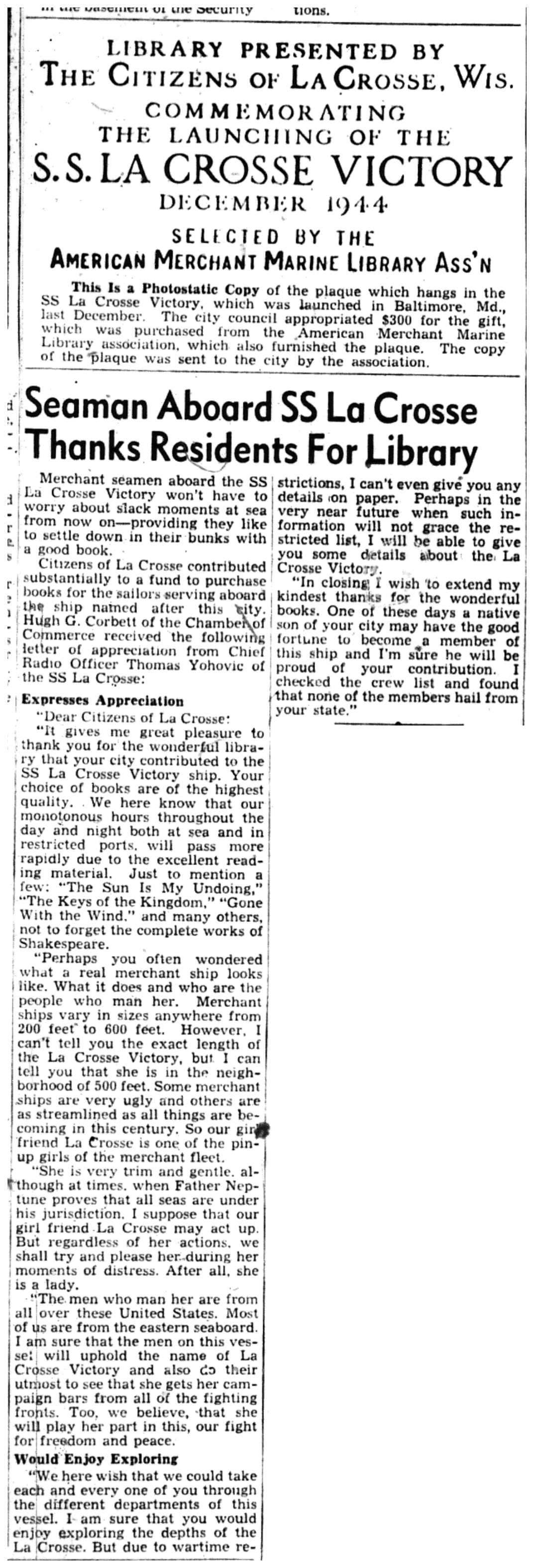 | 1945-2-7 | La Crosse Tribune p6 | |