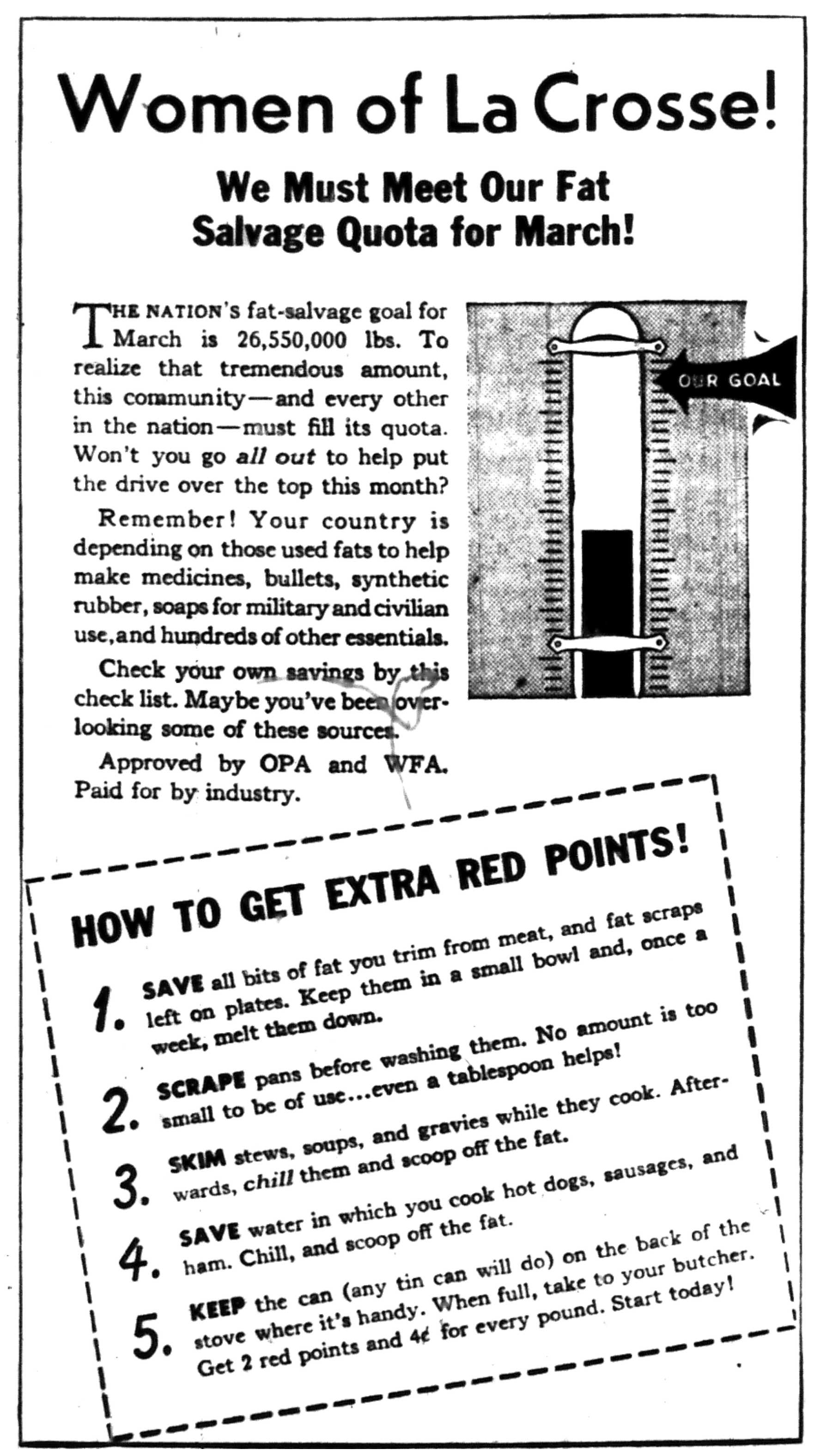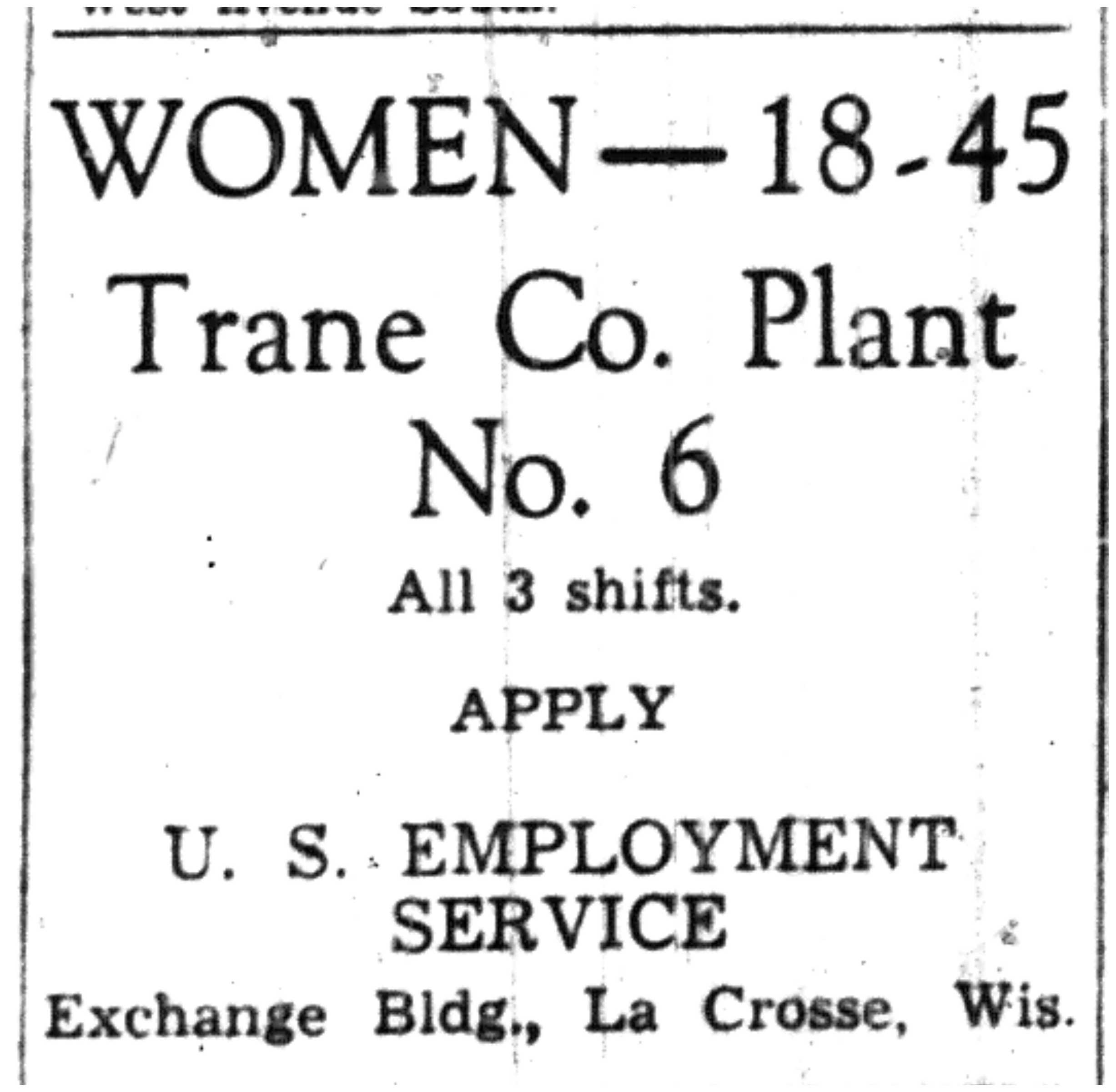 While military operations were going on all over the world, the people of La Crosse County were doing their part for the war effort. Local industries had switched from consumer goods to war material. With so many men in the armed forces, many jobs formerly performed by them were now done by women. Everyone had to deal with rationing of gasoline, rubber, food, and other essentials. The war touched almost every facet of life in some way or another.