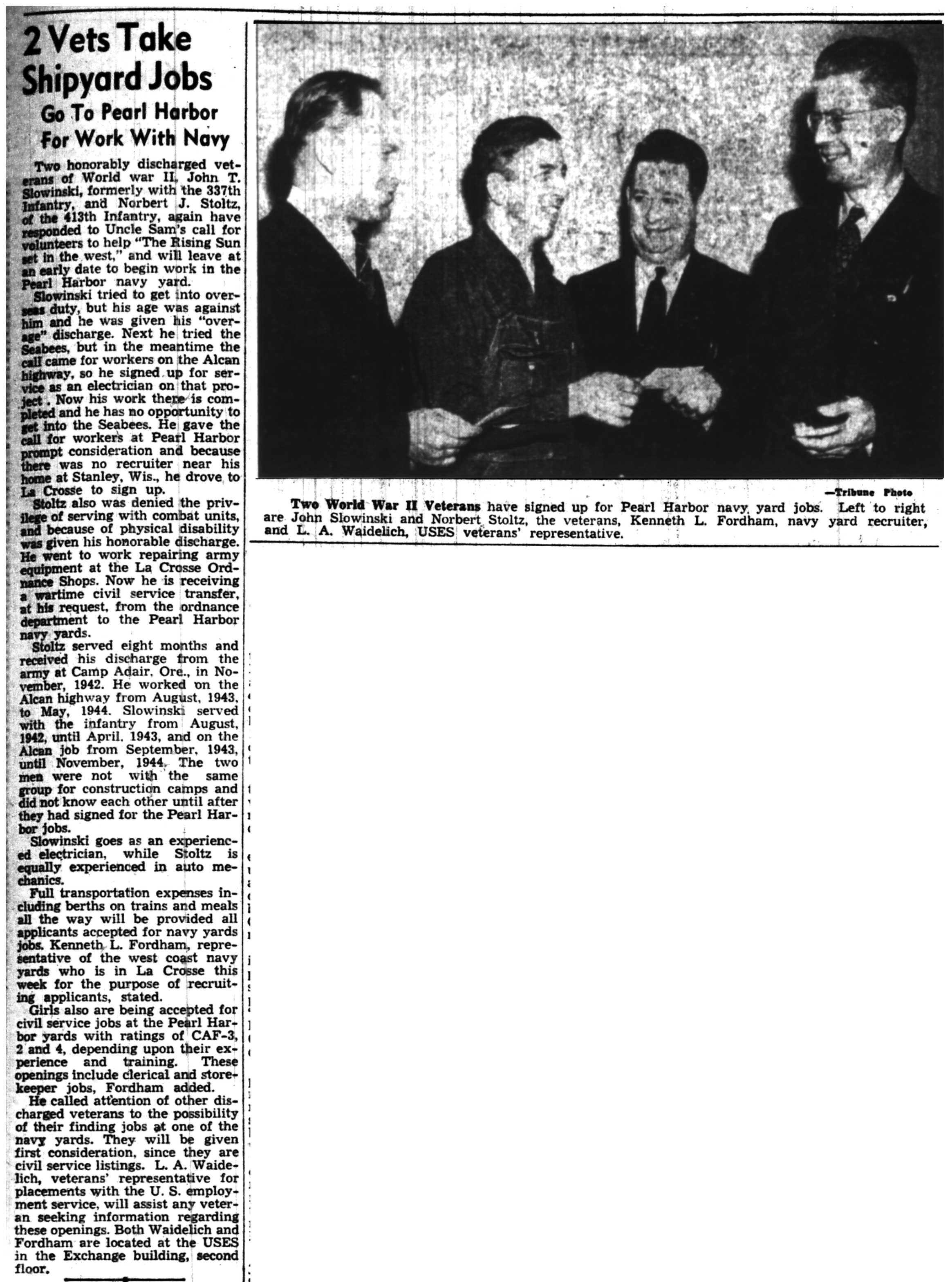John Slowinski, Norbert Stoltz Sign Up for Pearl Harbor Jobs |