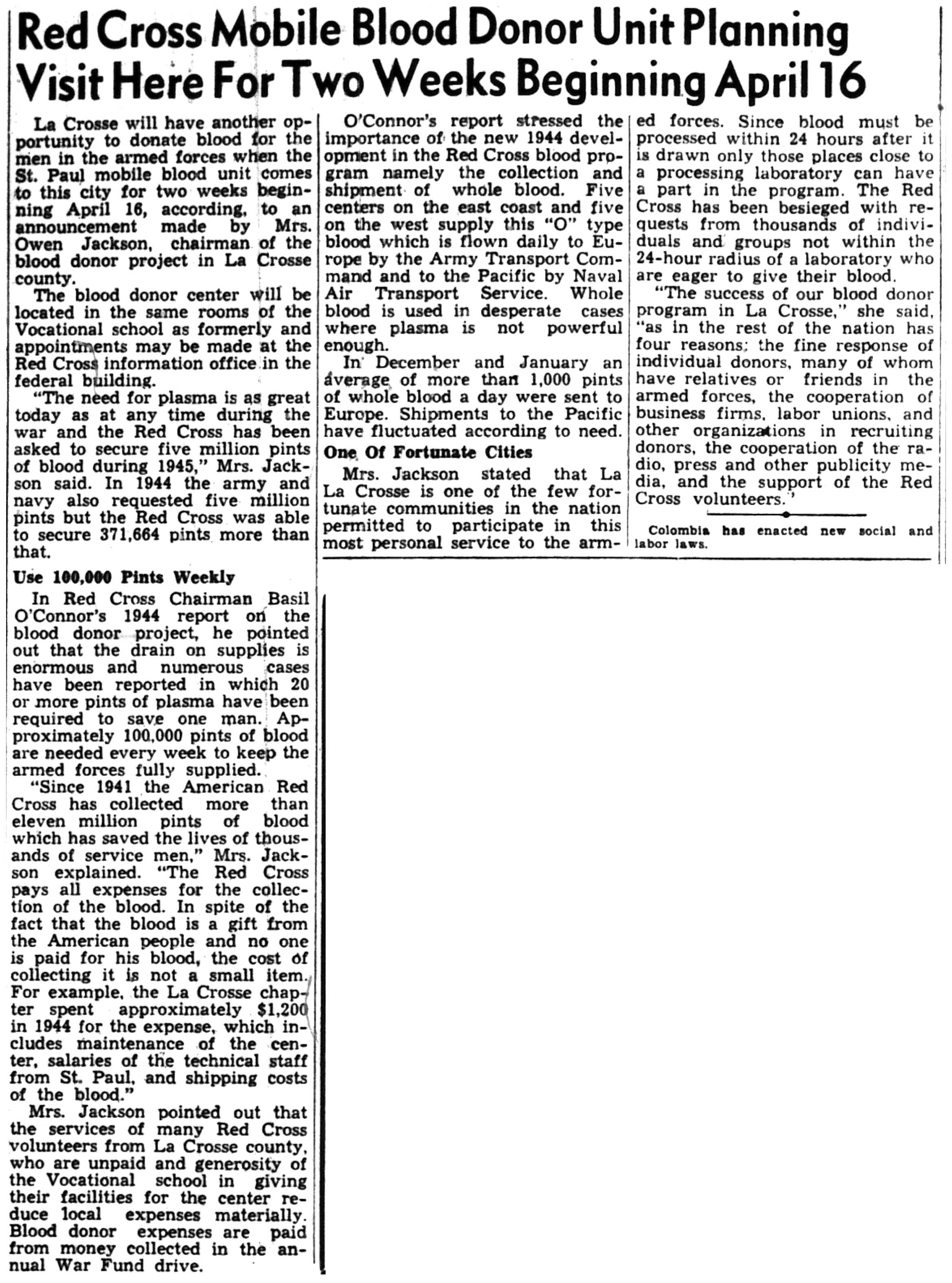 | 1945-3-1 | La Crosse Tribune p4 | |