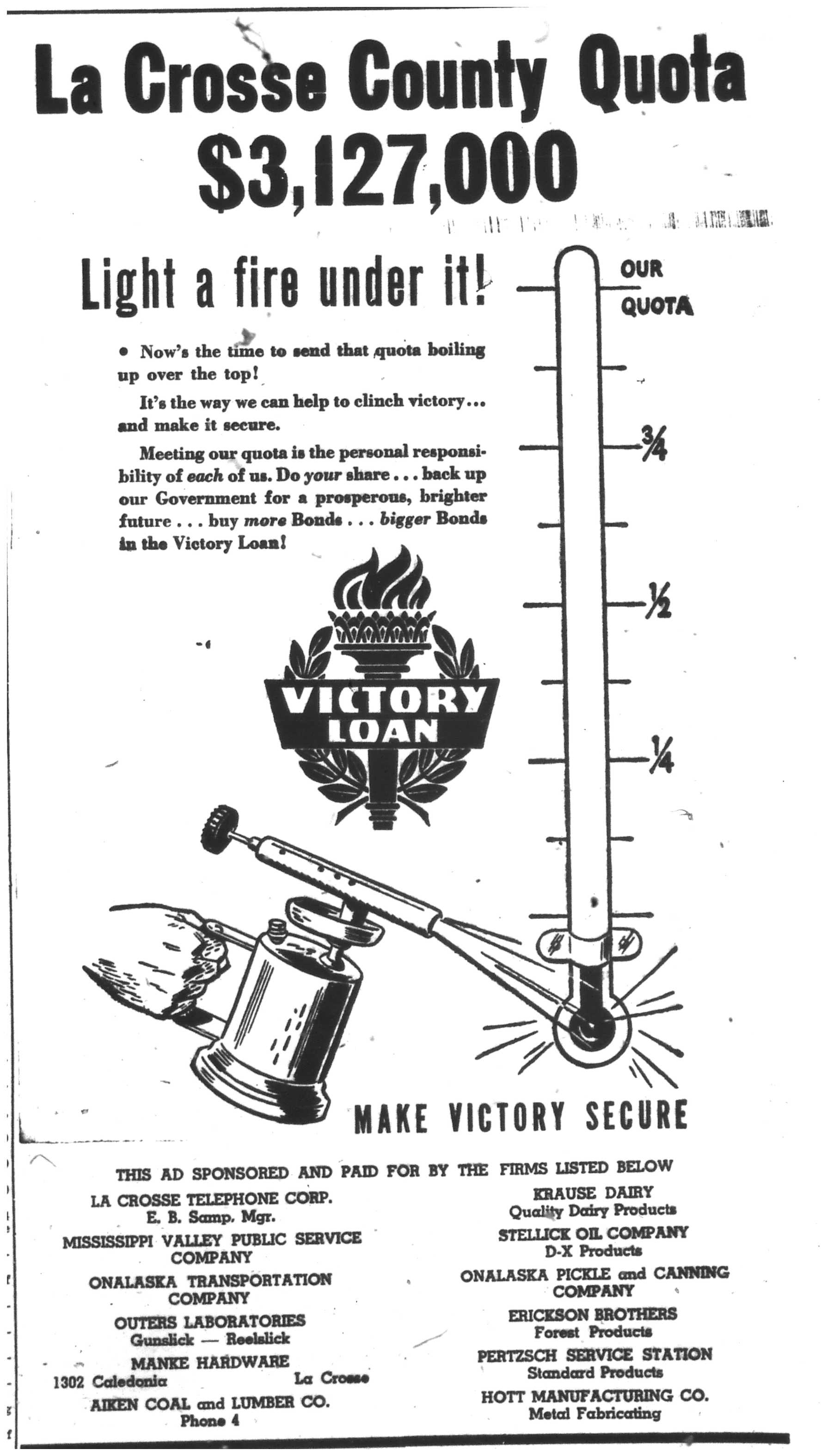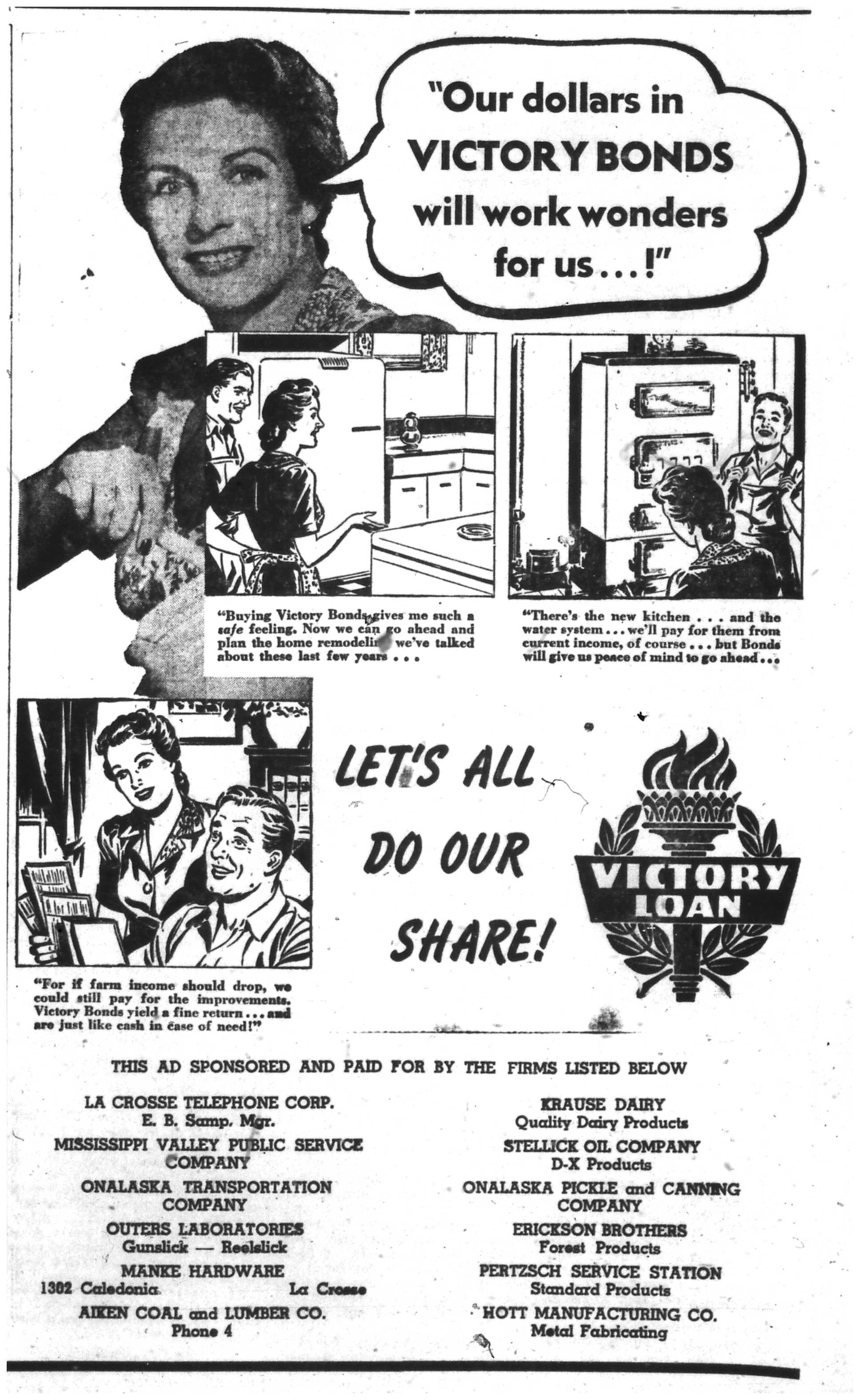 While military operations were going on all over the world, the people of La Crosse County were doing their part for the war effort. Local industries had switched from consumer goods to war material. With so many men in the armed forces, many jobs formerly performed by them were now done by women. Everyone had to deal with rationing of gasoline, rubber, food, and other essentials. The war touched almost every facet of life in some way or another.