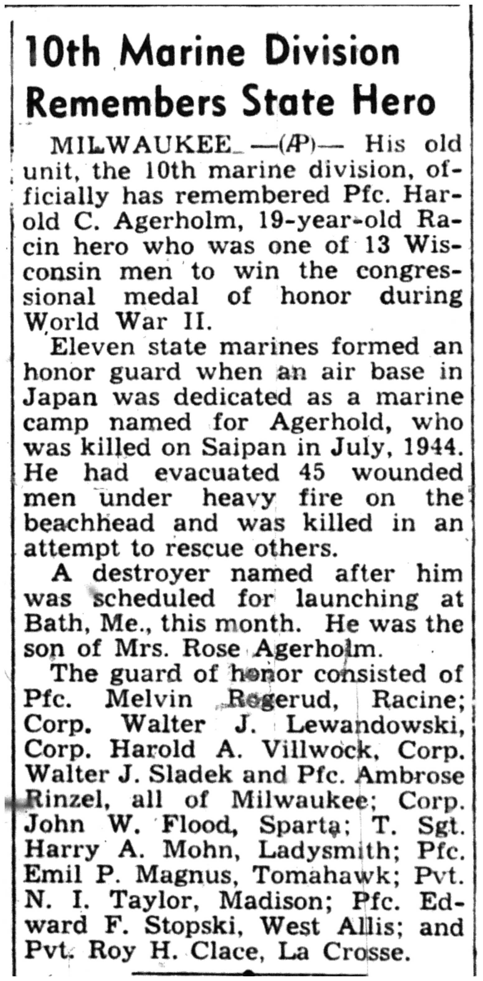 Albert Dannhoff, Virgil Sheehan, Harold Engelhardt, Thomas Pretasky, Lloyd Thorson, William Ormsby, John McCown, William Baler, James Norris, Clarence Larson, Weir Mose, Howard Thompson, Arthur Jordan, Ralph Drake, David Krammer, Kenneth Anderson, Allen Foltz, Richard Hollis, John Shuda, Levi Nelson, Richard Nowak, Albert Lesky, Stanley Inderberg, Sylvester Soller, Charles Onserud, Raymond Wuensch, Howard Aiken, Willard Almos, Ivan Peltier