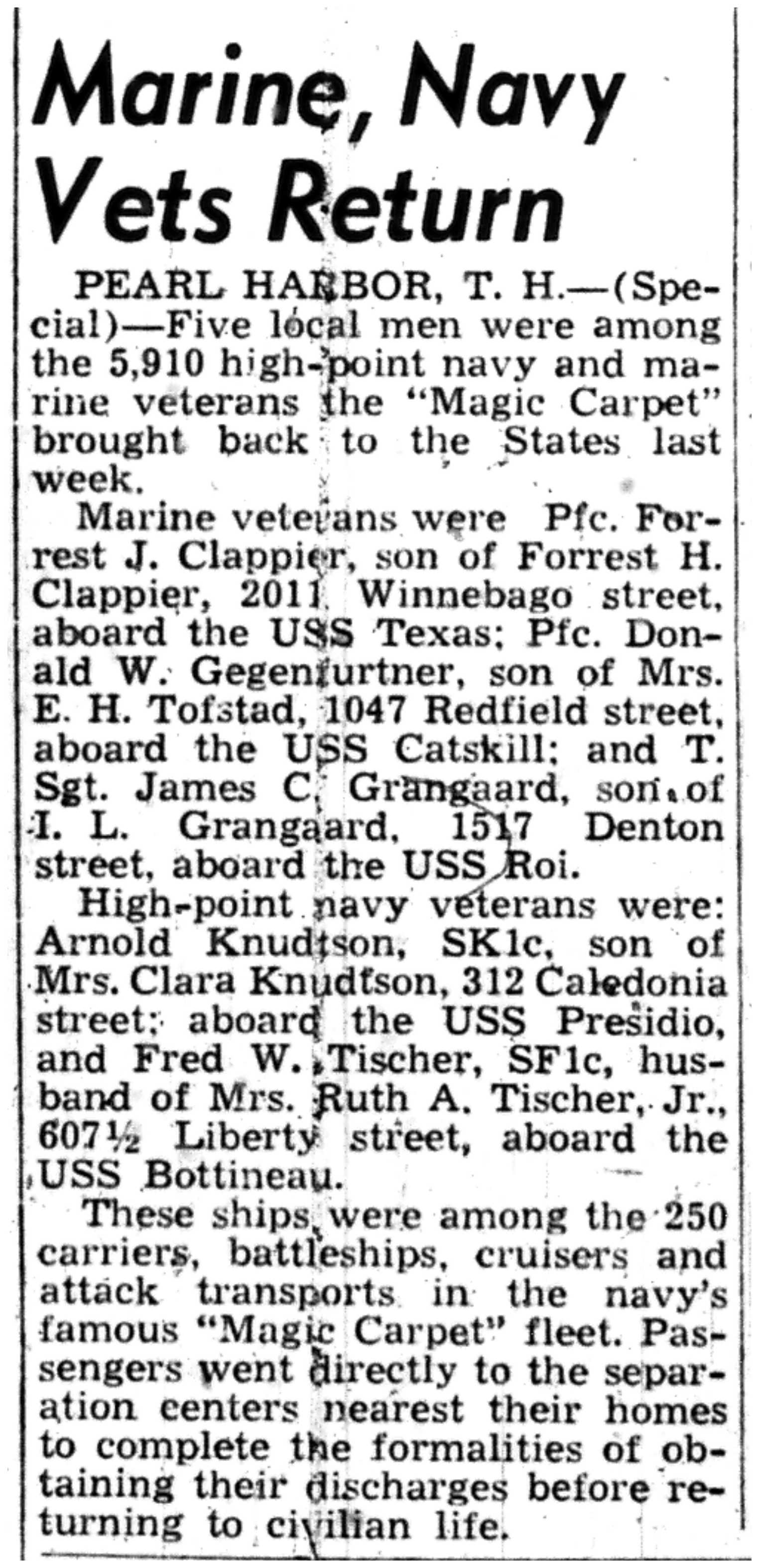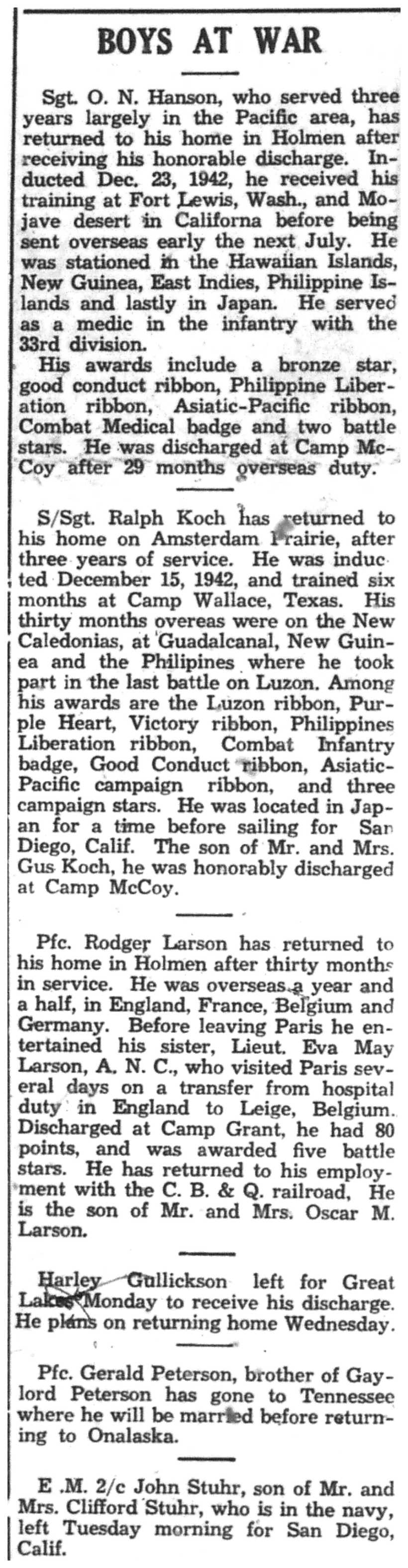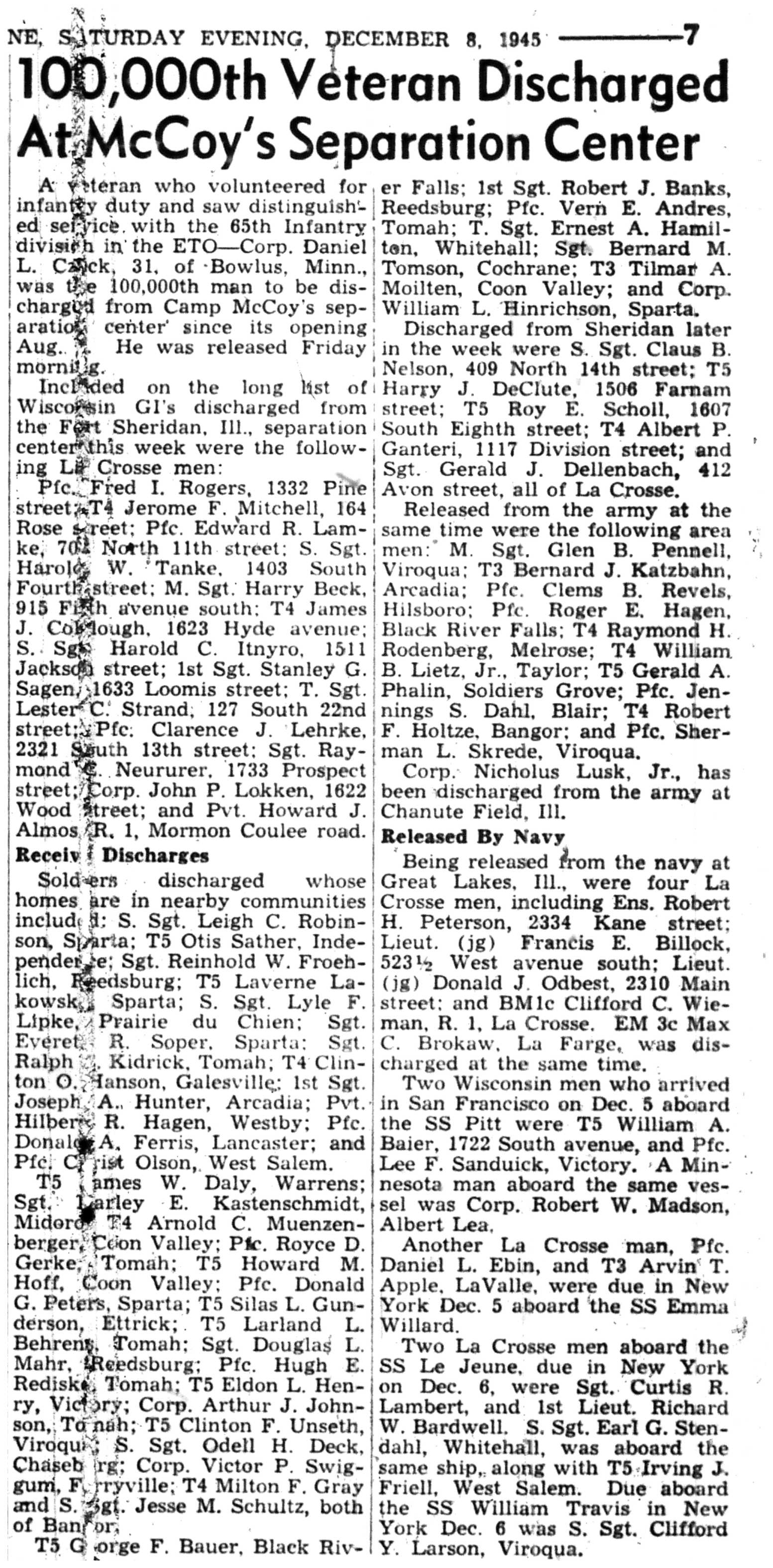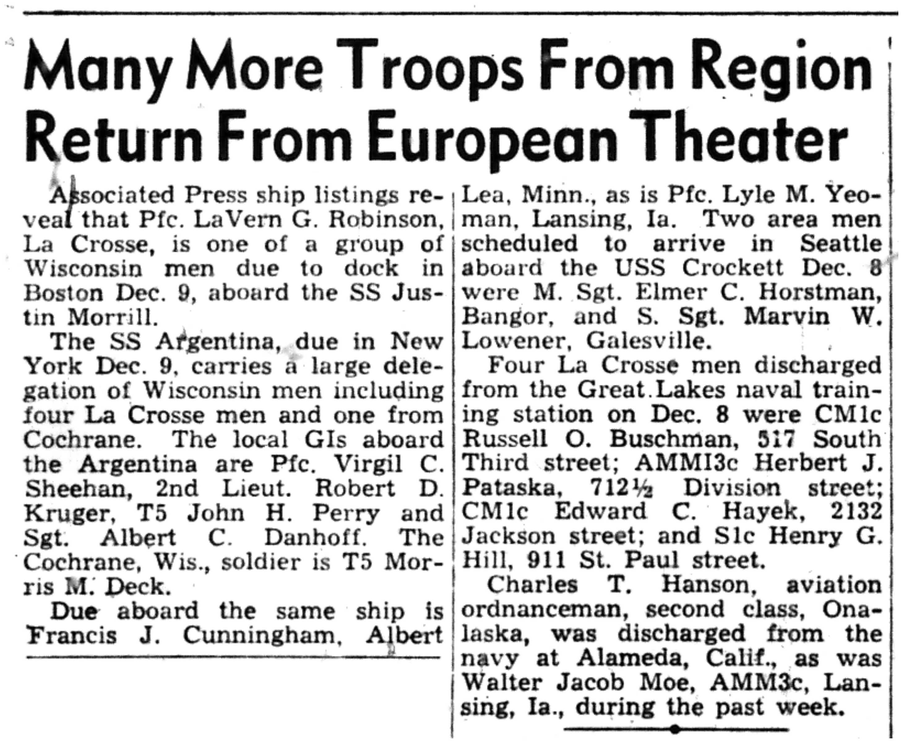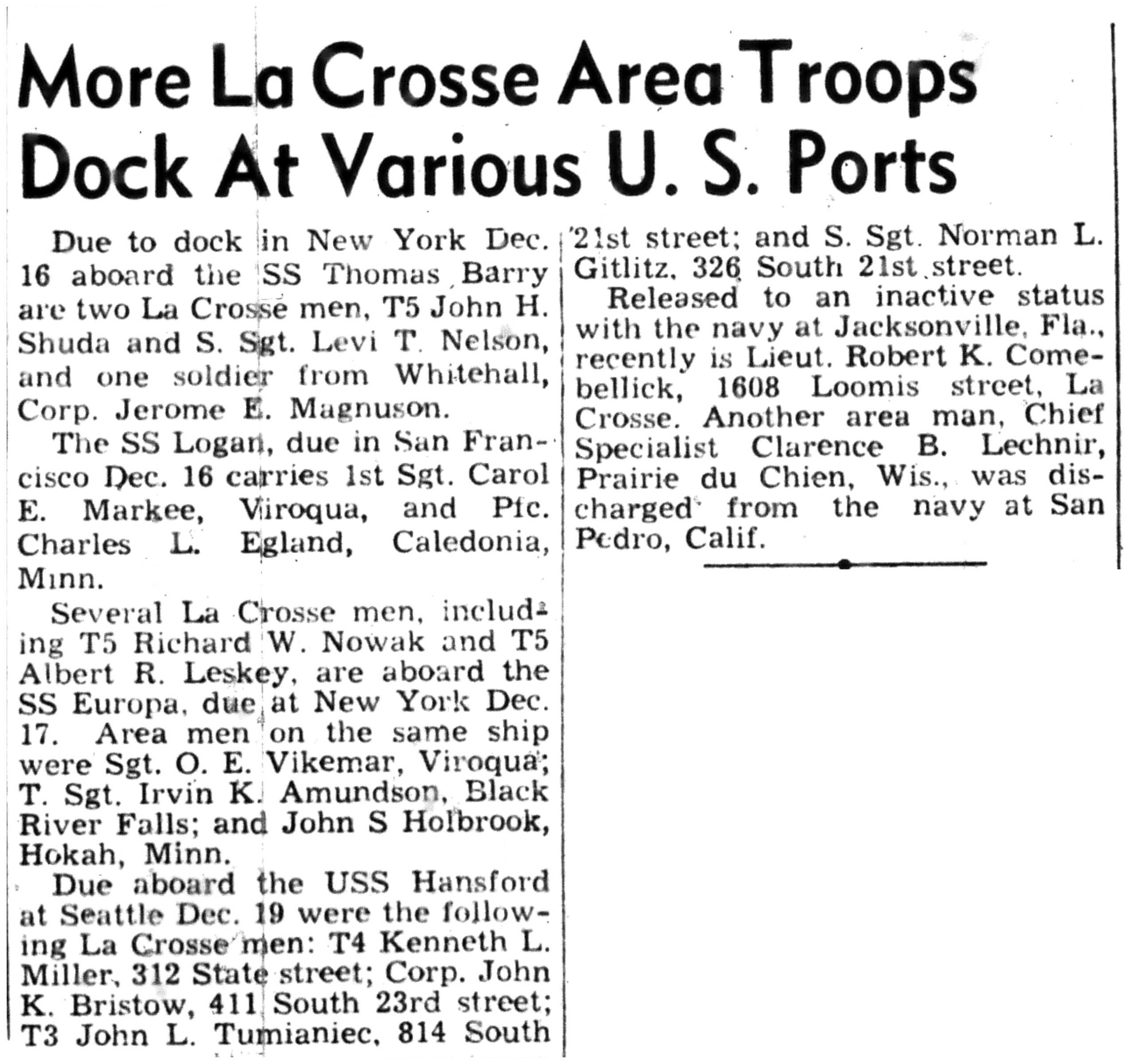 Albert Danhoff, Carl Bledsoe, Donald Payne, Thomas Pretasky, James Olsen, Robert Hengel, Erwin Korish, Walter Marshall, James Pittenger, Ervin Crogin, Burten Veglahn, LaVern Robinson, Virgil Sheean, Robert Krueger, John Perry, Lloyd Thorsen, Joseph Netzer, Warren Hogan, Richard Hayes, John Bernhard, Ralph Thomasgard, Vance Shaw, Roy Teel Jr, Eugene Hunt, Chester Blades, Earl Martin