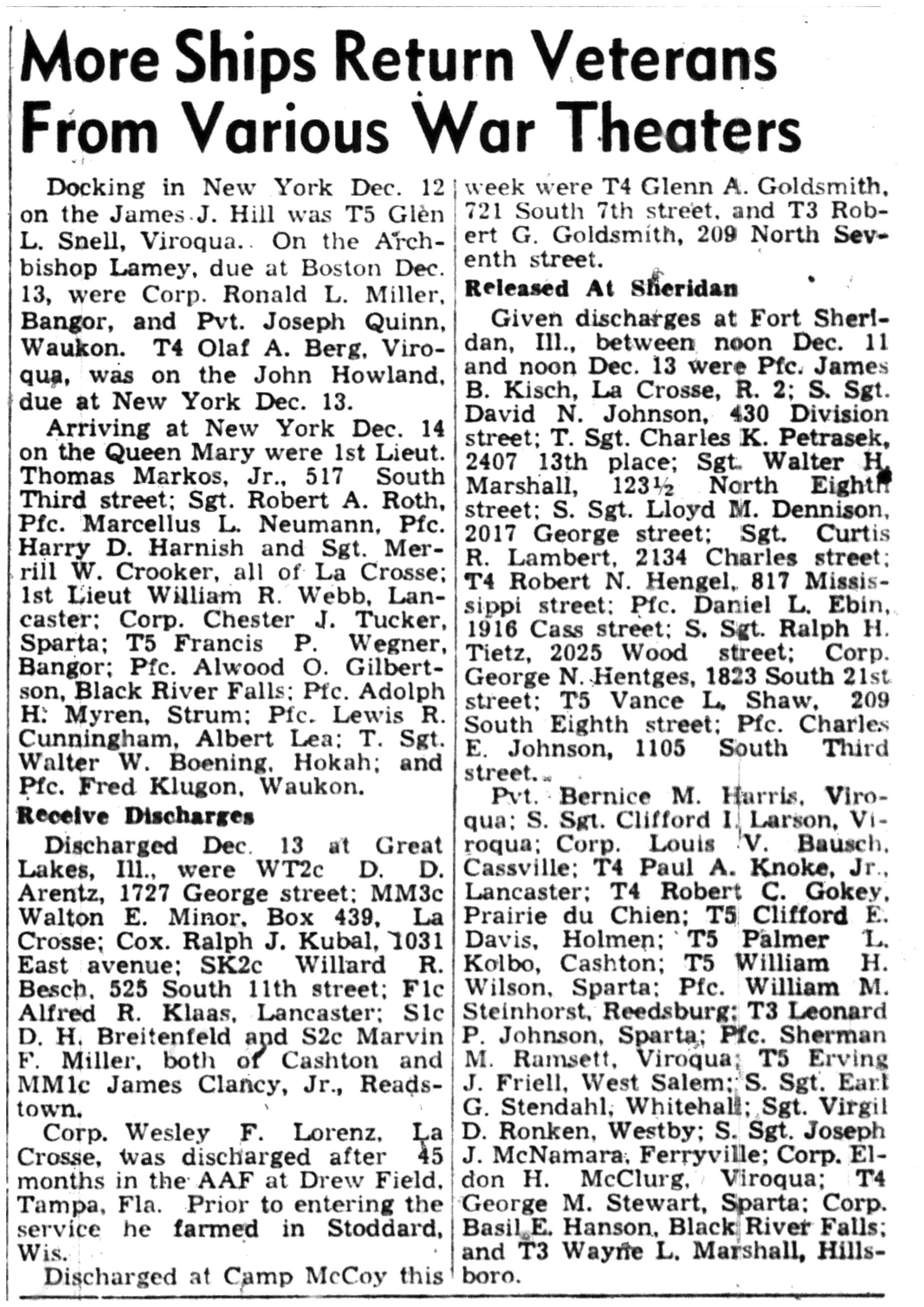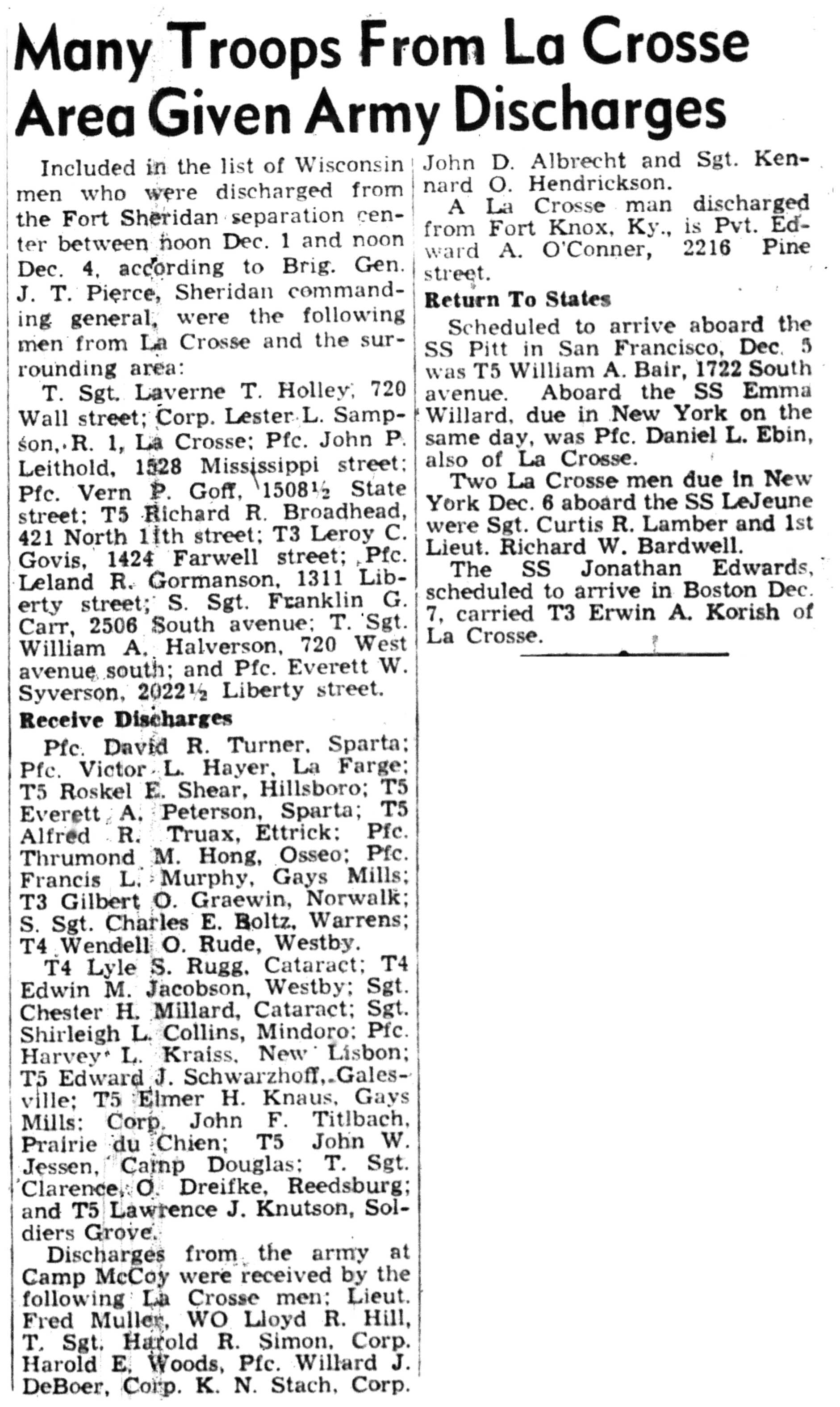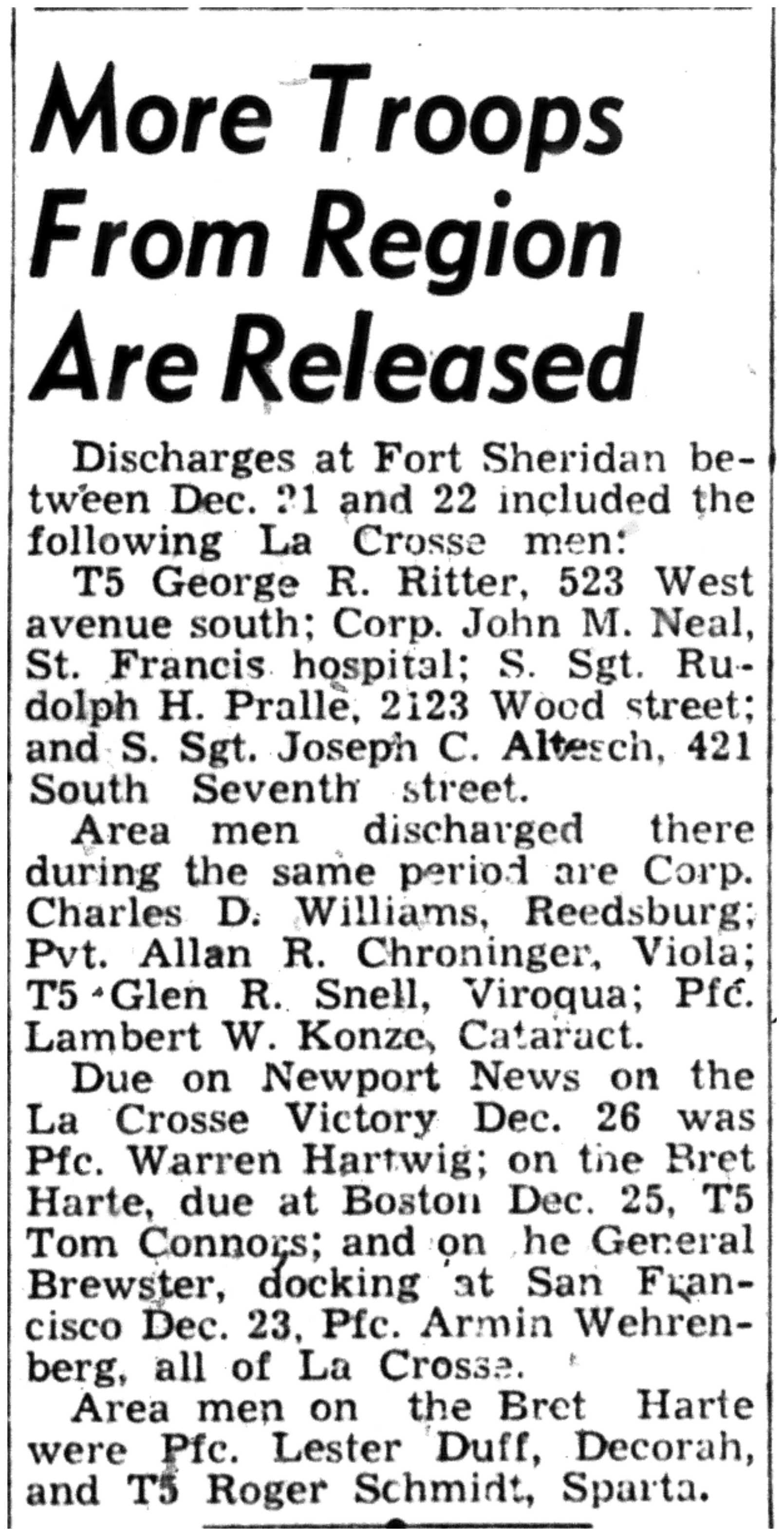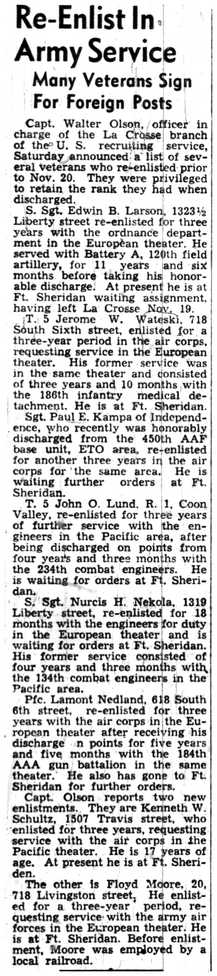 Albert Danhoff, Carl Bledsoe, Donald Payne, Thomas Pretasky, James Olsen, Robert Hengel, Erwin Korish, Walter Marshall, James Pittenger, Ervin Crogin, Burten Veglahn, LaVern Robinson, Virgil Sheean, Robert Krueger, John Perry, Lloyd Thorsen, Joseph Netzer, Warren Hogan, Richard Hayes, John Bernhard, Ralph Thomasgard, Vance Shaw, Roy Teel Jr, Eugene Hunt, Chester Blades, Earl Martin