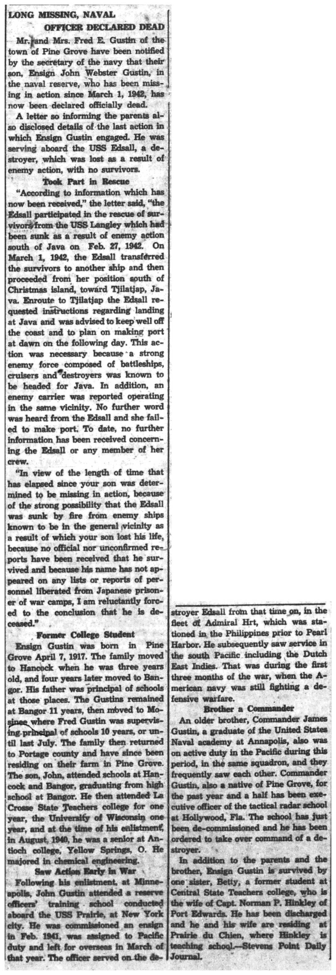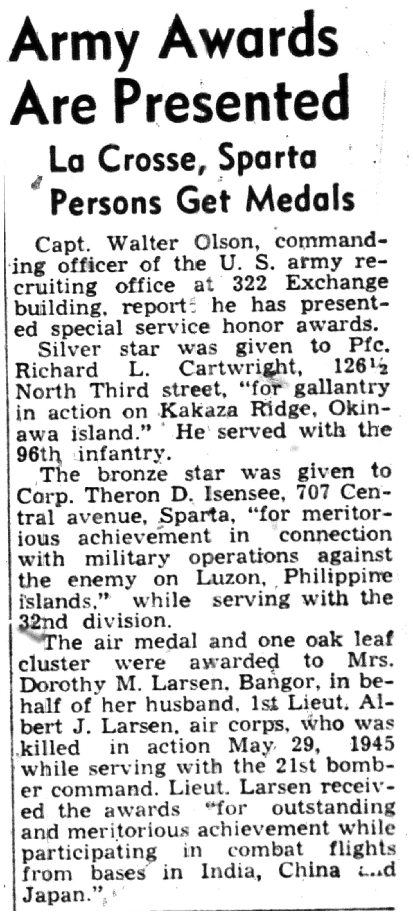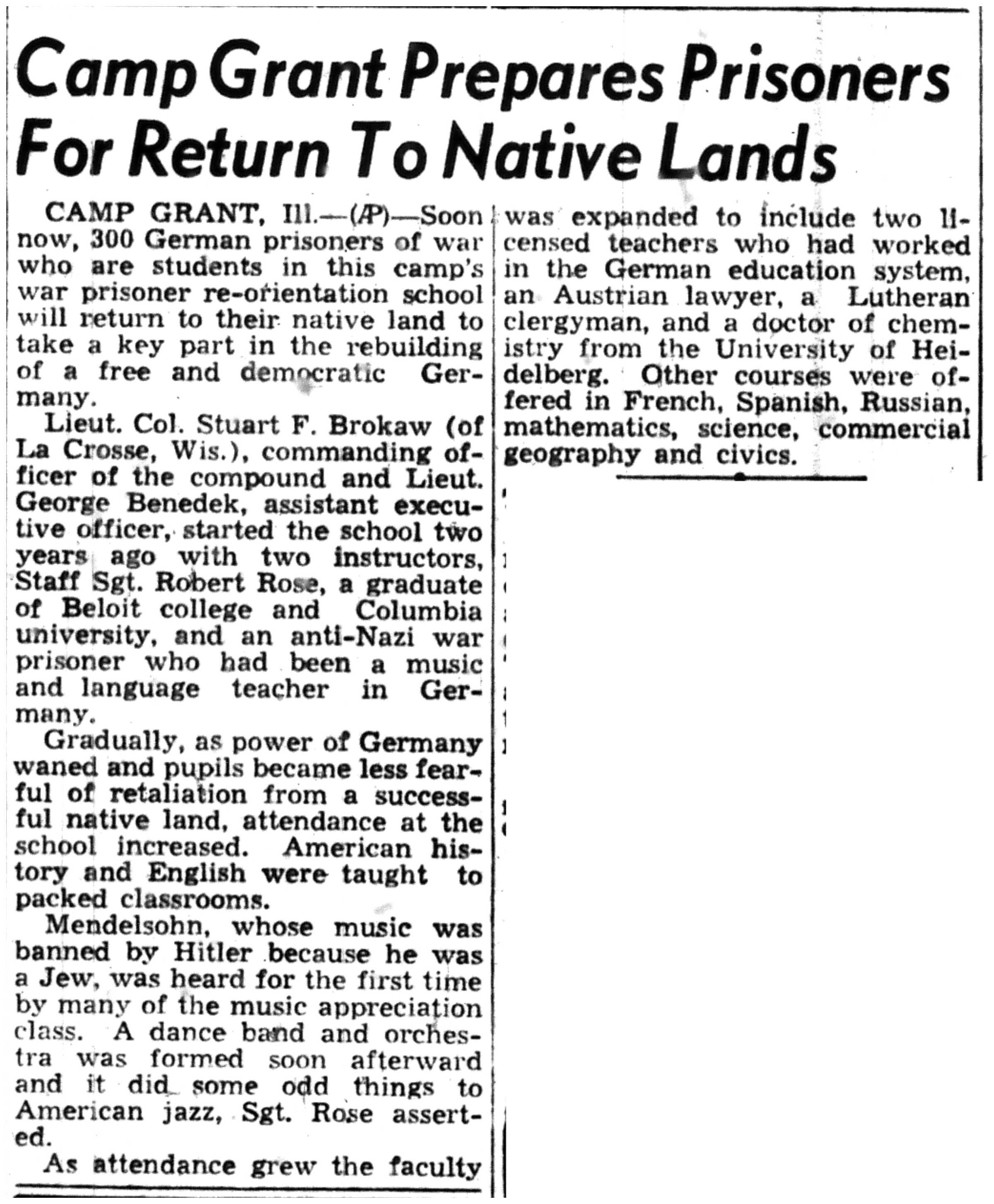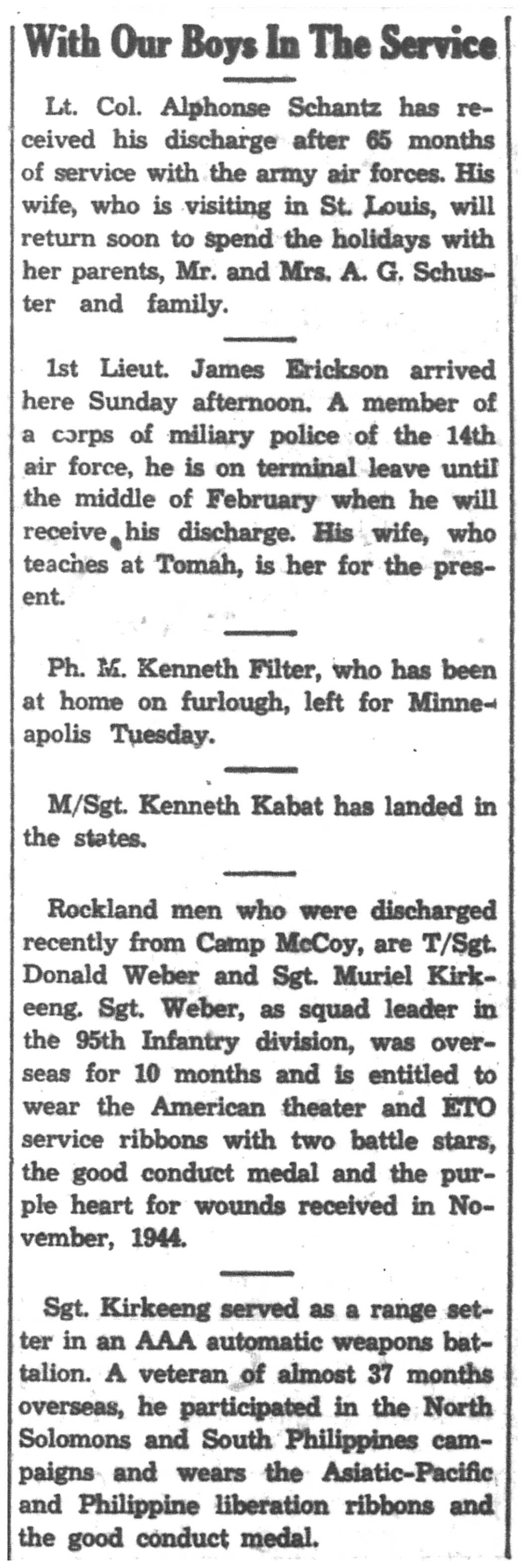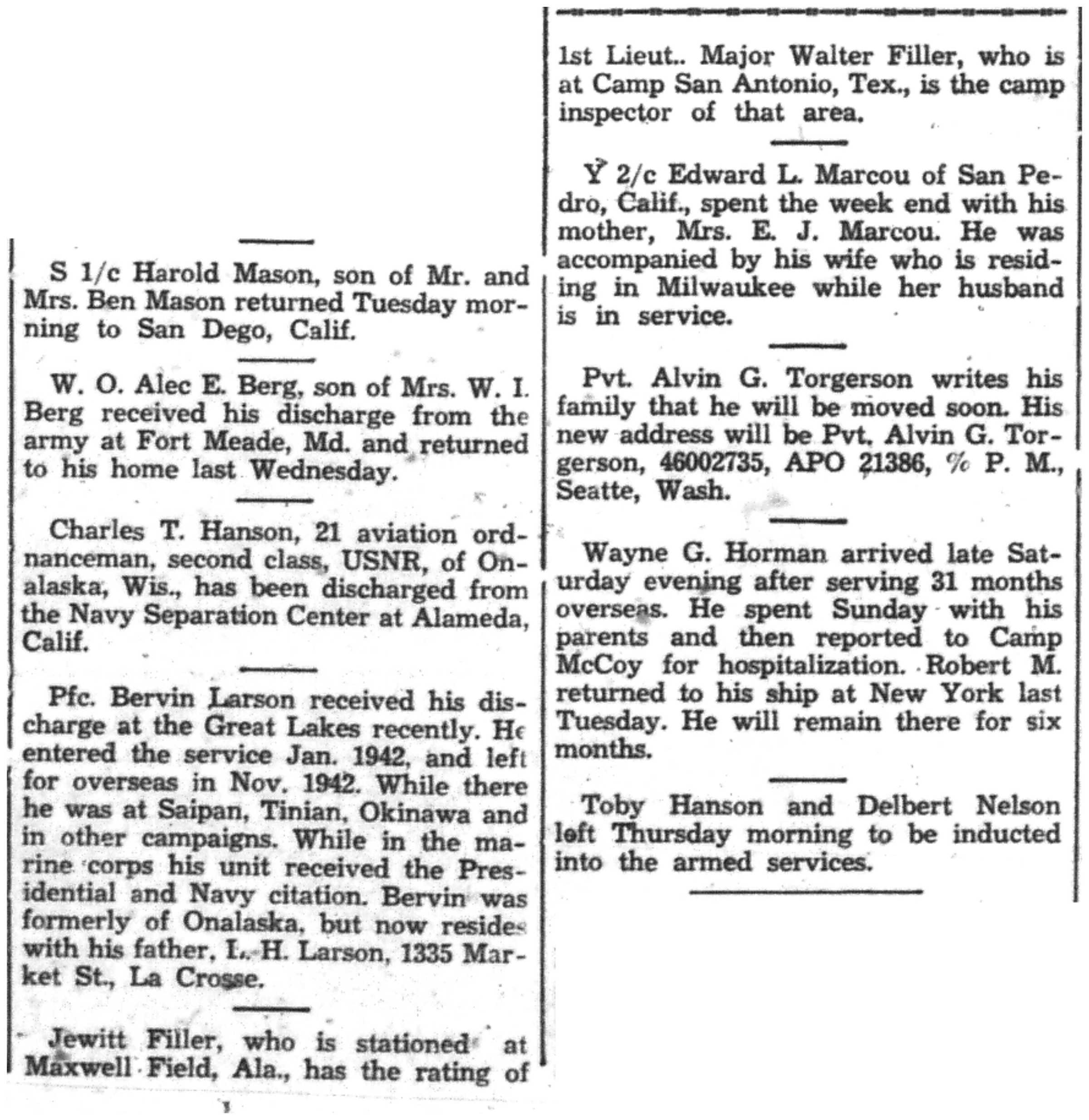 Albert Danhoff, Carl Bledsoe, Donald Payne, Thomas Pretasky, James Olsen, Robert Hengel, Erwin Korish, Walter Marshall, James Pittenger, Ervin Crogin, Burten Veglahn, LaVern Robinson, Virgil Sheean, Robert Krueger, John Perry, Lloyd Thorsen, Joseph Netzer, Warren Hogan, Richard Hayes, John Bernhard, Ralph Thomasgard, Vance Shaw, Roy Teel Jr, Eugene Hunt, Chester Blades, Earl Martin