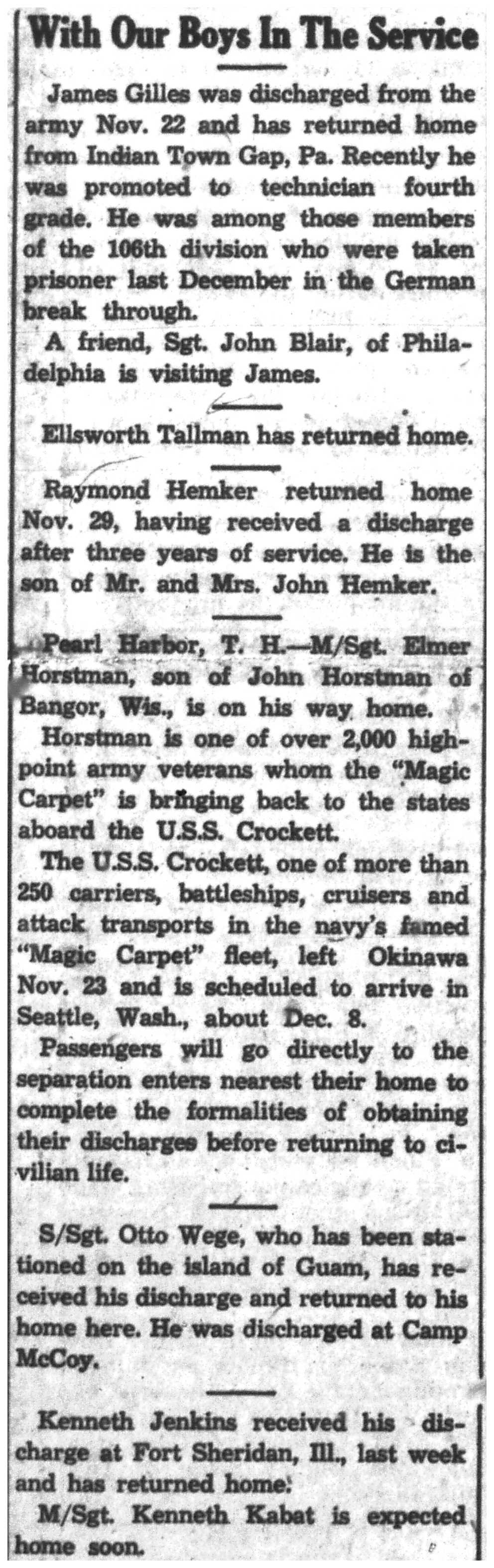 James Gilles, Ellsworth Tallman, Raymond Hemker, Elmer Horstman, Otto Wege, Kenneth Jenkins, Kenneth Kabat