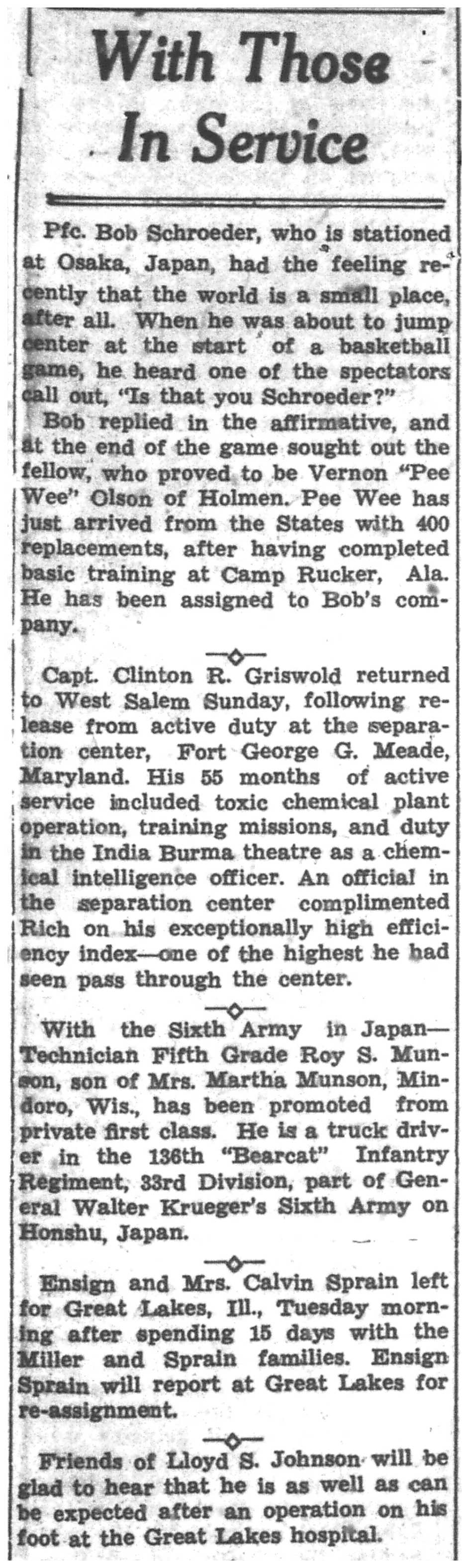 Bob Schroeder, Vernon Olson, Clinton Griswold, Roy Munson, Calvin Sprain, Lloyd Johnson