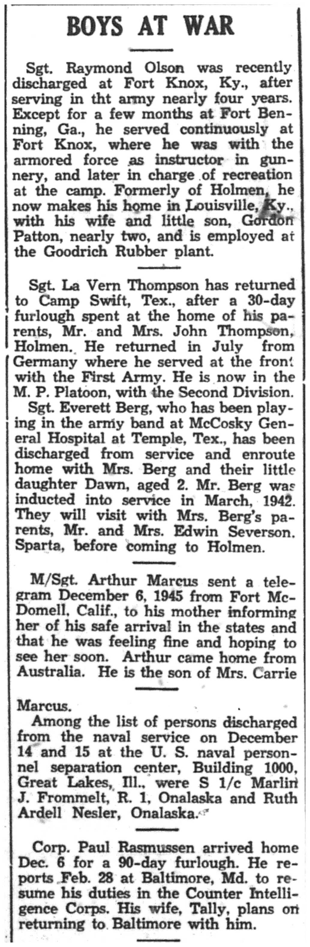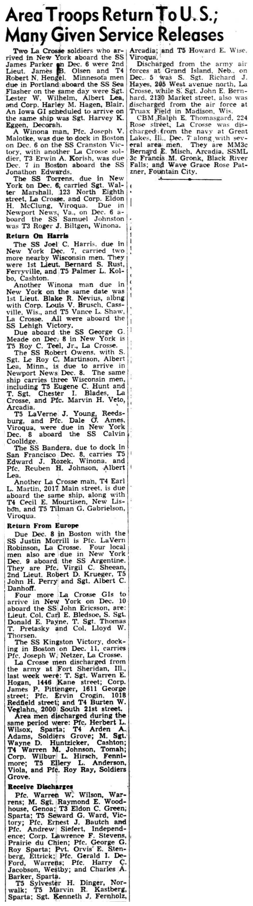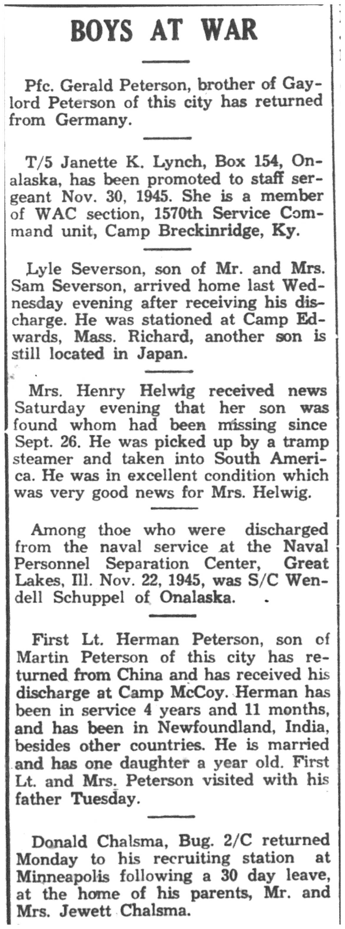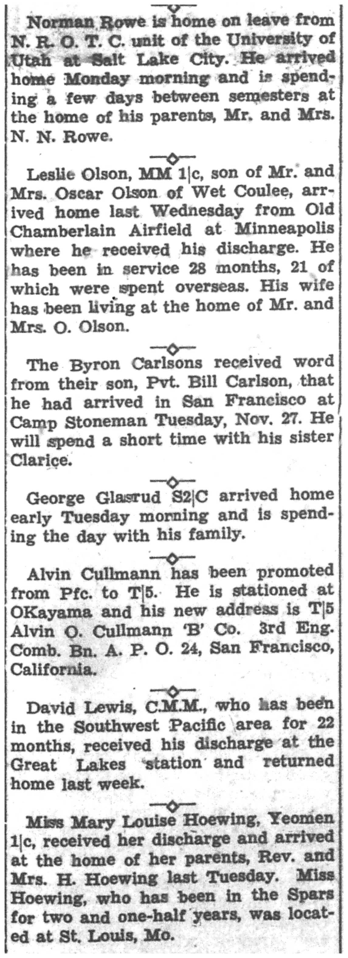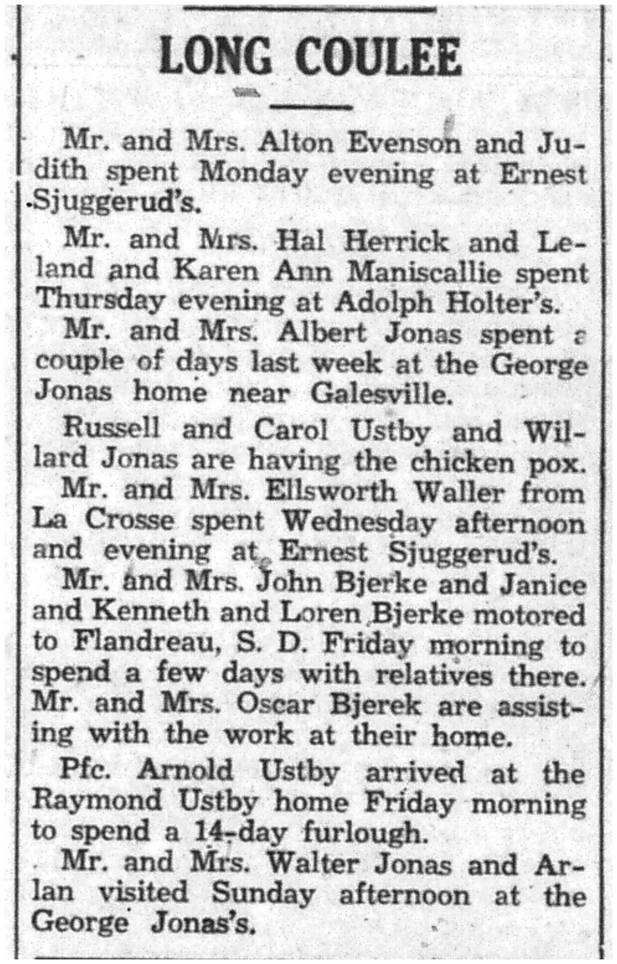 Arthur Kolbo, Herman Koschnitzke, Roy Kunz, Harold Kvam, Kenneth Larson, Marcus Larson, Raymond Larson, Clarence Lokken, Evelyn Lunde, Charles Mahlke, Robert Mendell, Alvin Mikelson, Louis Miller, Charles & Jack & William Steinmetz, Charles Stokke, Rudolph Stugen, Oscar Swenson Jr., Charles Tolvstad, Alvin Thomack, Donald Traaen, Merlin Trehus, Richard Ulvilden, David & Lawrence & Lois Vaaler, Sidney Wall, Carl & Eldred Wang, Ronald Wilder, Edward Carlsson, Eugene Conrad, Thomas Cravens, Robert Delphenic, Catherine Erickson, Vernon Erickson, Melvin Evenson, Robert Evenson, Kermit Fillner, Frank French, Don Garin, Jerome Gran, Adolph Gundersen, Glenn Gallup, Spencer Gilberg, Lawrence Girard, Richard Granke, Alf & Sigurd & Trygve & Tharolf Gundersen, Roland Gutknecht, William Halvorson, Clarence Hanson, Kenneth Hanson, Roy Hanson, Russell Hanson, Harry Sandbergen, Harold Simonson, John Steiner, Joseph Setinmetz, Ralph Stokke, Omer Tormoen, Clarence Wang, George Wang, Donald Wensole, Stanley Winther, Gerald Wollan, Merton Yarrington, James Jacobson, Raymond Jevne, Clayton Johnson, Orland Johnson, Robert Johnson, Victor Johnson, Ernest Jordie, Ervin Jordie, Frank Jungbluth, John Larson, Marvin Lee, Eugene Lind, John & Kenneth & Oliver & William Young, Morris Amsrud, Clarence Amundson, Burton Anderson, Carsten Arentson, Douglas Arneson, George Bedessem, Gordon & Ralph Bergum, Kenneth Bey, Ronald Black, Edward Carlsson, John Gullickson, Leo Hanson, Merlin Hanson, Pauleen Hartwig, Warren Hartwig, Earl Haugen, Gerald Haugen, Lloyd Haugen, Russell Hefit, Kenneth Helgerson, Orlando Helgerson, Frances Hensrud, James Hollnagel, Jorgen & Orrin & Palmer & Robert Moen, Edgar Ness, Ralph Ness, Donald Niemeyer, Robert Niemeyer, Arvid Olson, Lester Price, Gordon Rank, Vernon Rauk, Ray Richert, Oscar Risberg, Milton Roppe, Leo Amundson, Winfield Bagley, Otto Bey Jr., Oscar Borseth, John Olson, Omer Olson, Walter Thomack, Leonard Hetland, Alvin Mikelson, Evelyn Lunde, Alvin & Arnold Amsrud, Robert & William Amunson, Herman Anderson, Harry Bangsberg, Clarence Beissel, Harold Bey, Arne Christianson, Carsten Dahle, Roald Forseth, Lester Lind, Robert Lind, Everett Lundby, De Ette Magee, Robert Magee, Malcolm Nelson, Grant Ness, George Oehrle, Garnett Oseth, Oswald Hensrud, Leonard Hetland, Lloyd Hill, Hugo Hickisch Jr., Jane Hoff, Floyd Holte, Hudson Holte, Arthur Houska, Betty Johnson, Chester Johnson, Gerald Johnson, Glen Johnson, Paul Johnson, Robert Peterson, Kenneth Pierce, Harvey Putt, William Riley, Vernon Schultz, Wayne Siegel, Astrid Sivertson, Sigurd Sivertson, Helen & Marilyn & Robert & Wayne Smevog