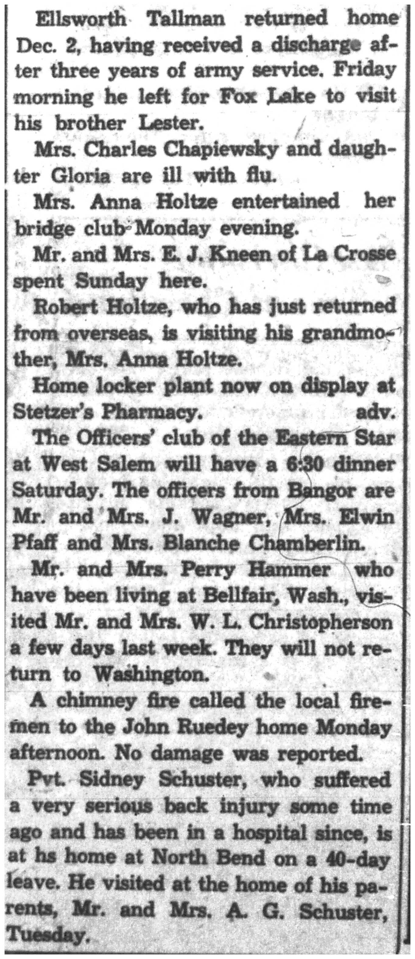 Alan O'Meara, Norman Anderson, Harold Severson, James Schuth, Franklin Smolek, Raymond Hanson, David Gianoli, Leland Steinhoff, ervin Arenz, Theodore Dusso, Francis Wegner, Roger Young, Jack Layland, Alvin Mikelson, Richard Campbell, R. K. Bright, Everett McKinney, Edward Alberts, Leslie Erickson, Rudolph Mix, Kenneth Young, Thomas Johnson, Eva Larson, Bernard Brye, Felix Wurzel, Harry Maxwell, Paul Meir, Arthur Pendleton, Victor Buschman, Leui Nelson, John Shuda, William Thompson, Kenneth Anderson, Clayton Hinkel, Marcellus Neumann, Harry Harnish, Stanley Meinert, Robert Roth, Merrill Crooker