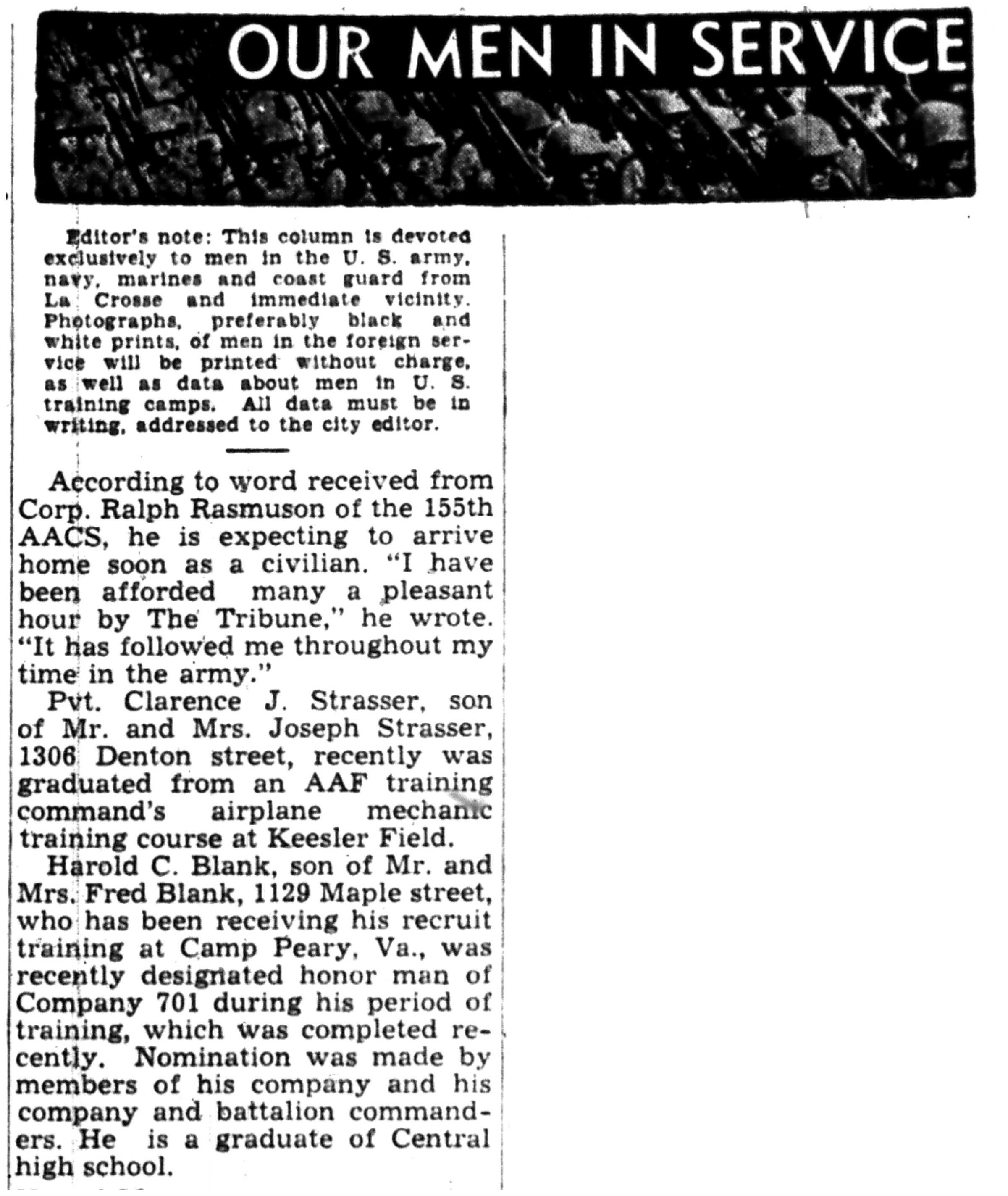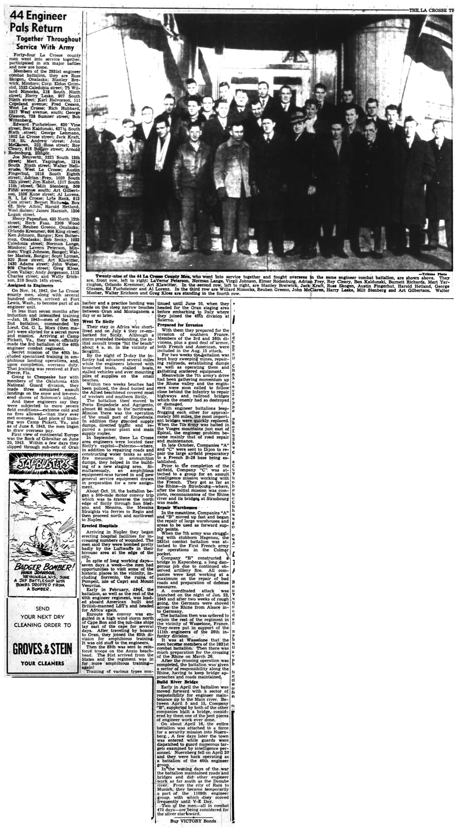 Albert Ganteri, Gerald Dellenbach, Christ Olson, Harley Kastenschmidt, Milton Gray, Jesse Schultz, Claus Nelson, Harry DeClute, Roy Scholl, Clifford Wieman, William Baier, Daniel Ebin, Curtis Lambert, Richard Bardwell, Irving Friell, Fred Rogers, Jerome Mitchell, Edward Lamke, Harold Tanke, Harry Beck, James Collough, Harold Itnyro, Stanley Sagen, John Lokken, Howard Almos, Lester Strand, Clarence Lehrke, Raymond Neururer, Robert Holtze, Robert Peterson, Francis Billock, Donald Odbest
