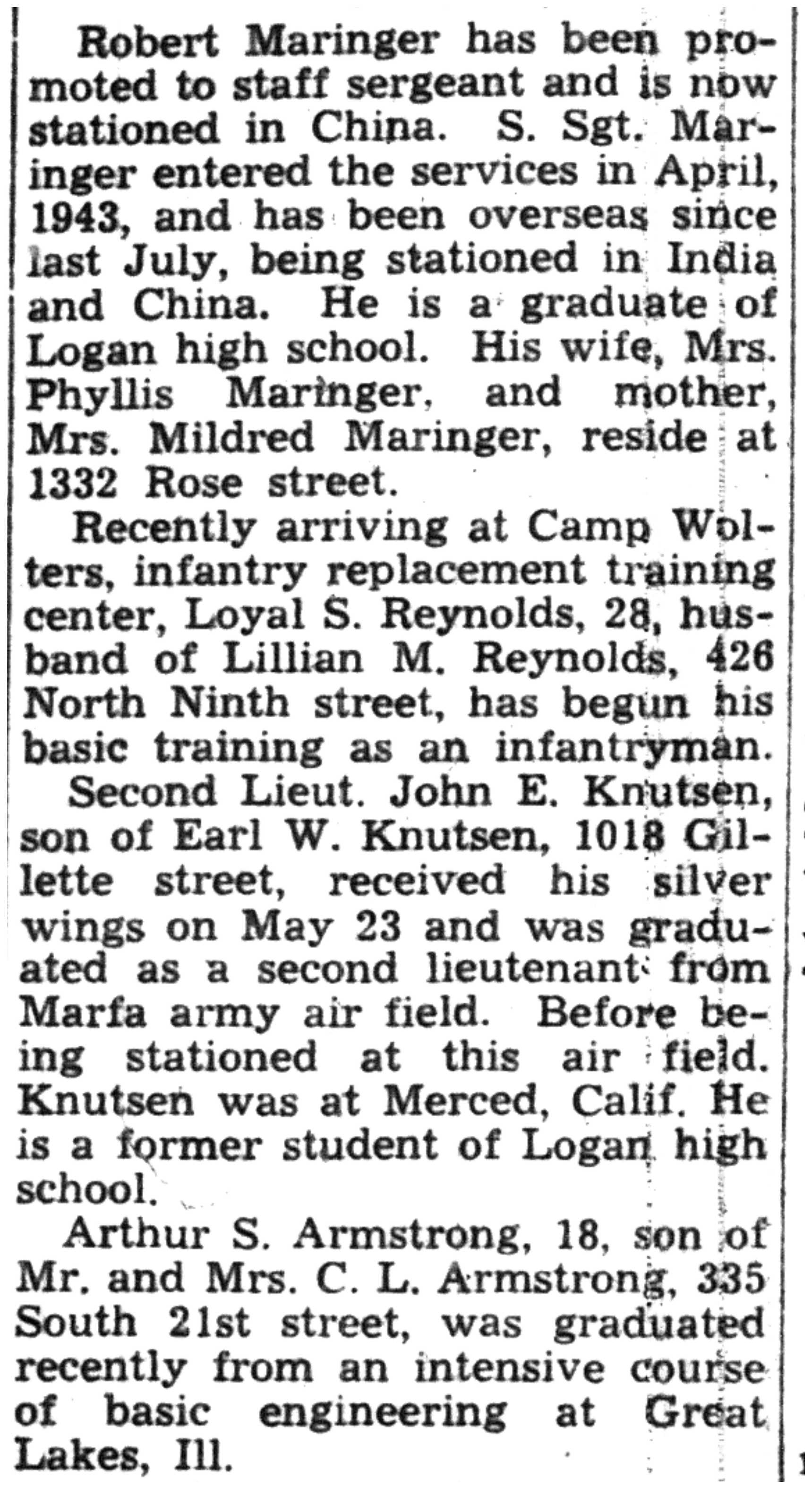 Robert Maringer; Loyal Reynolds; John Knutsen; Arthur Armstrong |