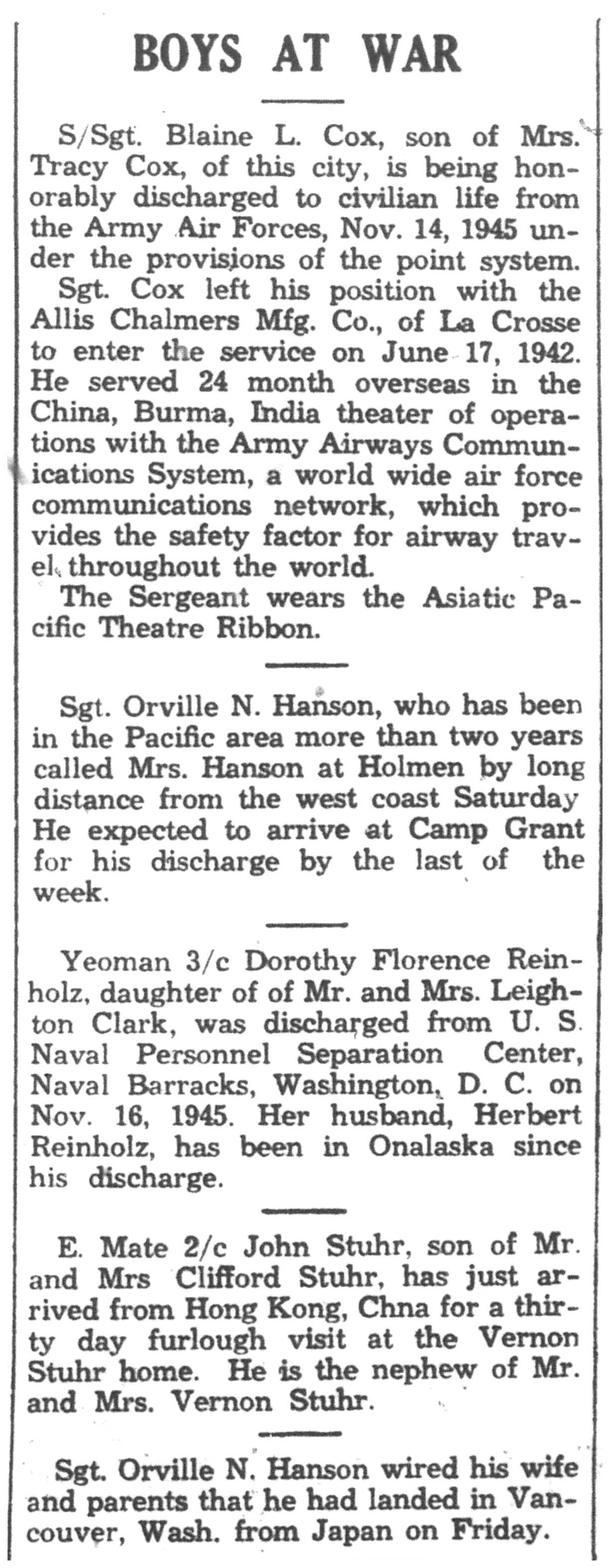 | 1945-11-8 | La Crosse Tribune p17 |