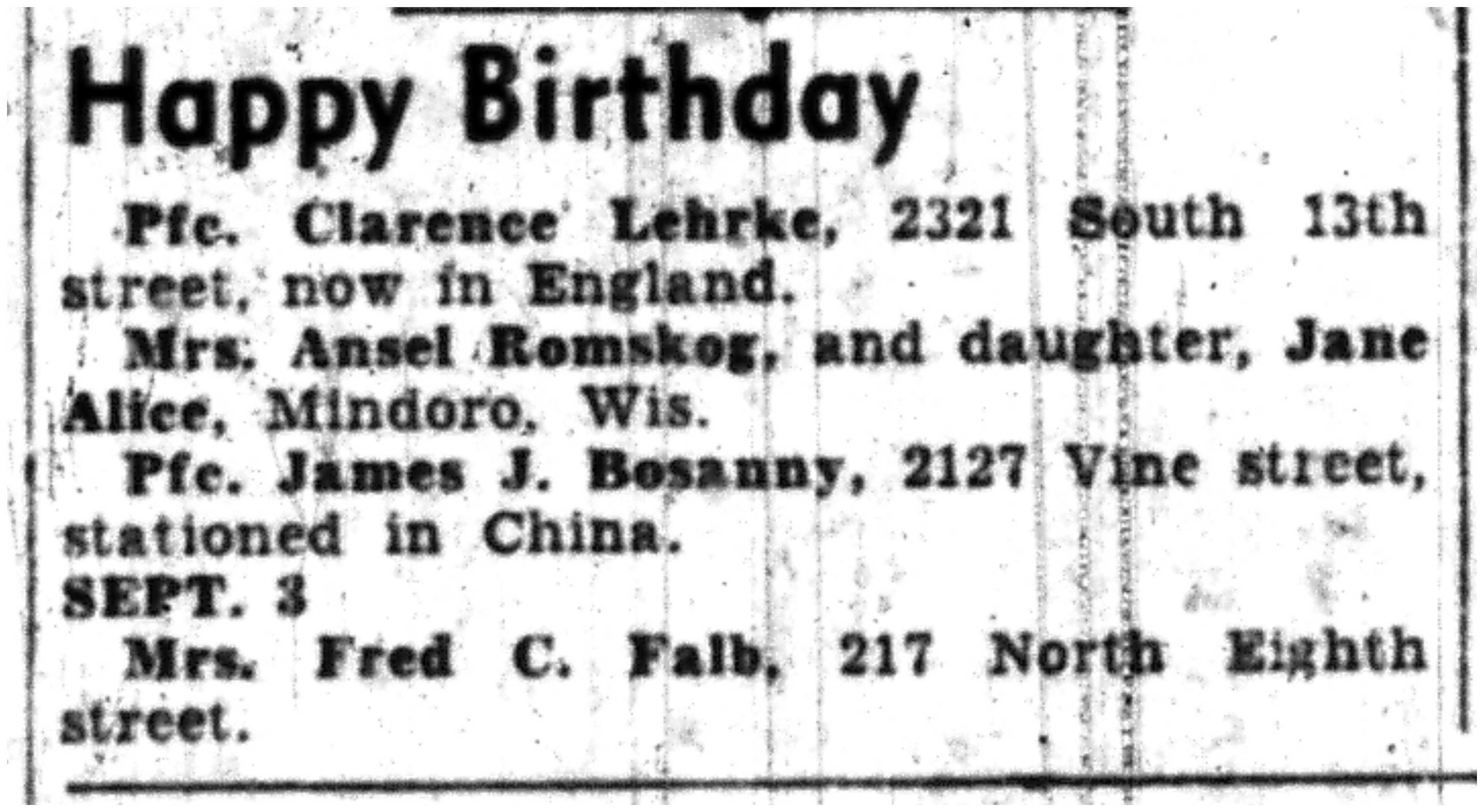 | 1945-9-9 | La Crosse Tribune p3 | |