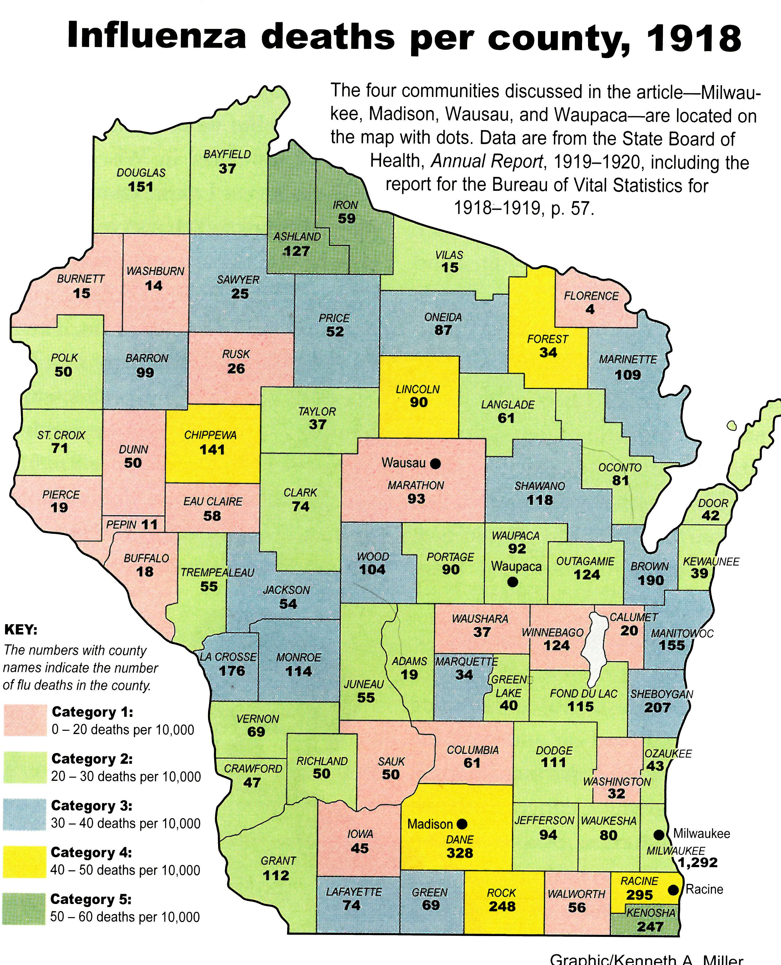 The total number of cases in Wisconsin was estimated at 103,000 persons with 8,459 deaths or about 7,500 more than a normal year. The state had higher mortality numbers than Michigan, Indiana or Minnesota. More Wisconsinites died during the six months of the influenza epidemic than were killed in World War I, the Korean War and the Viet Nam War combined.