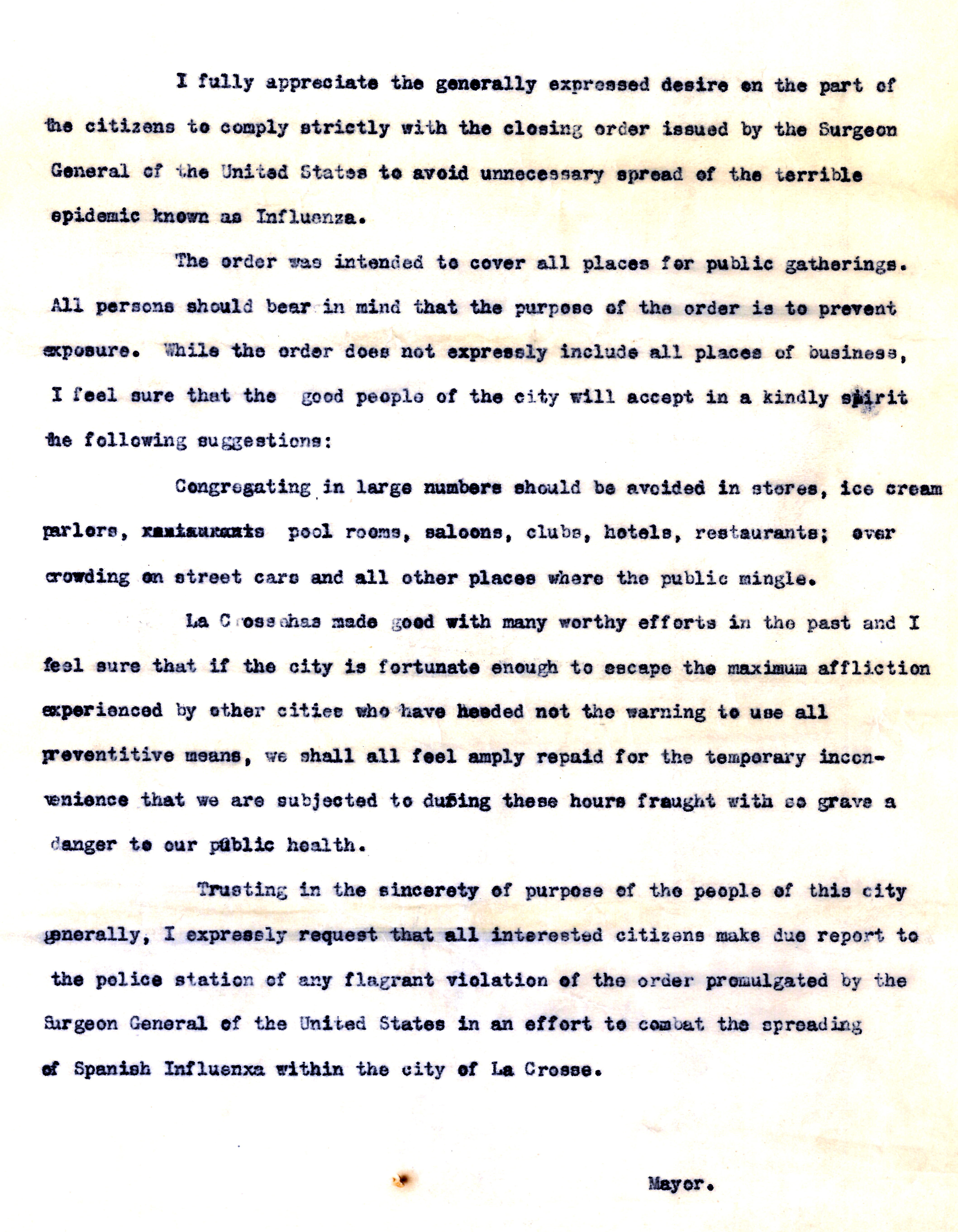 All schools, churches, theaters and other places where people congregated were locked up. Harper was following the advice of U. S. Surgeon General Rupert Blue but his wording in the communication was not a mandate but an “advisory order” to the local health officers, local boards of health, and city councils. La Crosse sprang into quick compliance, although not without discussion and controversy. Wausau, unfortunately, did not heed the order as quickly and suffered tremendous adversity as a result.