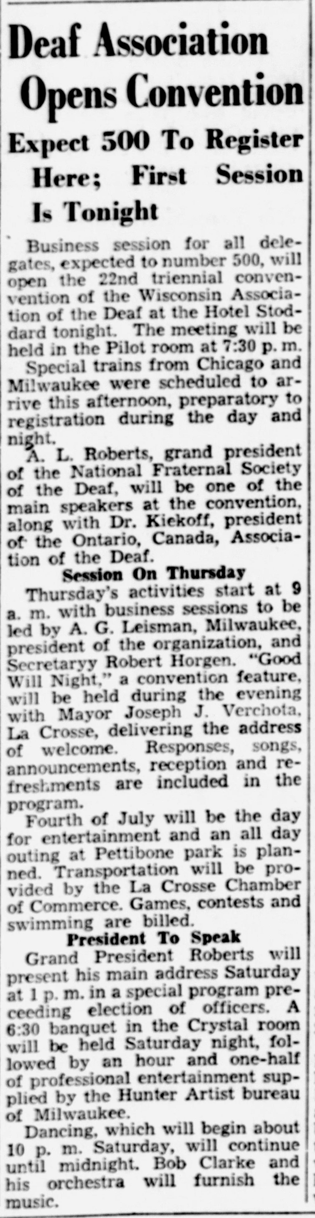 Sign language was, and still is, a key component of deaf culture. While students may not have been allowed/encouraged to use sign language at school, there are signs that there was a thriving deaf culture in early 20th century La Crosse. The La Crosse Deaf Mute Association met monthly at the YMCA from 1897-1909, and in 1909 the Seven Star Club for Deaf Mutes began meeting in members’ homes. Another clue that La Crosse had a thriving deaf community is that in the summer of 1901, 100 delegates from the Wisconsin Deaf Mute Association hosted their 9th annual convention in La Crosse. In 1941 the convention was once again held in La Crosse, drawing 500 delegates.