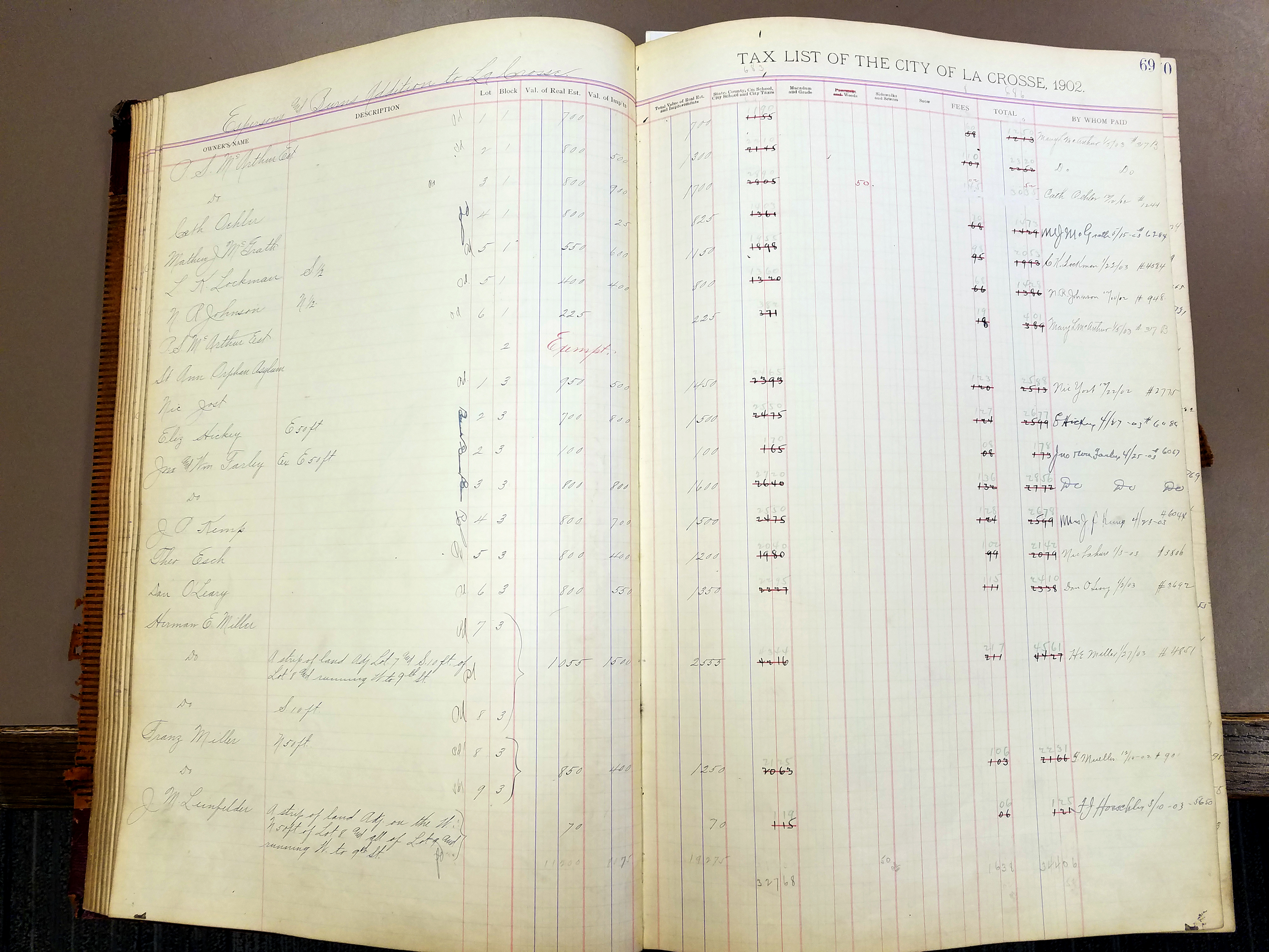 Franz Miller was listed as the owner of the three lots in the 1902 City of La Crosse tax ledger. This ledger also lists the odd strip of land, and listed Joseph Leinfelder as the owner (though deceased). Hoeschler paid the taxes owed on the strip of land, and signed the book on the following page (click image to see full photograph). Photo by Dave Kranz.