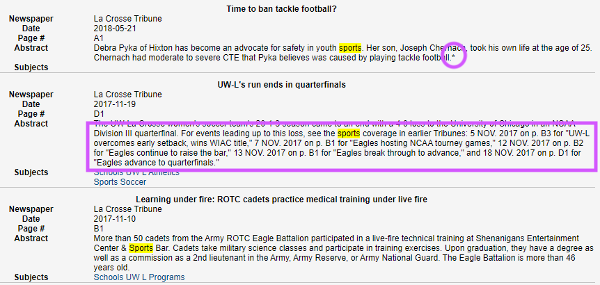 This shows three of the results when sport* is the search term. Note that some articles are not assigned a subject heading while others can have more than one subject heading. Click for bigger view.