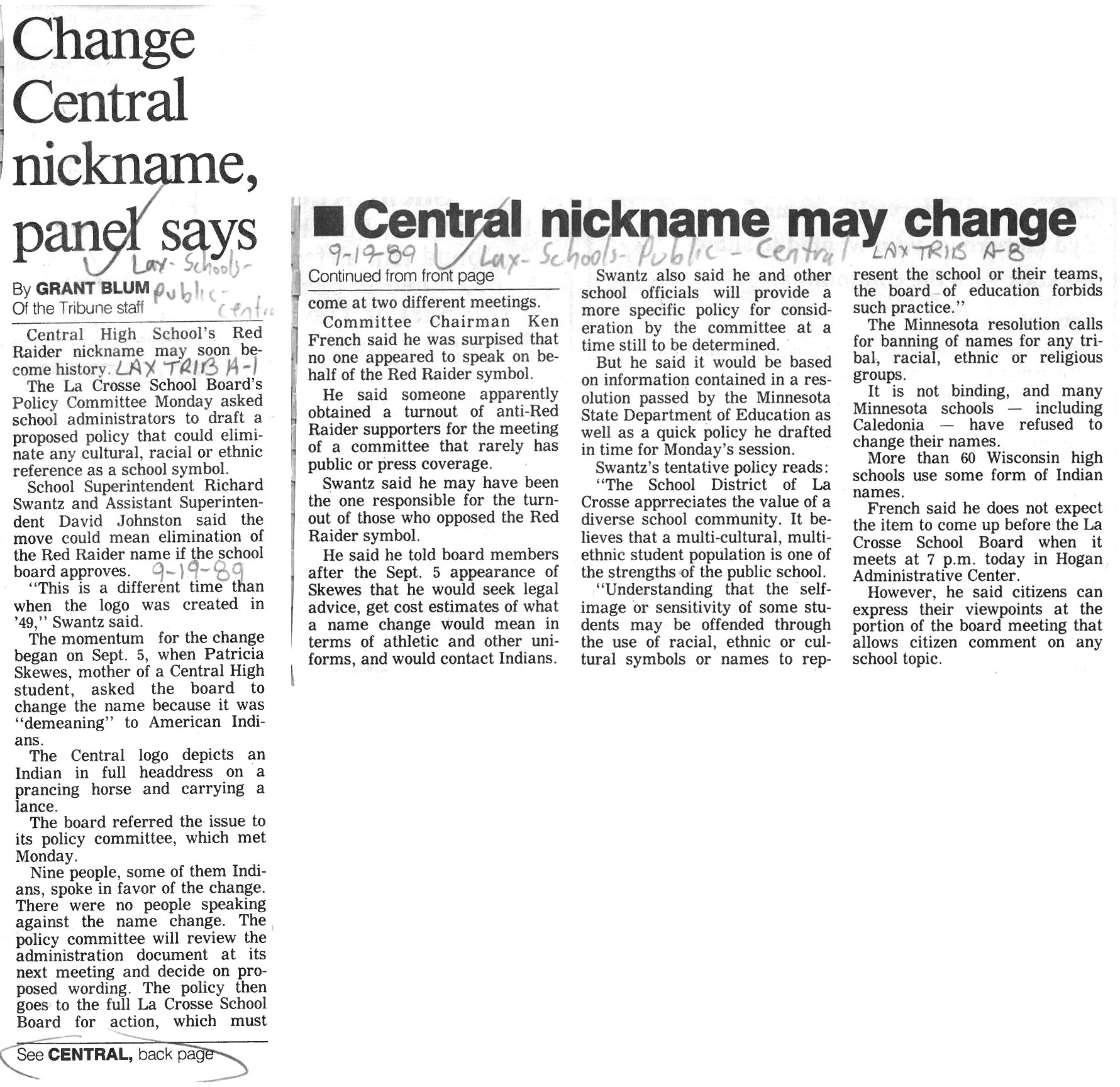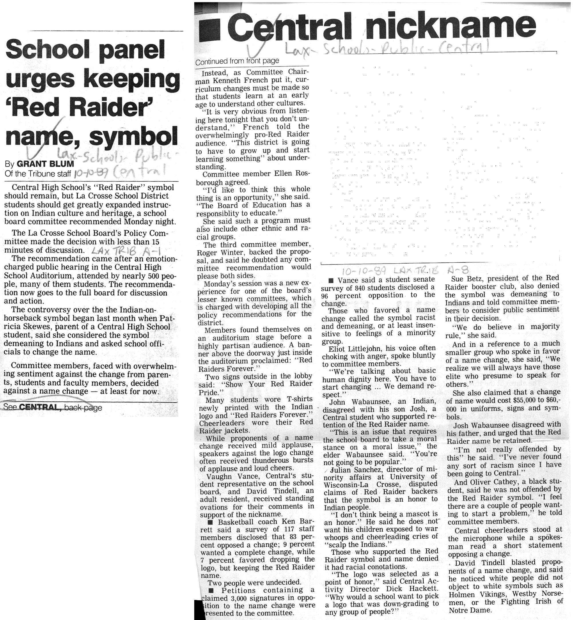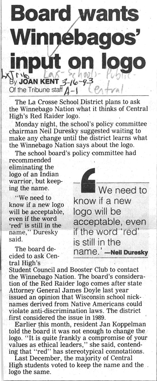 Central High School's longtime athletic teams logo and mascot - the Red Raiders - began being questioned as cultural appropriation in the late 1980s. Various levels of discussion and consideration of change happened into the early 1990s. In 1993, a firm decision to change the logo but to keep the name held until 2021, when the name was changed to RiverHawks.