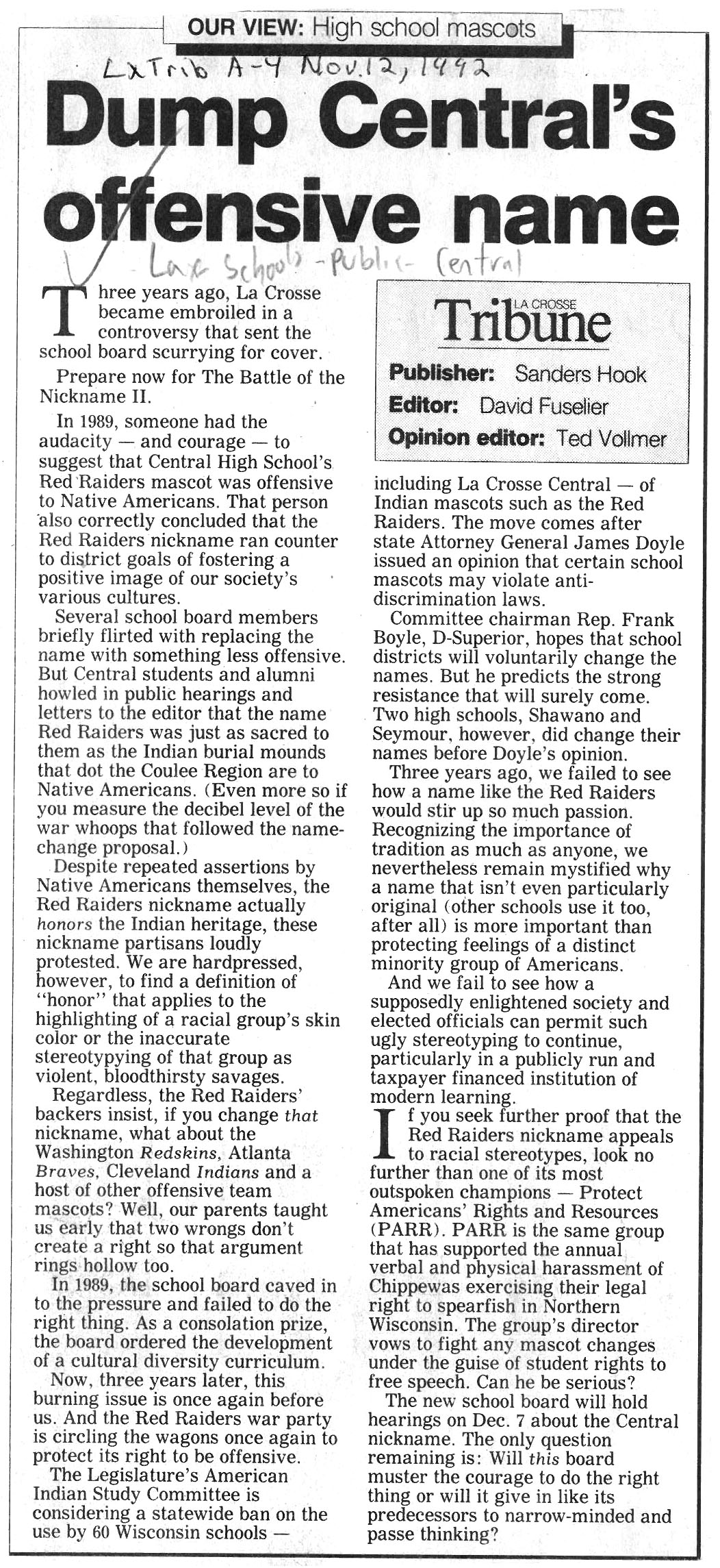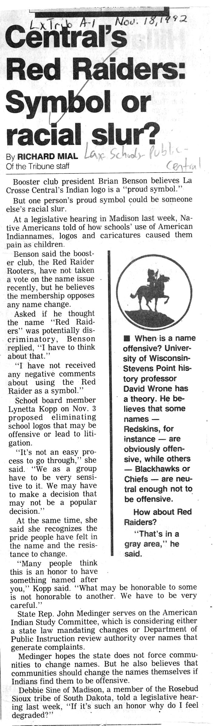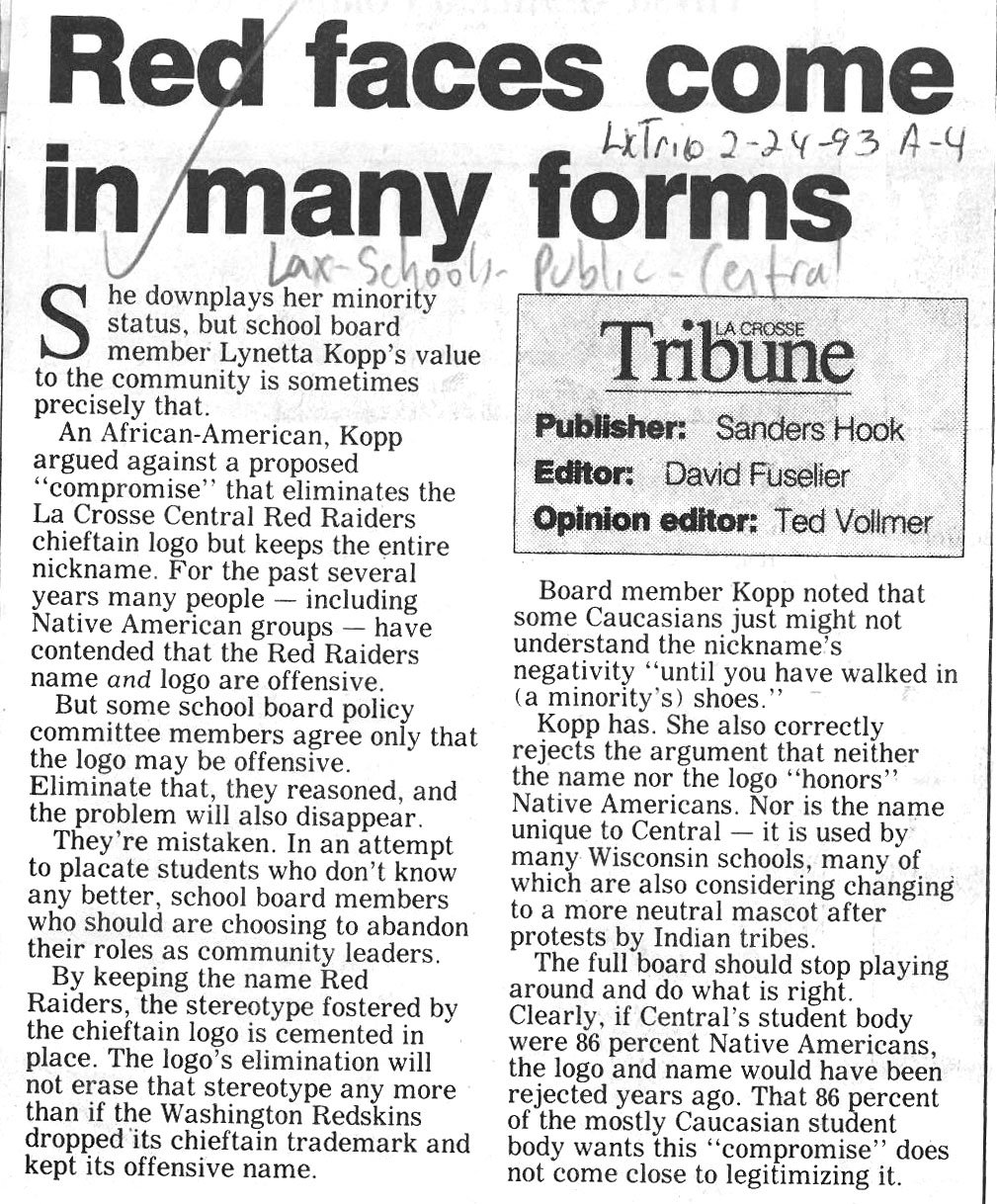 Central High School's longtime athletic teams logo and mascot - the Red Raiders - began being questioned as cultural appropriation in the late 1980s. Various levels of discussion and consideration of change happened into the early 1990s. In 1993, a firm decision to change the logo but to keep the name held until 2021, when the name was changed to RiverHawks.