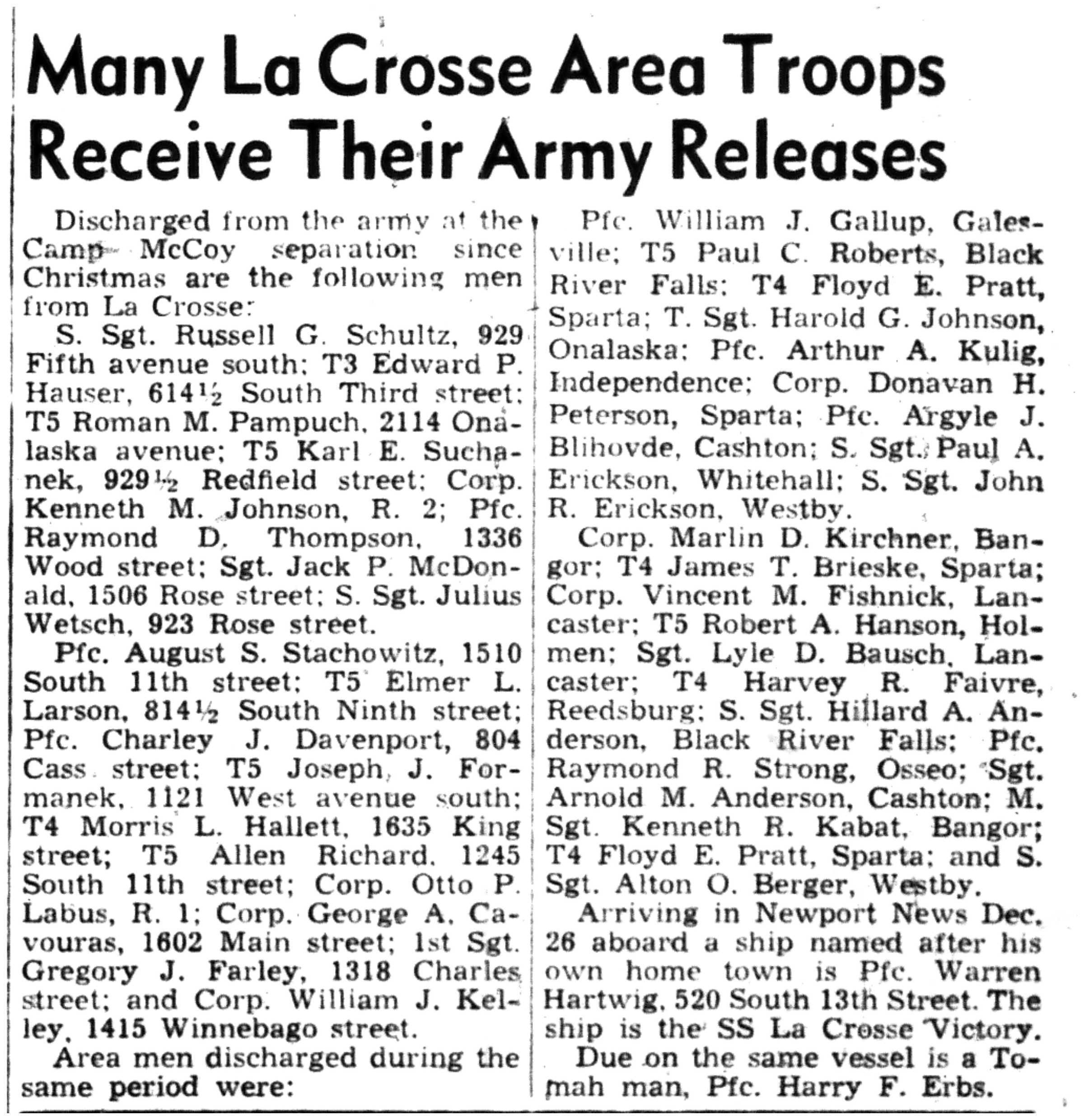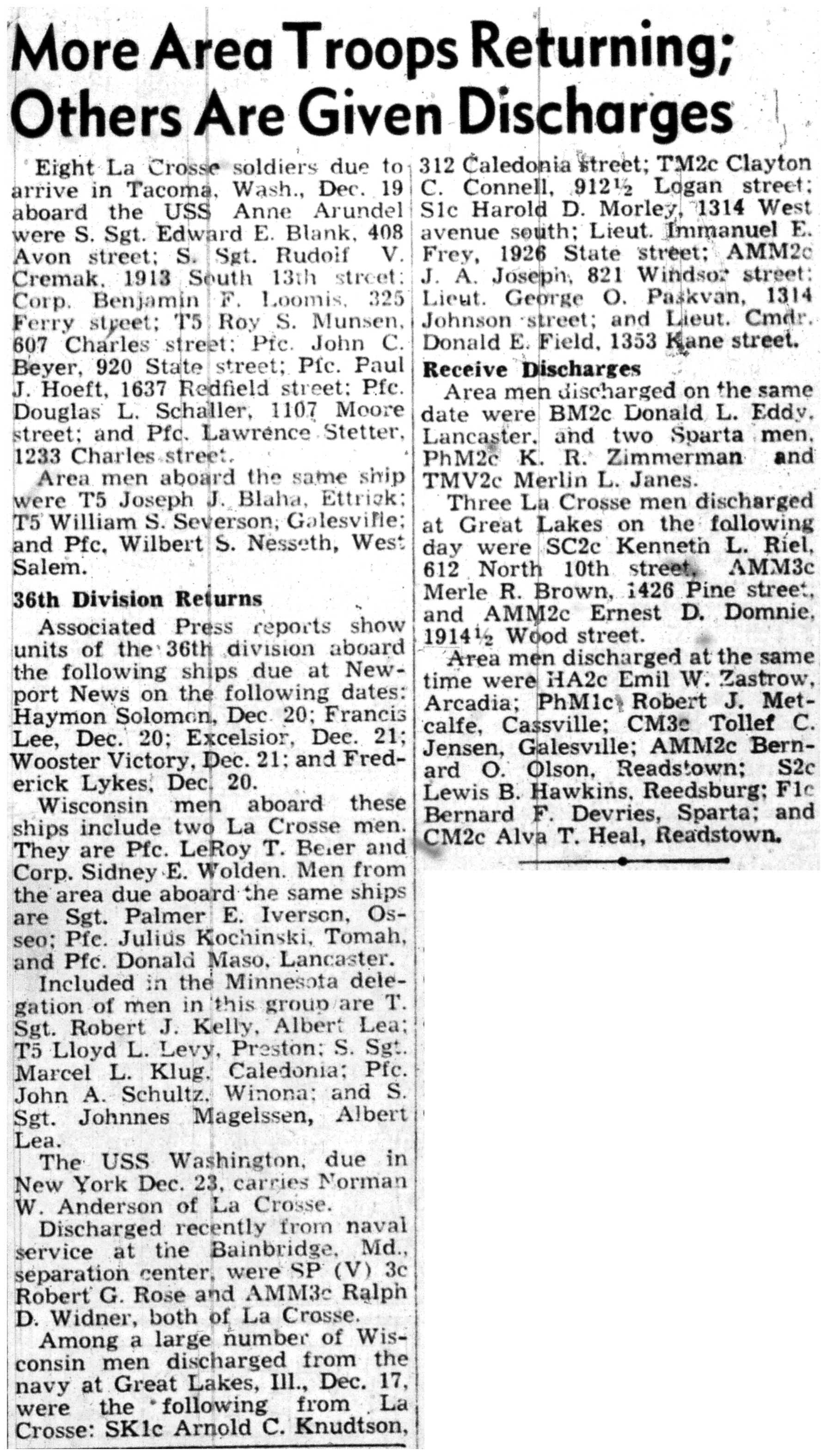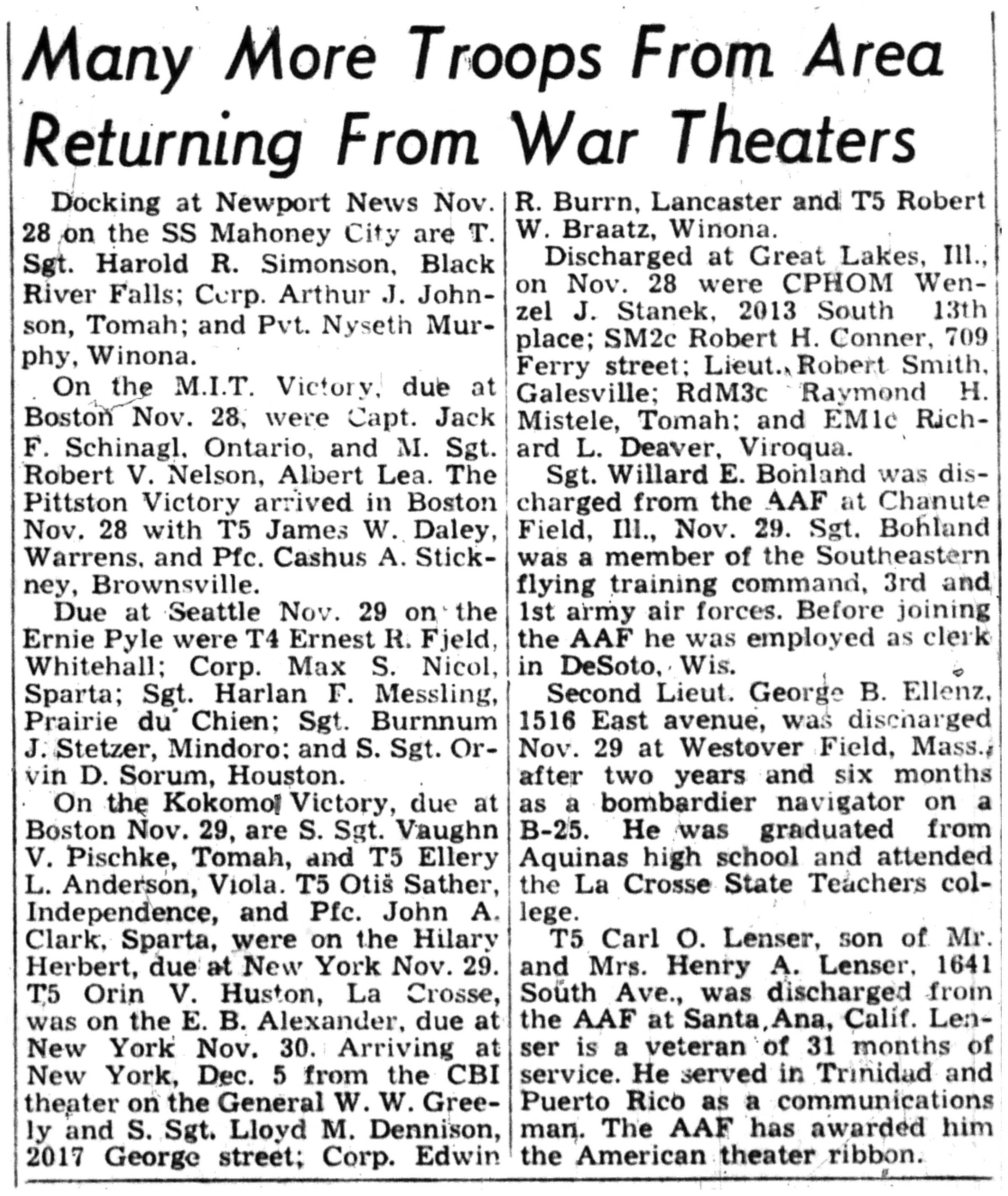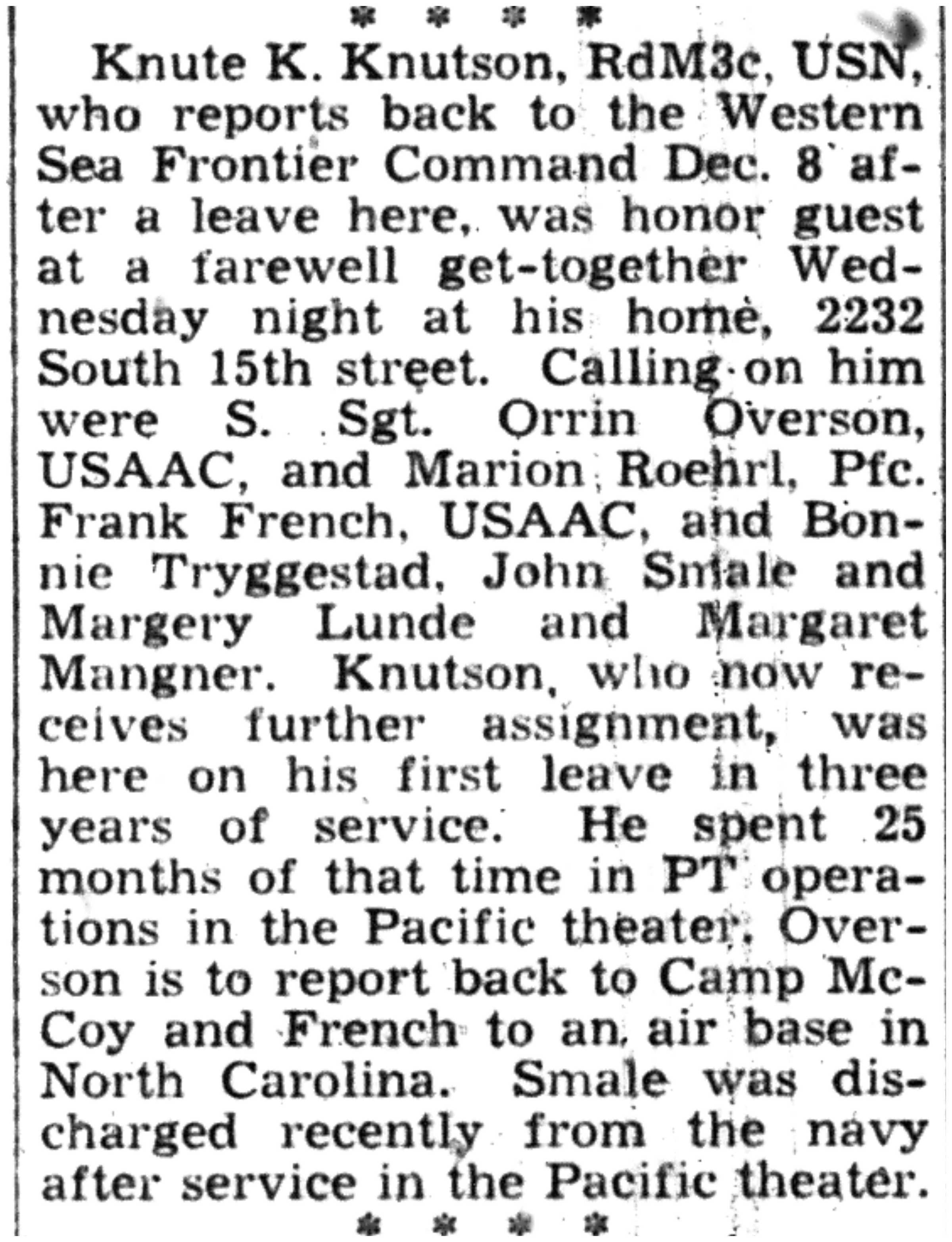 Albert Danhoff, Carl Bledsoe, Donald Payne, Thomas Pretasky, James Olsen, Robert Hengel, Erwin Korish, Walter Marshall, James Pittenger, Ervin Crogin, Burten Veglahn, LaVern Robinson, Virgil Sheean, Robert Krueger, John Perry, Lloyd Thorsen, Joseph Netzer, Warren Hogan, Richard Hayes, John Bernhard, Ralph Thomasgard, Vance Shaw, Roy Teel Jr, Eugene Hunt, Chester Blades, Earl Martin