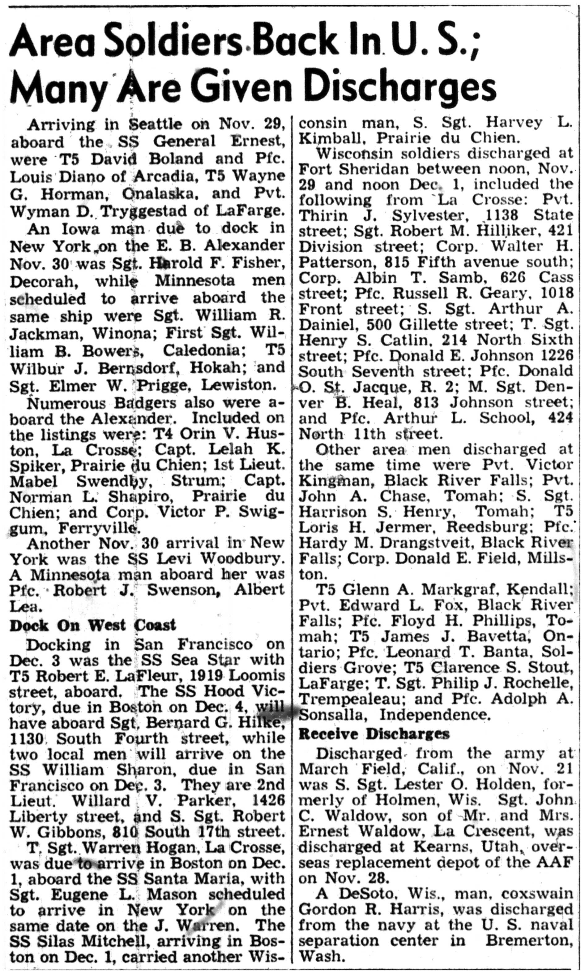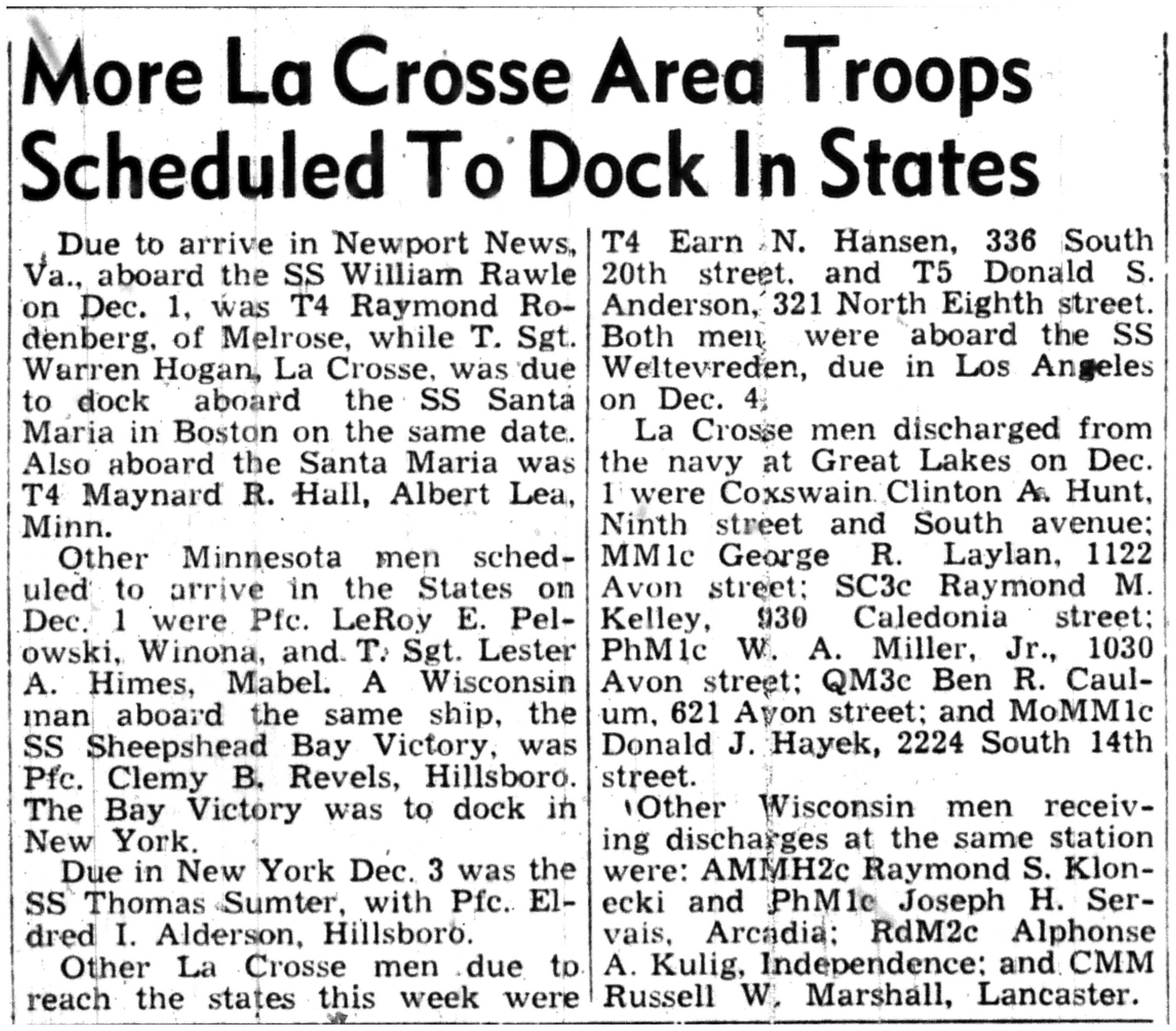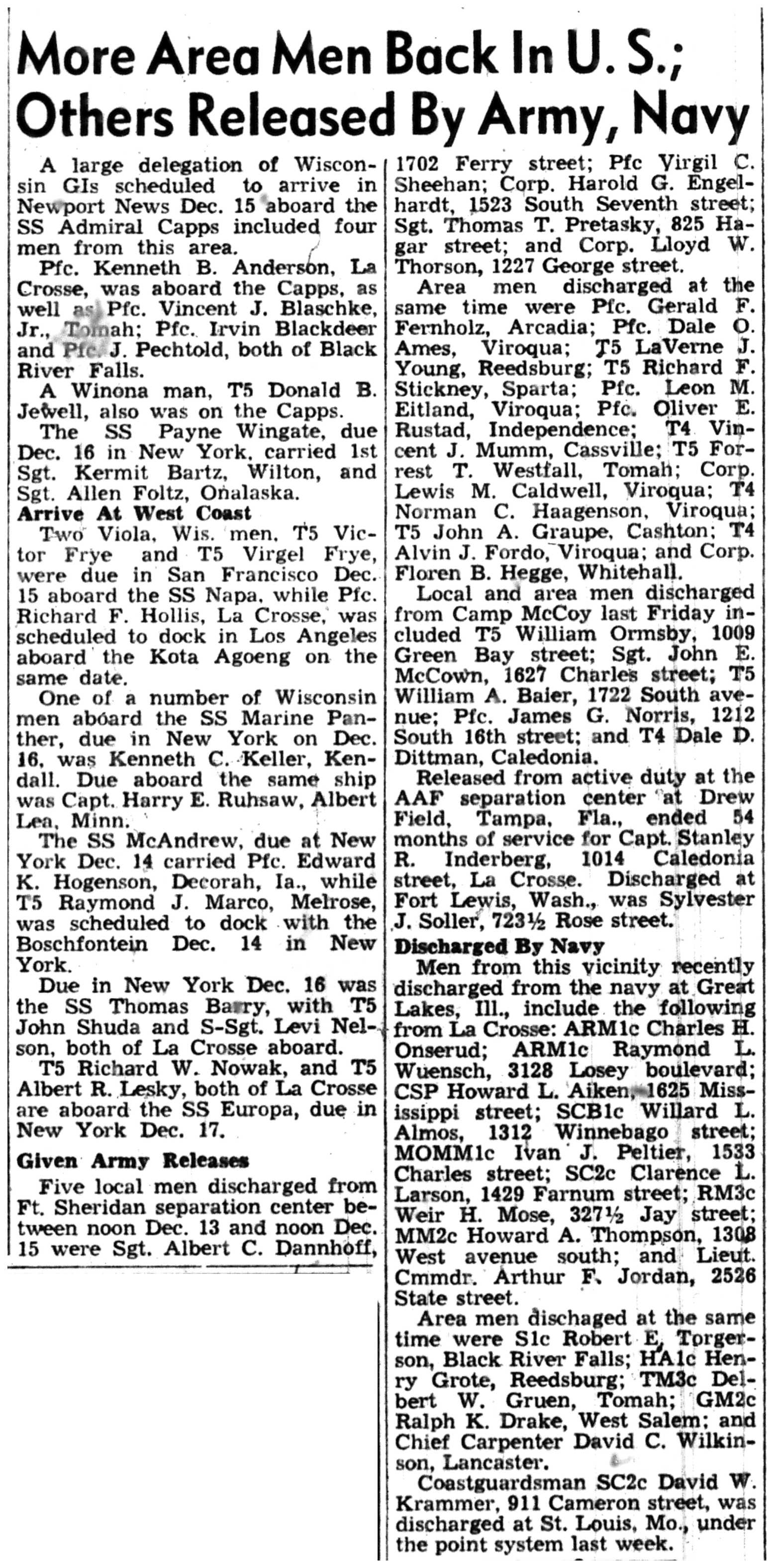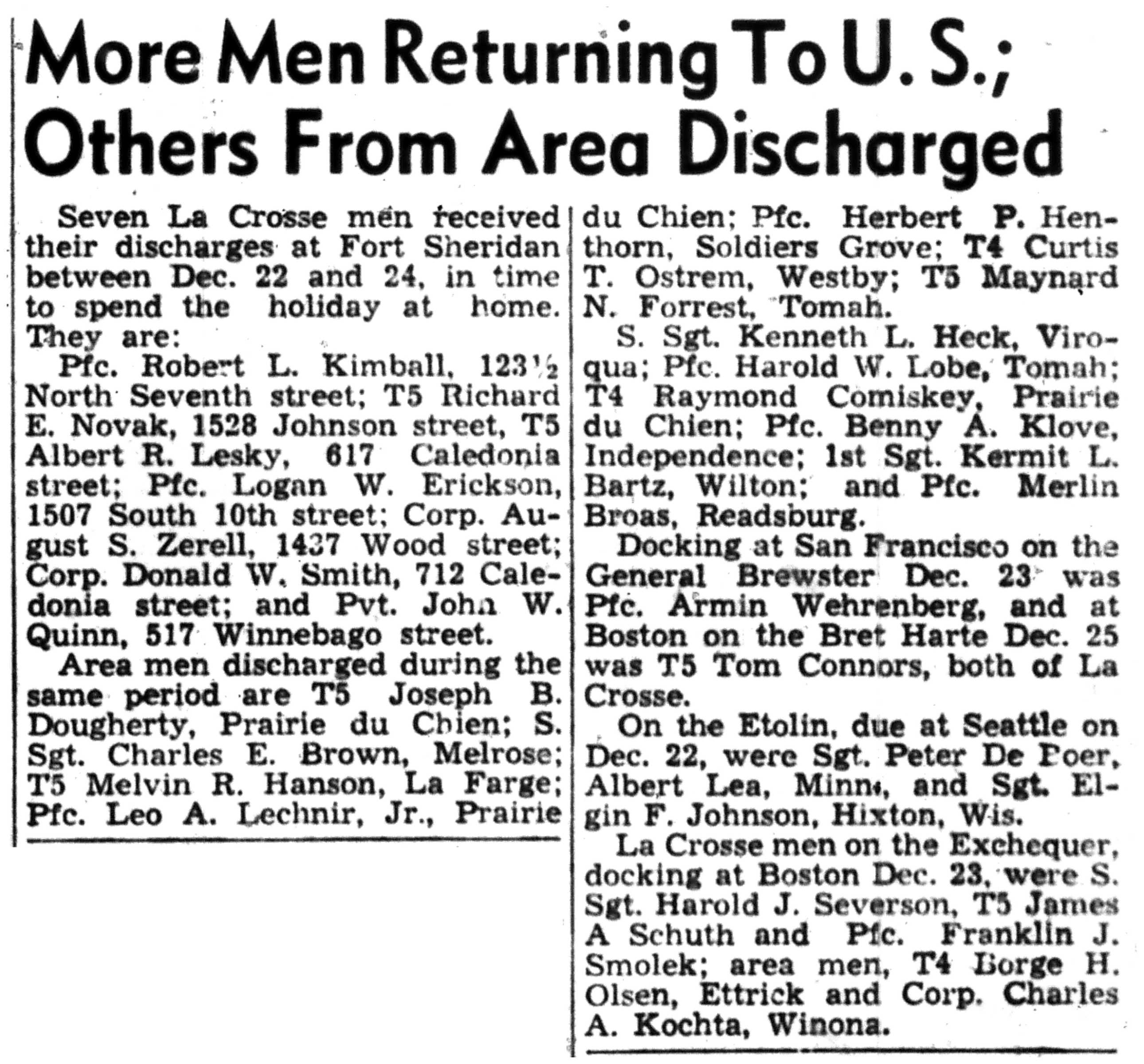 Albert Danhoff, Carl Bledsoe, Donald Payne, Thomas Pretasky, James Olsen, Robert Hengel, Erwin Korish, Walter Marshall, James Pittenger, Ervin Crogin, Burten Veglahn, LaVern Robinson, Virgil Sheean, Robert Krueger, John Perry, Lloyd Thorsen, Joseph Netzer, Warren Hogan, Richard Hayes, John Bernhard, Ralph Thomasgard, Vance Shaw, Roy Teel Jr, Eugene Hunt, Chester Blades, Earl Martin