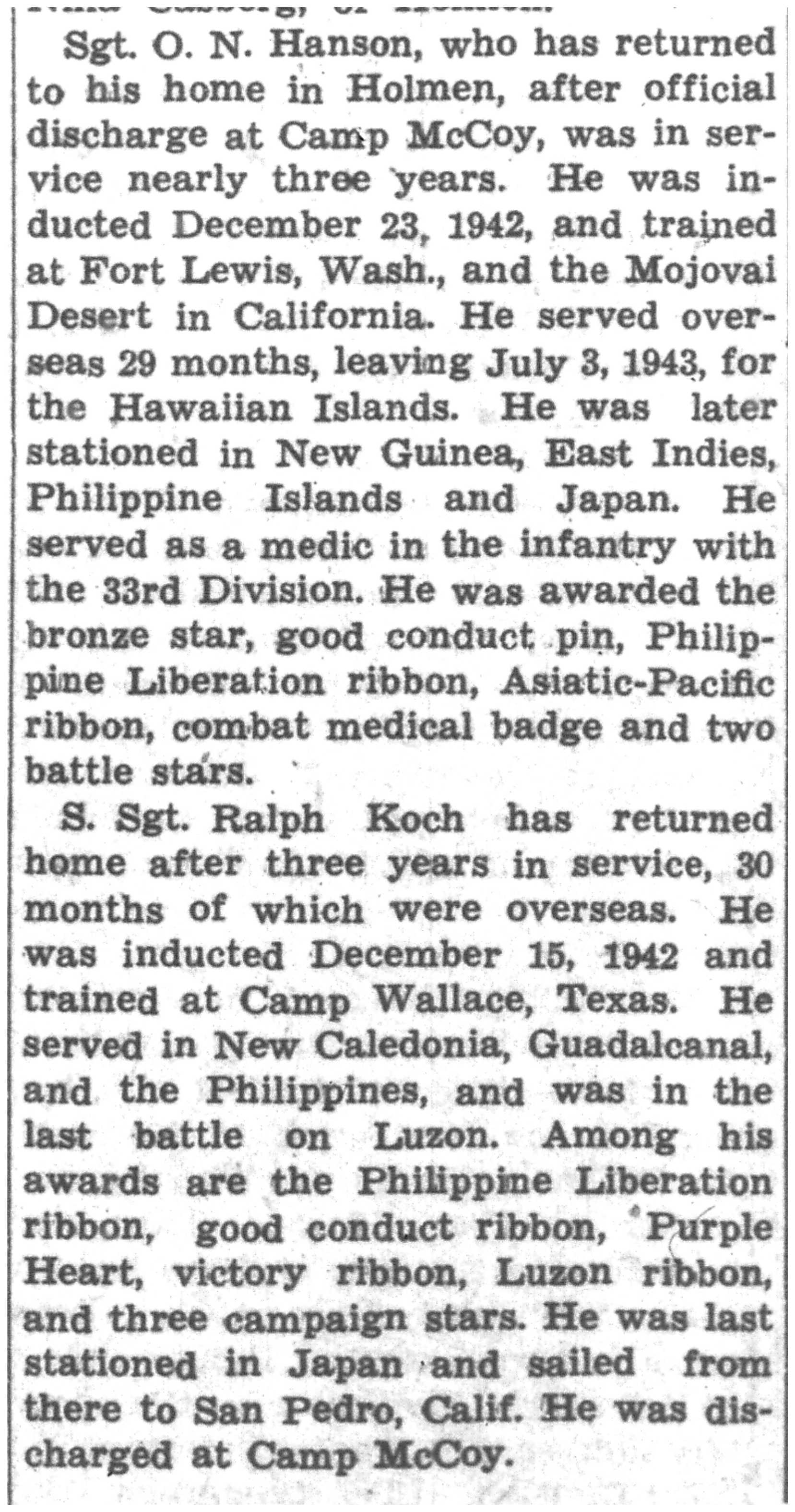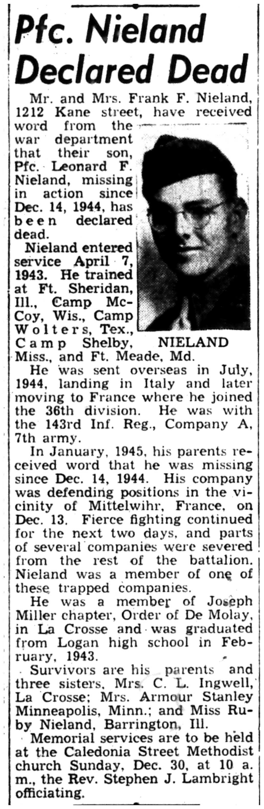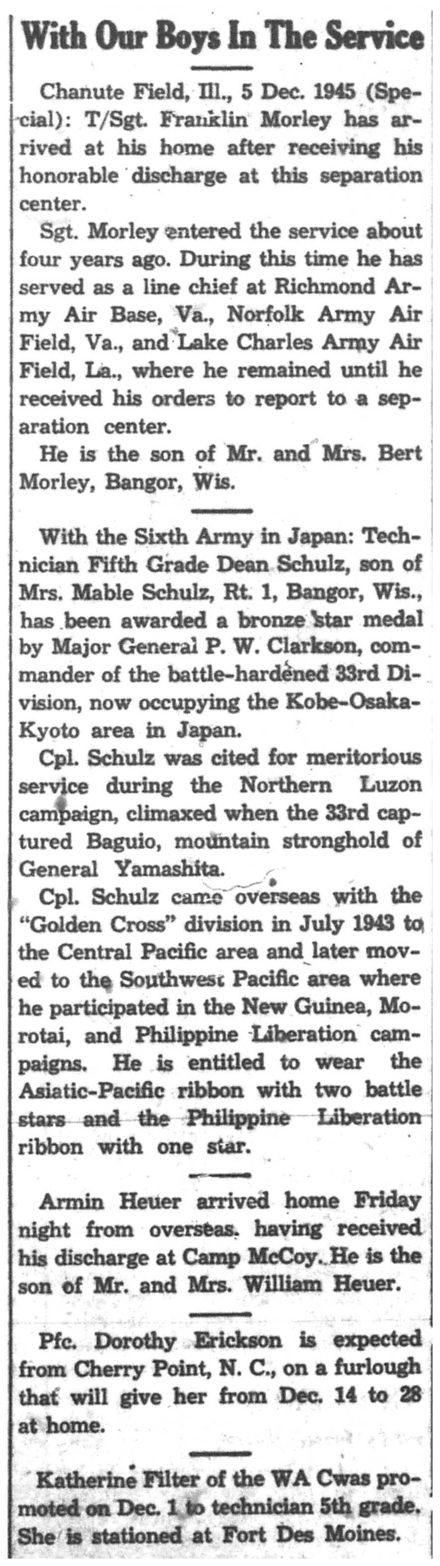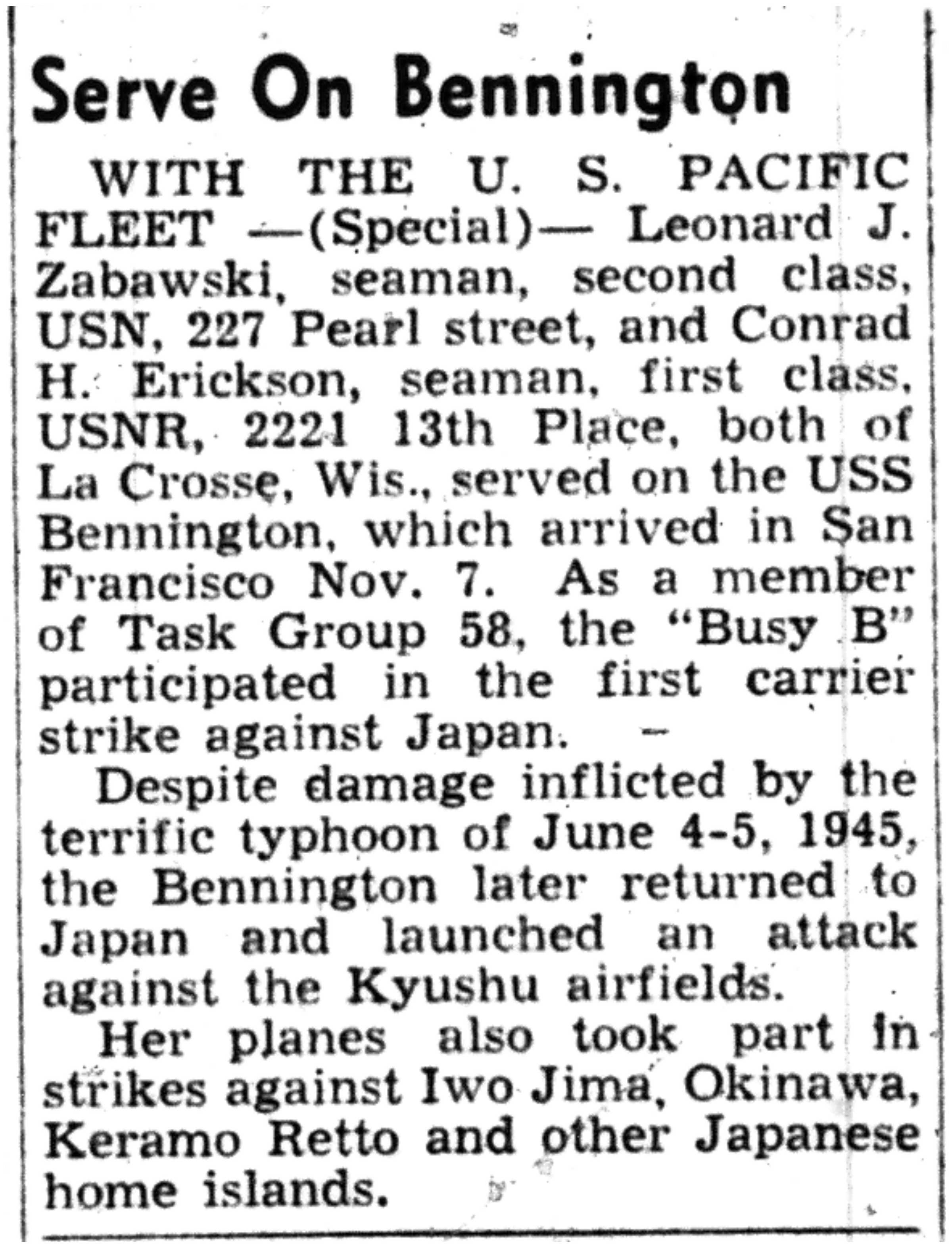 Albert Danhoff, Carl Bledsoe, Donald Payne, Thomas Pretasky, James Olsen, Robert Hengel, Erwin Korish, Walter Marshall, James Pittenger, Ervin Crogin, Burten Veglahn, LaVern Robinson, Virgil Sheean, Robert Krueger, John Perry, Lloyd Thorsen, Joseph Netzer, Warren Hogan, Richard Hayes, John Bernhard, Ralph Thomasgard, Vance Shaw, Roy Teel Jr, Eugene Hunt, Chester Blades, Earl Martin