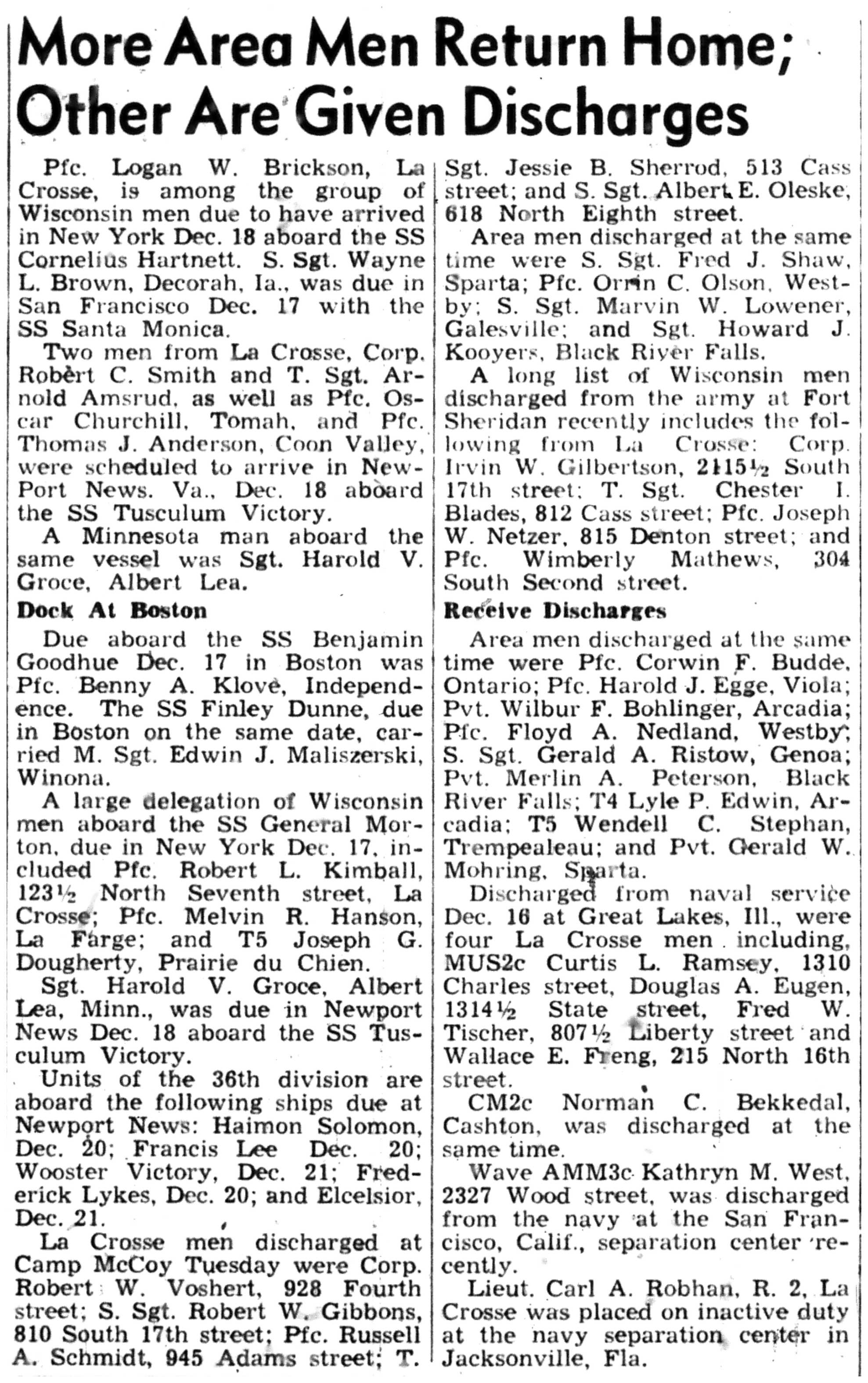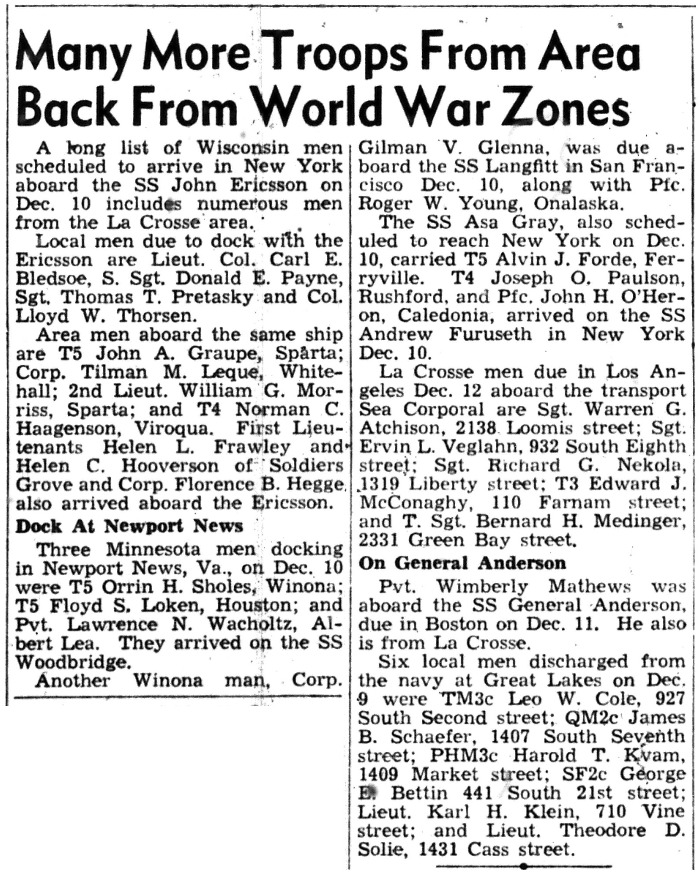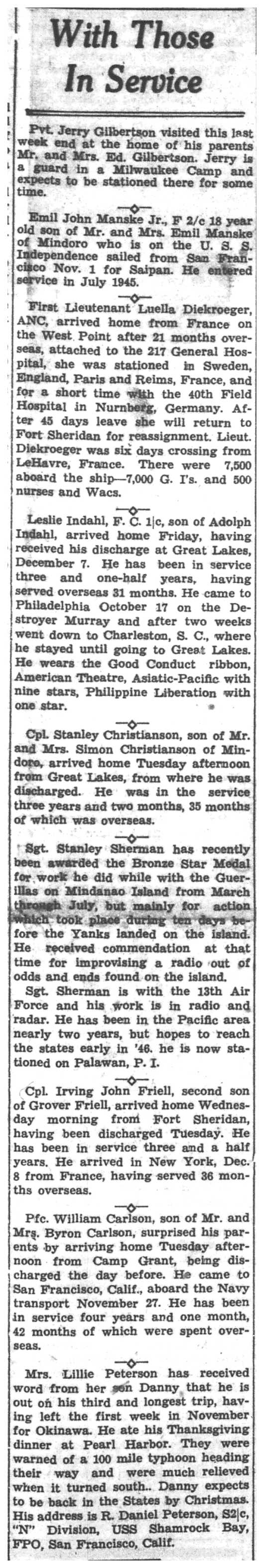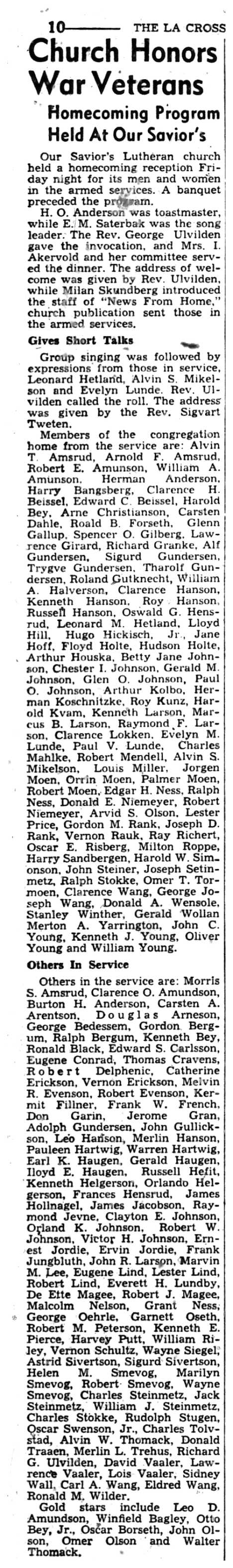Arthur Kolbo, Herman Koschnitzke, Roy Kunz, Harold Kvam, Kenneth Larson, Marcus Larson, Raymond Larson, Clarence Lokken, Evelyn Lunde, Charles Mahlke, Robert Mendell, Alvin Mikelson, Louis Miller, Charles & Jack & William Steinmetz, Charles Stokke, Rudolph Stugen, Oscar Swenson Jr., Charles Tolvstad, Alvin Thomack, Donald Traaen, Merlin Trehus, Richard Ulvilden, David & Lawrence & Lois Vaaler, Sidney Wall, Carl & Eldred Wang, Ronald Wilder, Edward Carlsson, Eugene Conrad, Thomas Cravens, Robert Delphenic, Catherine Erickson, Vernon Erickson, Melvin Evenson, Robert Evenson, Kermit Fillner, Frank French, Don Garin, Jerome Gran, Adolph Gundersen, Glenn Gallup, Spencer Gilberg, Lawrence Girard, Richard Granke, Alf & Sigurd & Trygve & Tharolf Gundersen, Roland Gutknecht, William Halvorson, Clarence Hanson, Kenneth Hanson, Roy Hanson, Russell Hanson, Harry Sandbergen, Harold Simonson, John Steiner, Joseph Setinmetz, Ralph Stokke, Omer Tormoen, Clarence Wang, George Wang, Donald Wensole, Stanley Winther, Gerald Wollan, Merton Yarrington, James Jacobson, Raymond Jevne, Clayton Johnson, Orland Johnson, Robert Johnson, Victor Johnson, Ernest Jordie, Ervin Jordie, Frank Jungbluth, John Larson, Marvin Lee, Eugene Lind, John & Kenneth & Oliver & William Young, Morris Amsrud, Clarence Amundson, Burton Anderson, Carsten Arentson, Douglas Arneson, George Bedessem, Gordon & Ralph Bergum, Kenneth Bey, Ronald Black, Edward Carlsson, John Gullickson, Leo Hanson, Merlin Hanson, Pauleen Hartwig, Warren Hartwig, Earl Haugen, Gerald Haugen, Lloyd Haugen, Russell Hefit, Kenneth Helgerson, Orlando Helgerson, Frances Hensrud, James Hollnagel, Jorgen & Orrin & Palmer & Robert Moen, Edgar Ness, Ralph Ness, Donald Niemeyer, Robert Niemeyer, Arvid Olson, Lester Price, Gordon Rank, Vernon Rauk, Ray Richert, Oscar Risberg, Milton Roppe, Leo Amundson, Winfield Bagley, Otto Bey Jr., Oscar Borseth, John Olson, Omer Olson, Walter Thomack, Leonard Hetland, Alvin Mikelson, Evelyn Lunde, Alvin & Arnold Amsrud, Robert & William Amunson, Herman Anderson, Harry Bangsberg, Clarence Beissel, Harold Bey, Arne Christianson, Carsten Dahle, Roald Forseth, Lester Lind, Robert Lind, Everett Lundby, De Ette Magee, Robert Magee, Malcolm Nelson, Grant Ness, George Oehrle, Garnett Oseth, Oswald Hensrud, Leonard Hetland, Lloyd Hill, Hugo Hickisch Jr., Jane Hoff, Floyd Holte, Hudson Holte, Arthur Houska, Betty Johnson, Chester Johnson, Gerald Johnson, Glen Johnson, Paul Johnson, Robert Peterson, Kenneth Pierce, Harvey Putt, William Riley, Vernon Schultz, Wayne Siegel, Astrid Sivertson, Sigurd Sivertson, Helen & Marilyn & Robert & Wayne Smevog