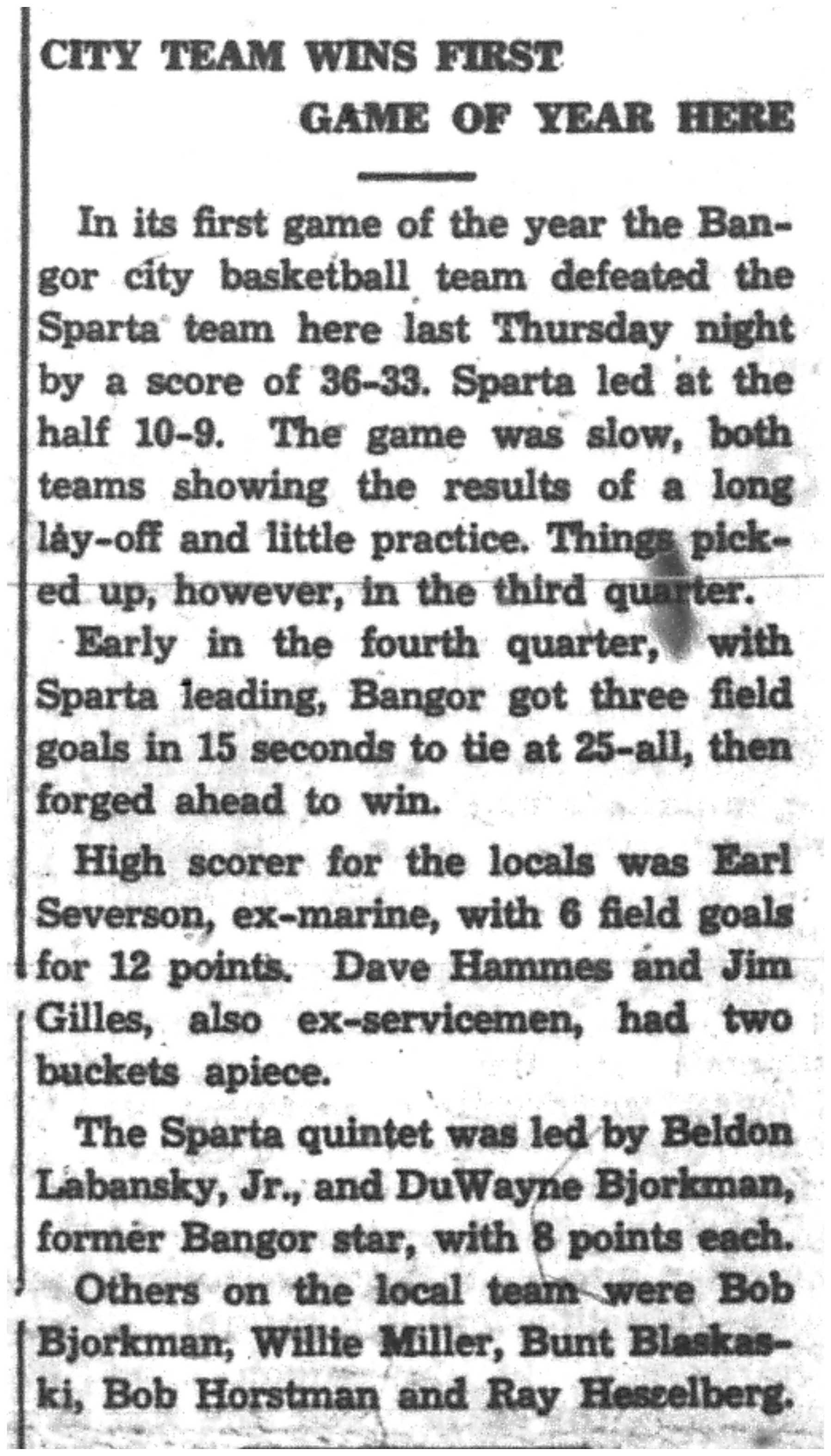 Albin Samb, Russell Geary, Arthur Daineil, Denver Heal, Arthur School, Lester Holden, Henry Catlin, Donald Johnson, Donald St. Jacque, Thirin Sylvester, Robert Hilliker, Walter Patterson, Wayne Horman, Orin Huston, Robert LaFleur, Bernard Hilke, Willard Parker, Robert Gibbons, Warren Hogan, Eugene Mason