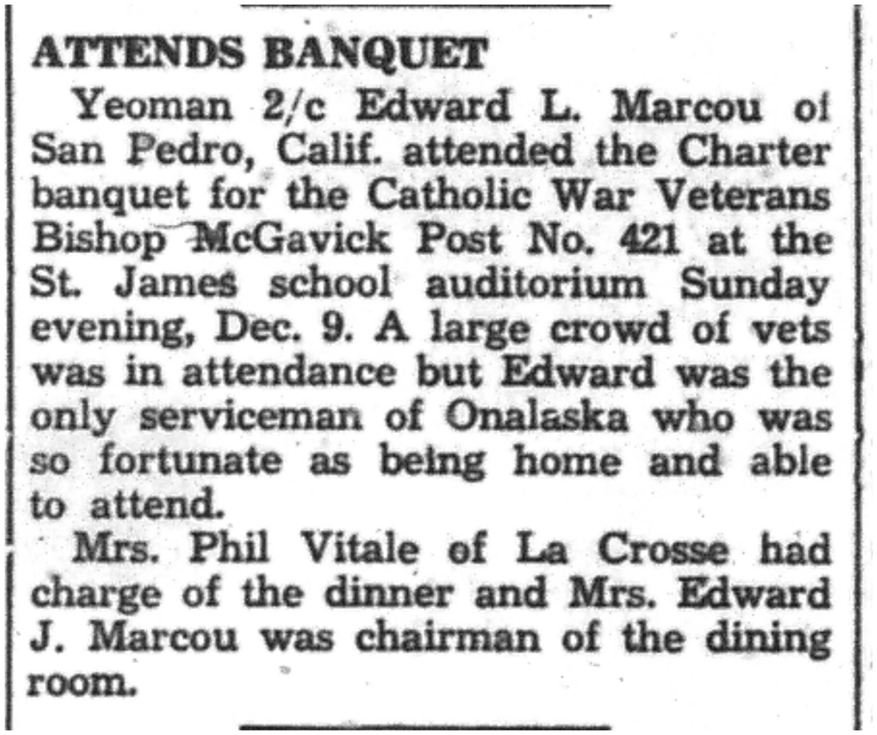 Alan O'Meara, Norman Anderson, Harold Severson, James Schuth, Franklin Smolek, Raymond Hanson, David Gianoli, Leland Steinhoff, ervin Arenz, Theodore Dusso, Francis Wegner, Roger Young, Jack Layland, Alvin Mikelson, Richard Campbell, R. K. Bright, Everett McKinney, Edward Alberts, Leslie Erickson, Rudolph Mix, Kenneth Young, Thomas Johnson, Eva Larson, Bernard Brye, Felix Wurzel, Harry Maxwell, Paul Meir, Arthur Pendleton, Victor Buschman, Leui Nelson, John Shuda, William Thompson, Kenneth Anderson, Clayton Hinkel, Marcellus Neumann, Harry Harnish, Stanley Meinert, Robert Roth, Merrill Crooker