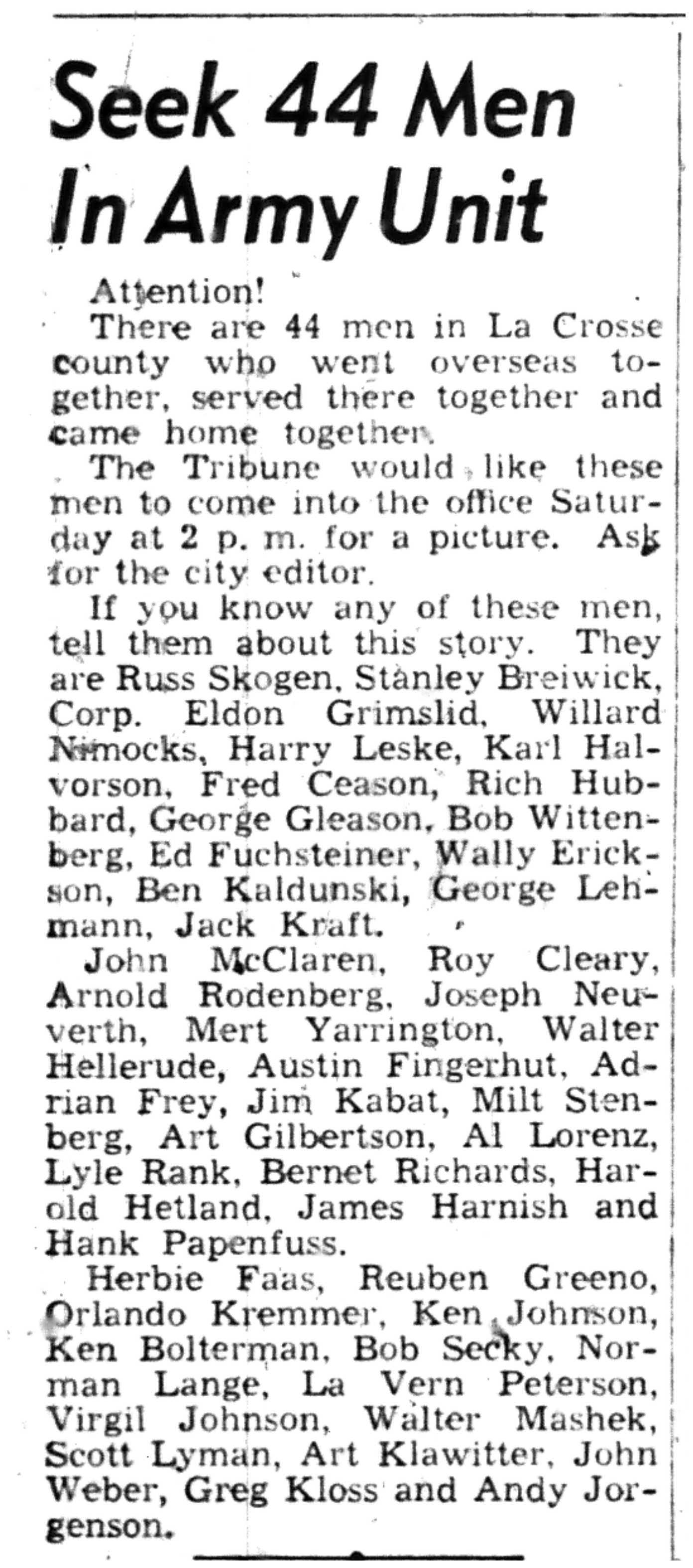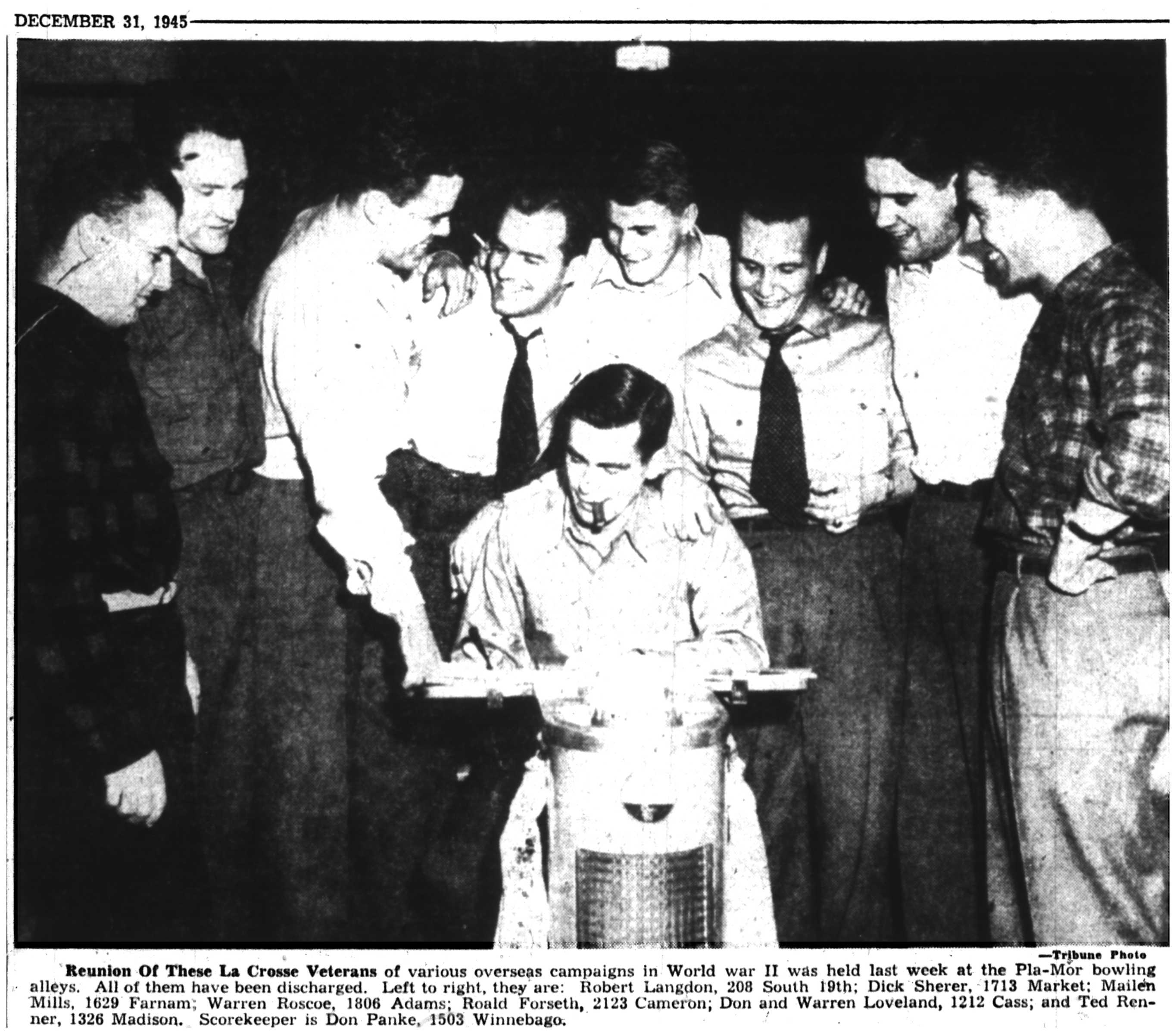 Albert Ganteri, Gerald Dellenbach, Christ Olson, Harley Kastenschmidt, Milton Gray, Jesse Schultz, Claus Nelson, Harry DeClute, Roy Scholl, Clifford Wieman, William Baier, Daniel Ebin, Curtis Lambert, Richard Bardwell, Irving Friell, Fred Rogers, Jerome Mitchell, Edward Lamke, Harold Tanke, Harry Beck, James Collough, Harold Itnyro, Stanley Sagen, John Lokken, Howard Almos, Lester Strand, Clarence Lehrke, Raymond Neururer, Robert Holtze, Robert Peterson, Francis Billock, Donald Odbest