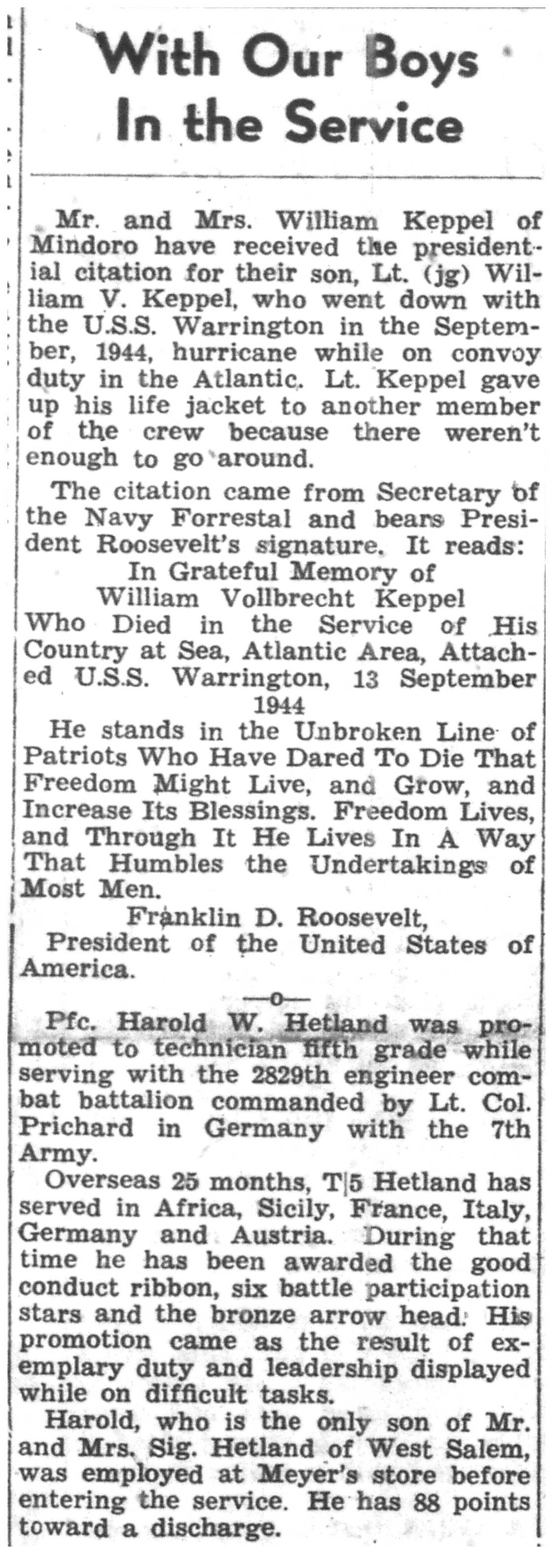 | 1945-7-8 | La Crosse Tribune p4 | |